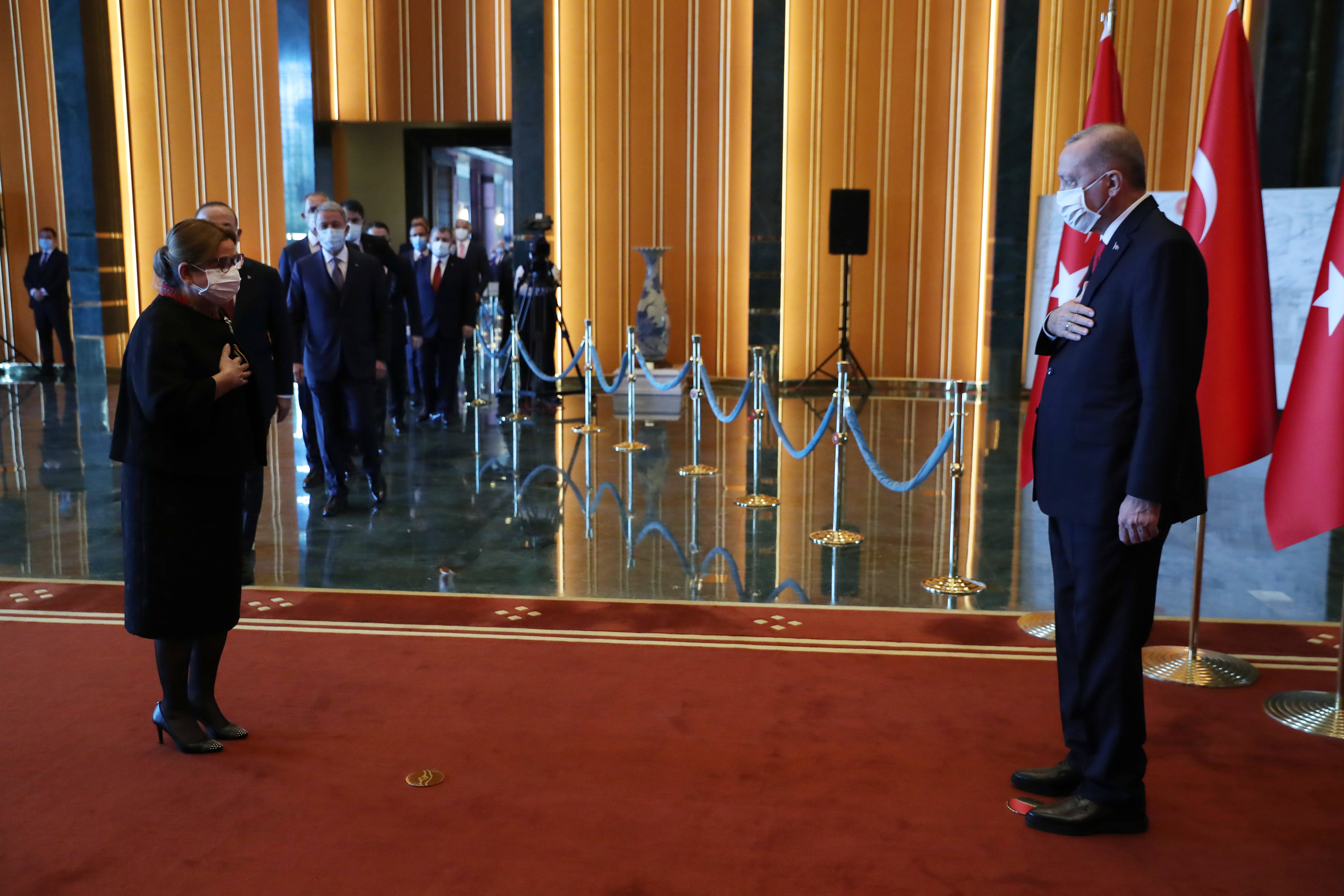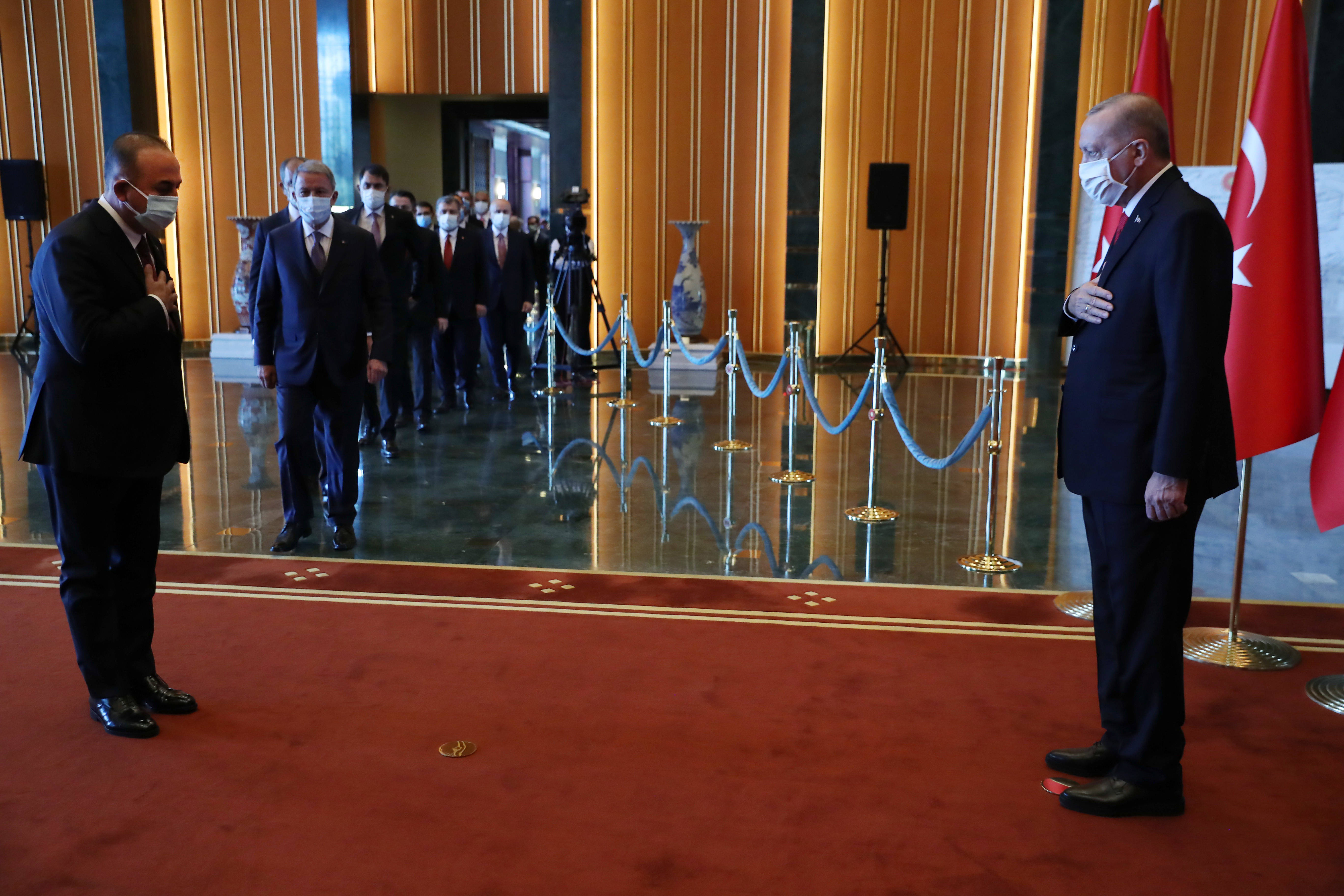 Külliyenin ana bina girişinde düzenlenen törende, davetliler, koronavirüs salgınına yönelik tedbirler çerçevesinde mesafe kuralına uygun şekilde, Cumhurbaşkanı Erdoğan'ı selamladı.