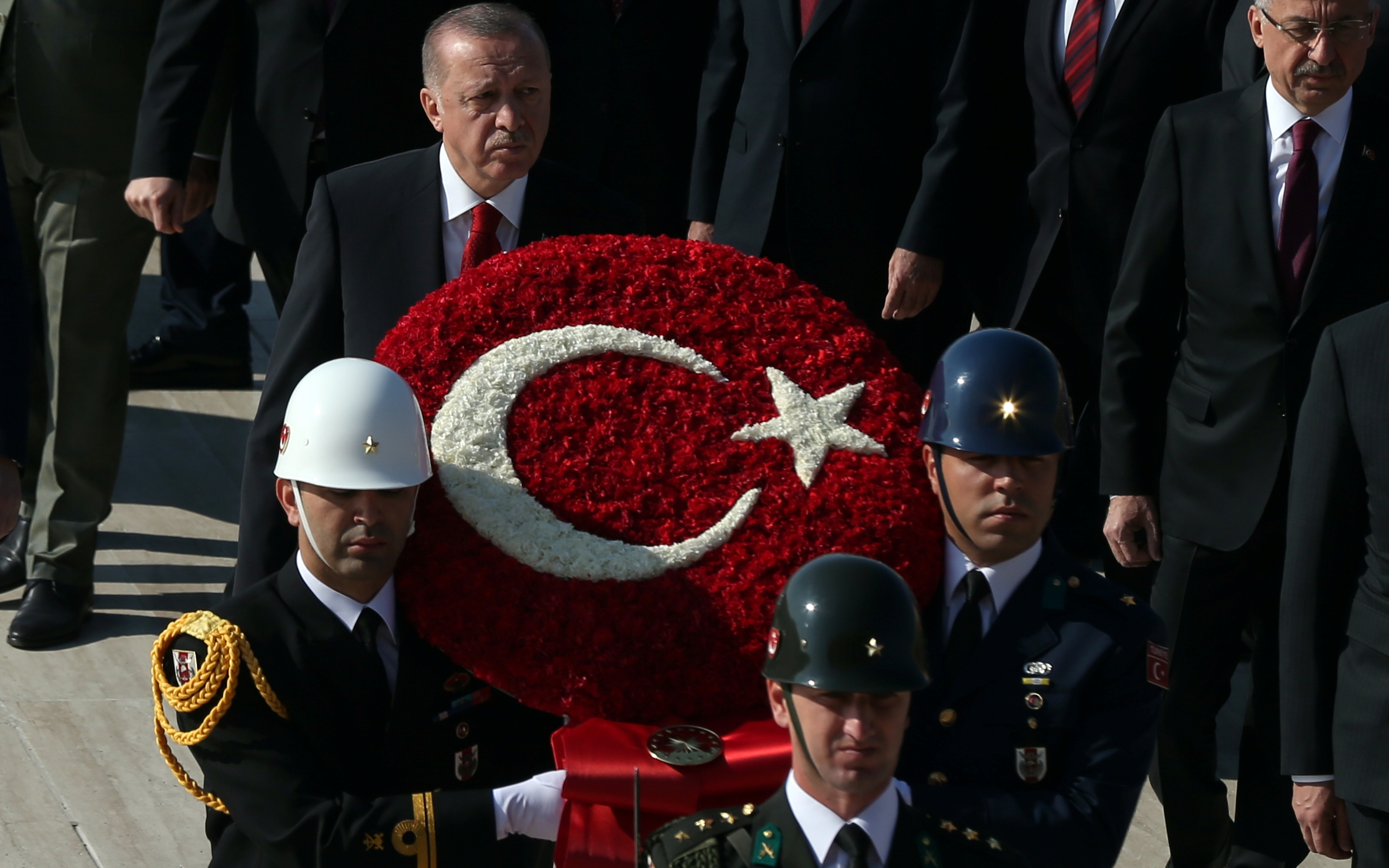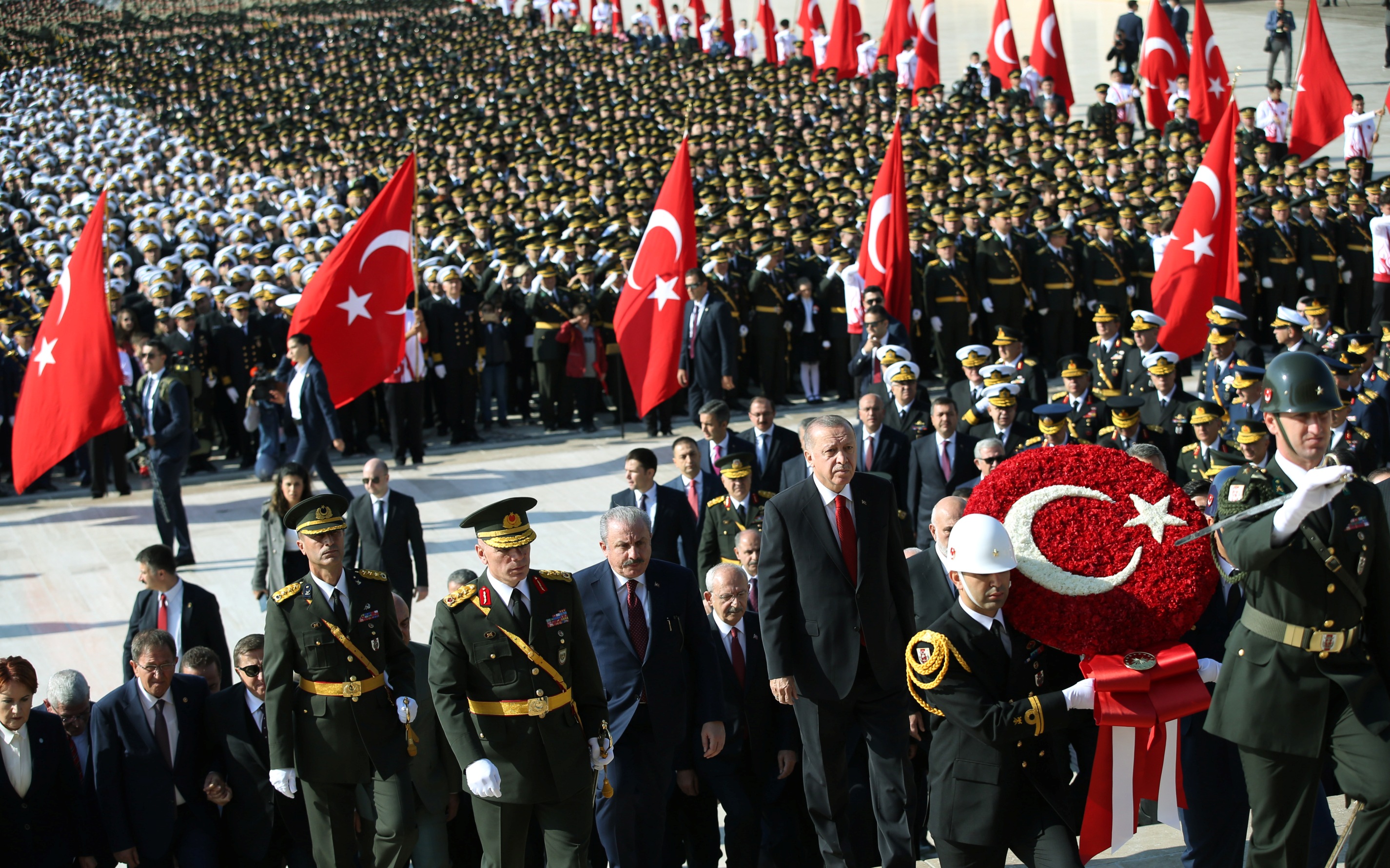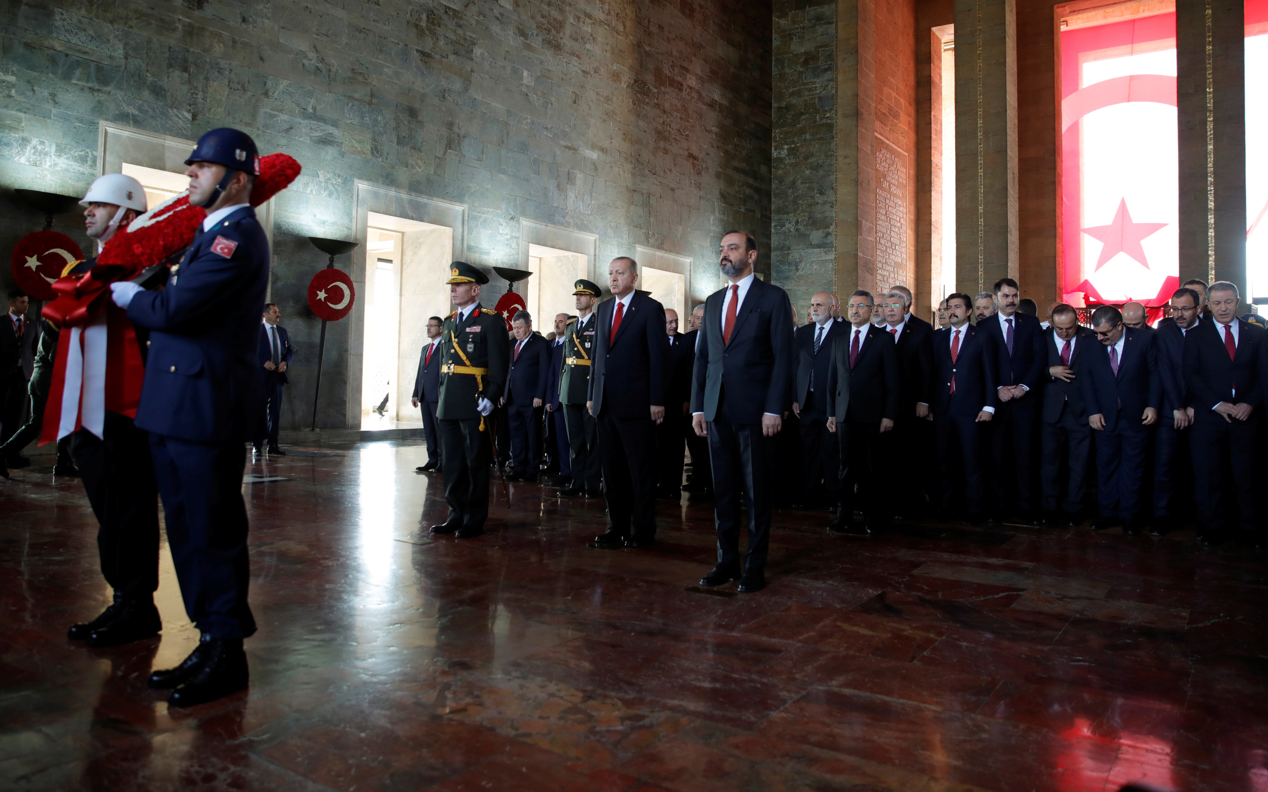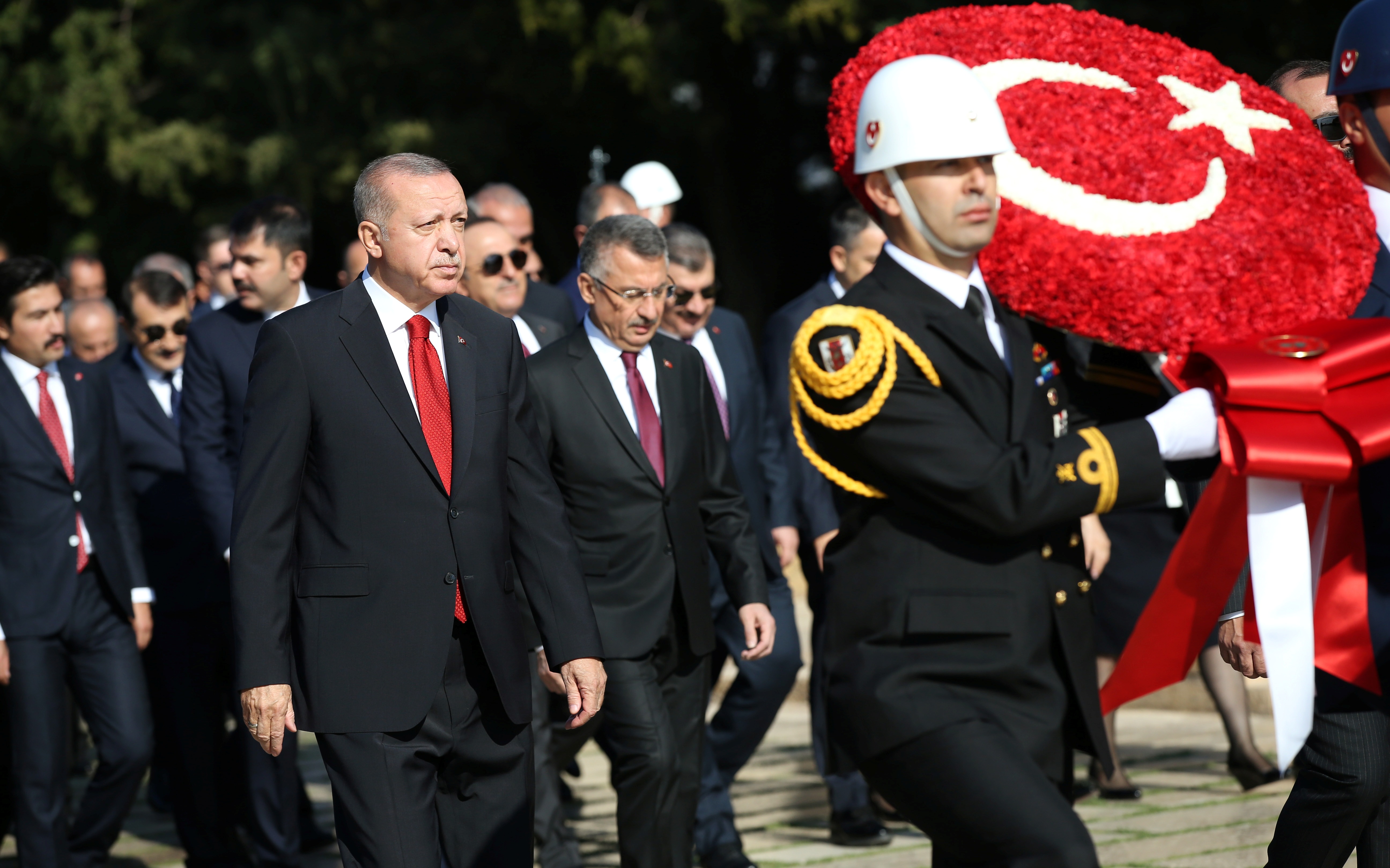 Cumhurbaşkanı Erdoğan ve beraberindekiler, Aslanlı Yol'dan geçerek, Atatürk'ün mozolesine geldi Erdoğan'ın, üzerinde ay yıldız bulunan çelengi Atatürk'ün mozolesine bırakmasının ardından, saygı duruşunda bulunuldu, İstiklal Marşı okundu.