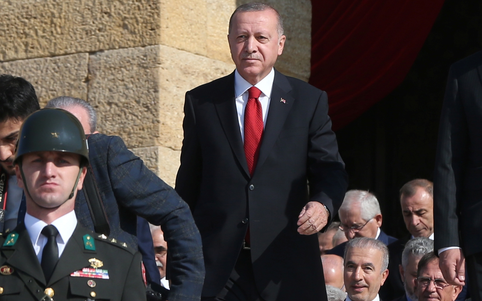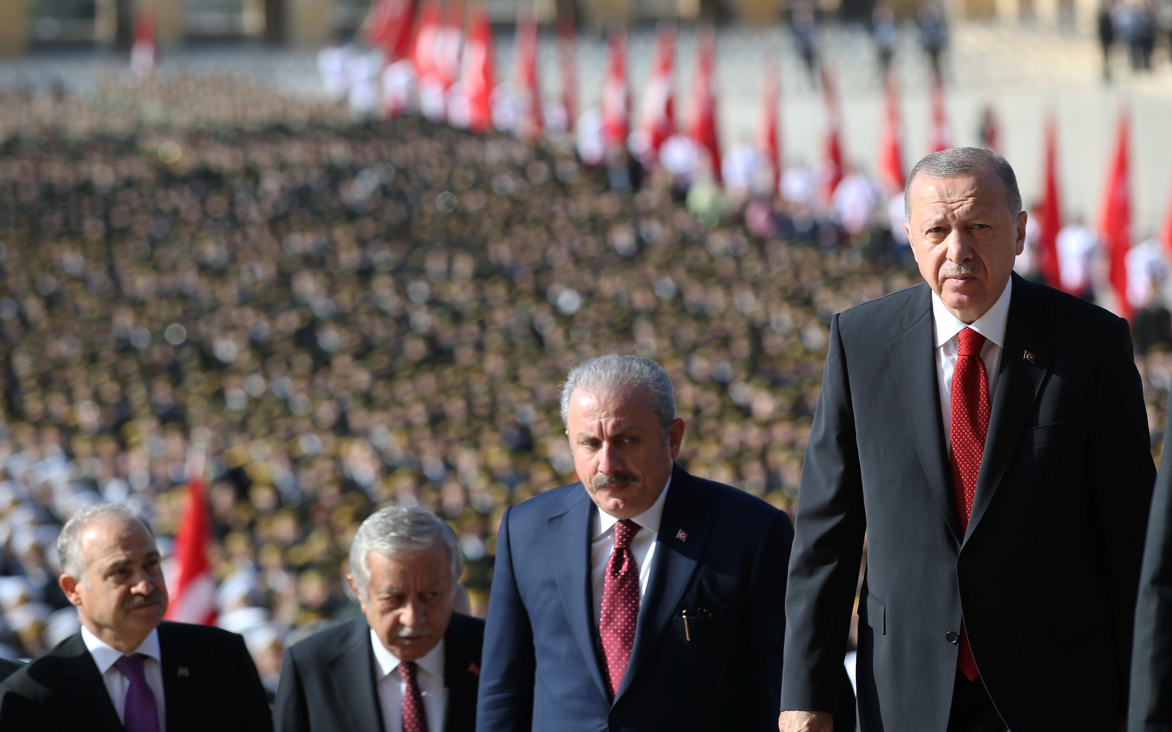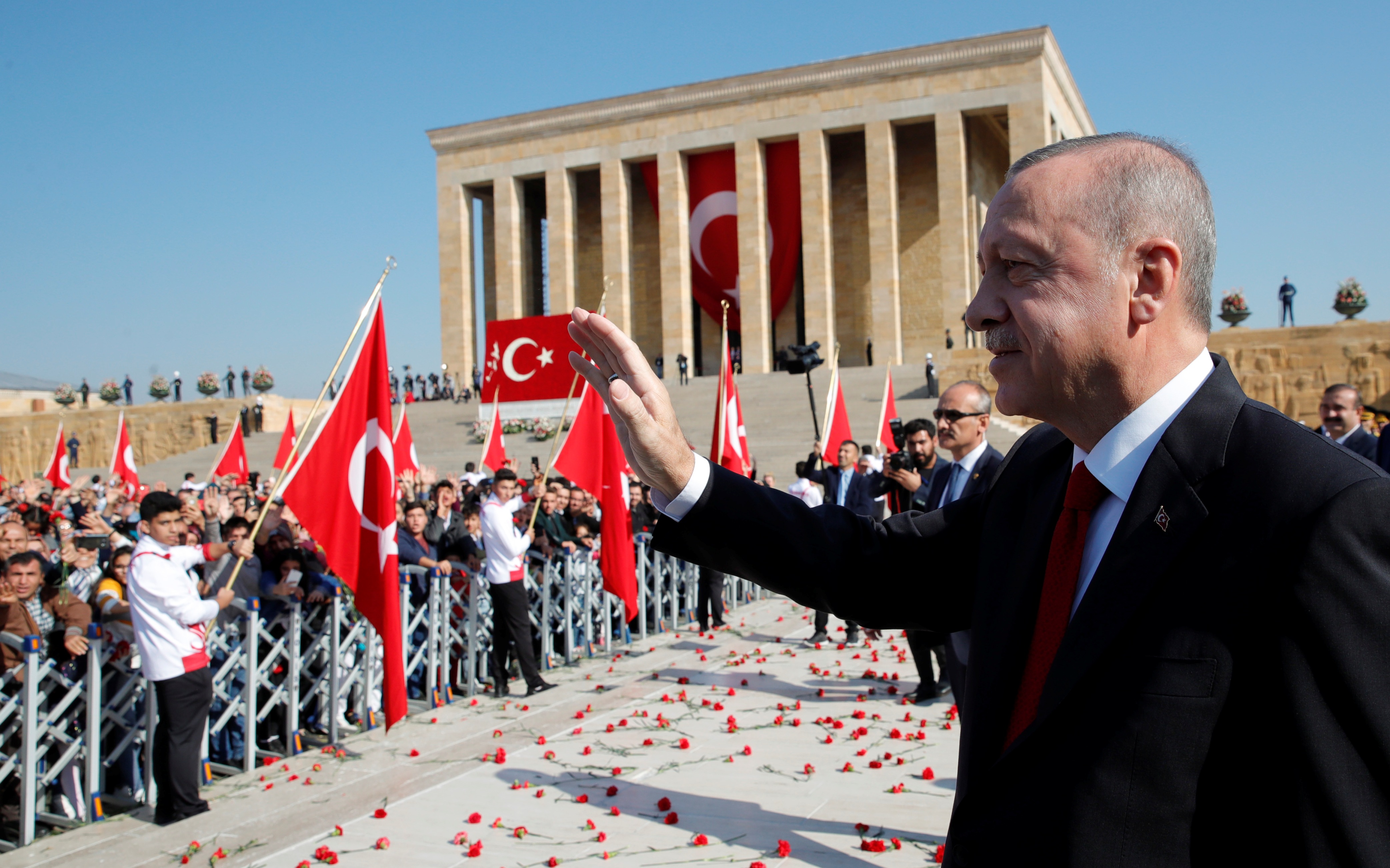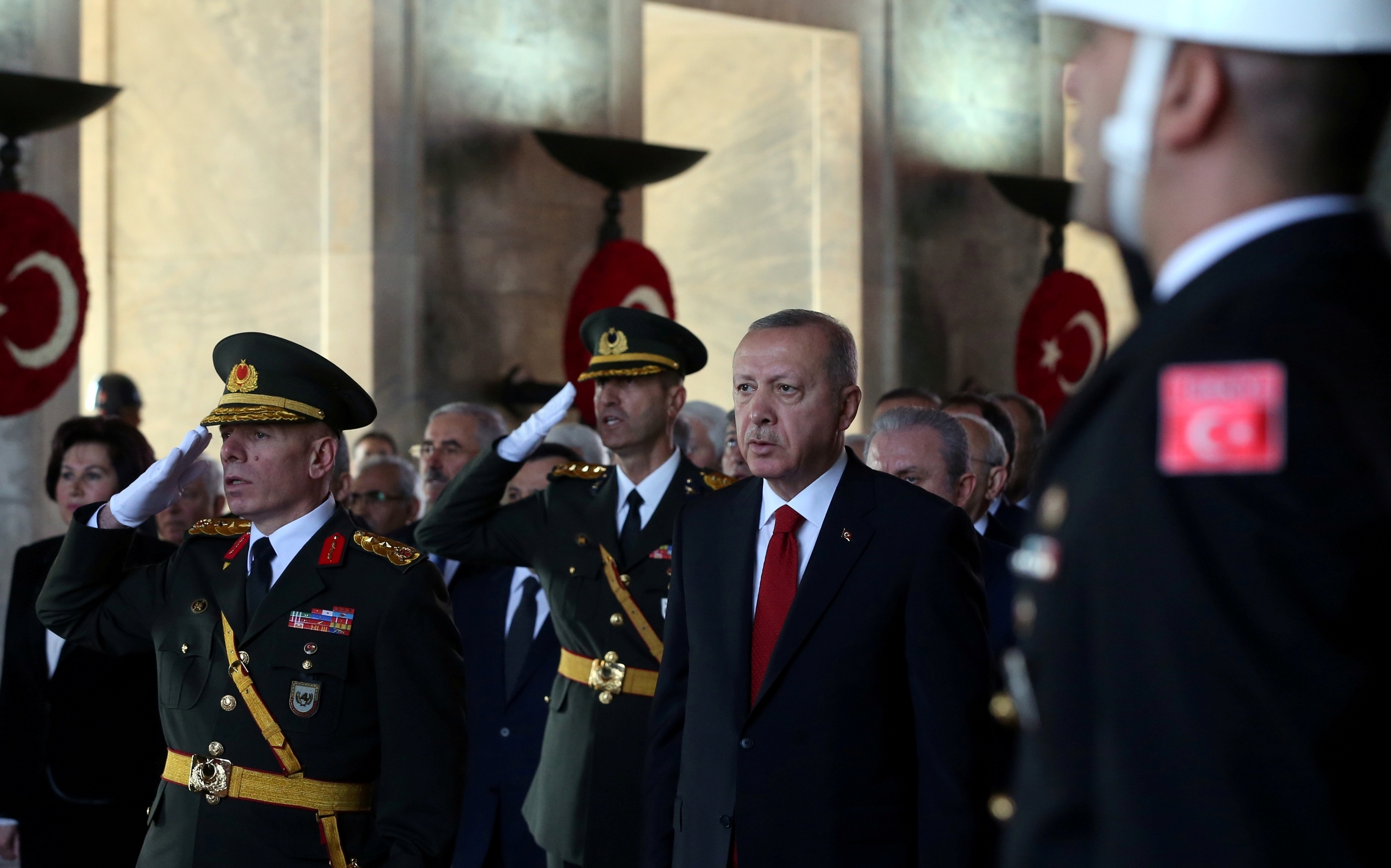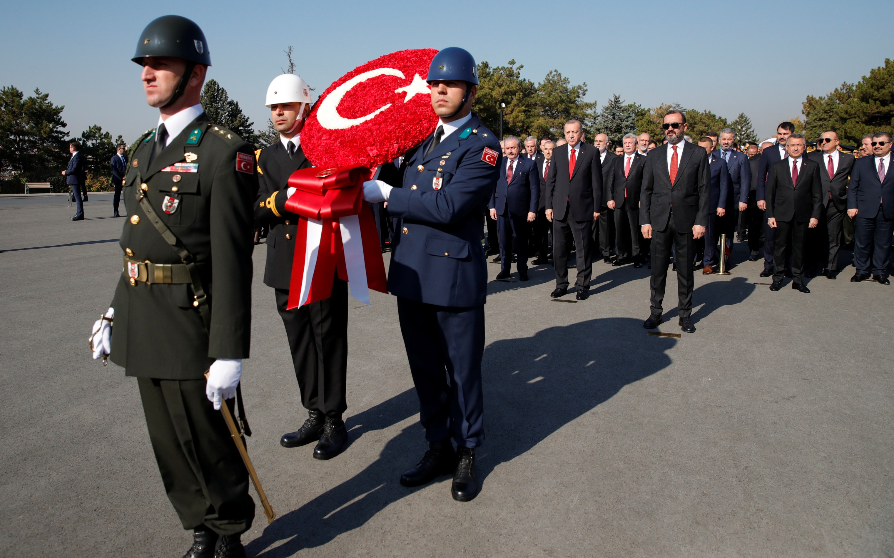 Cumhurbaşkanı Erdoğan ve beraberindekiler, Aslanlı Yol'dan geçerek, Atatürk'ün mozolesine geldi Erdoğan'ın, üzerinde ay yıldız bulunan çelengi Atatürk'ün mozolesine bırakmasının ardından, saygı duruşunda bulunuldu, İstiklal Marşı okundu.