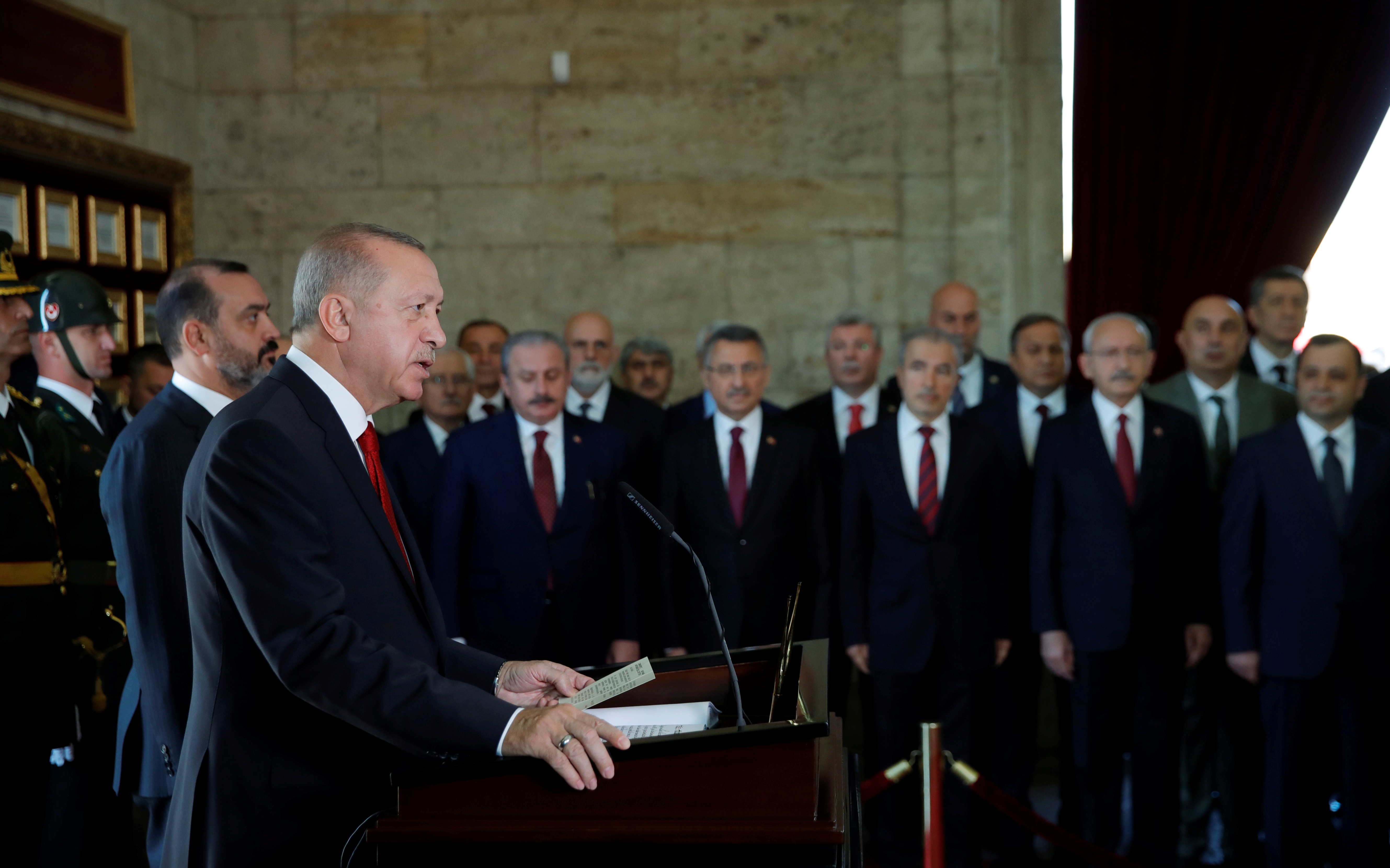 Cumhurbaşkanı Erdoğan'a, Türkiye Büyük Millet Meclisi (TBMM) Başkanı Mustafa Şentop, Cumhurbaşkanı Yardımcısı Fuat Oktay, CHP Genel Başkanı Kemal Kılıçdaroğlu, İYİ Parti Genel Başkanı Meral Akşener, yüksek yargı temsilcileri, Cumhurbaşkanlığı kabinesi üyeleri, siyasi parti temsilcileri, kuvvet komutanları ile diğer devlet erkânı eşlik etti.