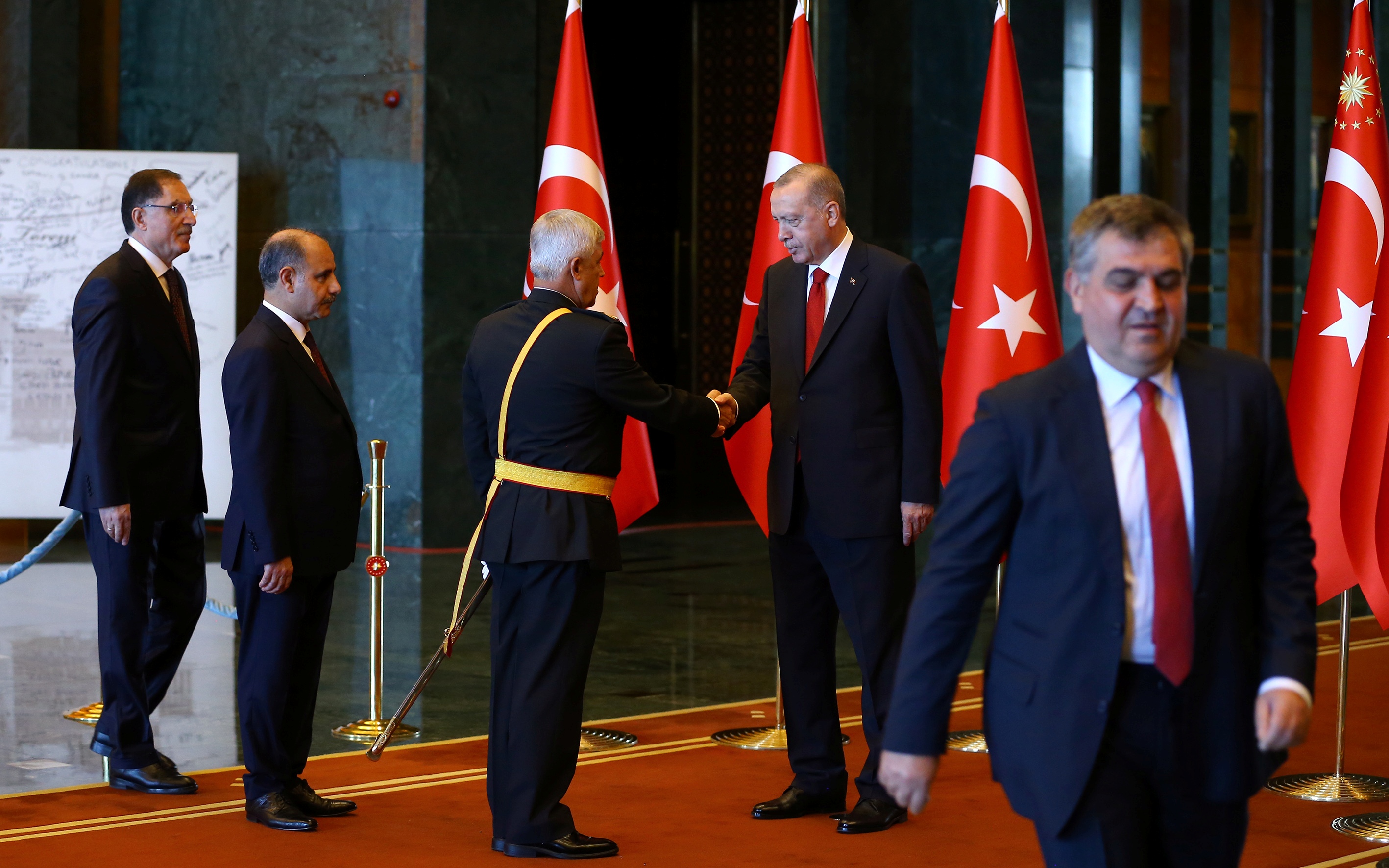 Törende, Genelkurmay Başkanı Orgeneral Yaşar Güler, Kara Kuvvetleri Komutanı Orgeneral Ümit Dündar, Deniz Kuvvetleri Komutanı Oramiral Adnan Özbal ve Hava Kuvvetleri Komutanı Orgeneral Hasan Küçükakyüz, korgeneral ve koramiraller, tümgeneral ve tümamiraller, tuğgeneral ve tuğamiraller, TBMM Başkanvekilleri ve üyeleri, TBMM Genel Sekreteri Mehmet Ali Kumbuzoğlu, yüksek yargı organlarının üyeleri, Milli Güvenlik Kurulu Genel Sekreteri Seyfullah Hacımüftüoğlu, Cumhurbaşkanlığı İdari İşler Başkanı Metin Kıratlı, Cumhurbaşkanlığı Strateji ve Bütçe Başkanı Naci Ağbal, İletişim Başkanı Fahrettin Altun, Cumhurbaşkanlığı Devlet Arşivleri Başkanı Uğur Ünal, Yüksek Seçim Kurulu Başkanı Sadi Güven, Türkiye Barolar Birliği Başkanı Metin Feyzioğlu, Emniyet Genel Müdürü Mehmet Aktaş, Ankara Valisi Vasip Şahin, Ankara Büyükşehir Belediye Başkanı Mansur Yavaş ile bürokratlar da Erdoğan'a tebriklerini sundu.