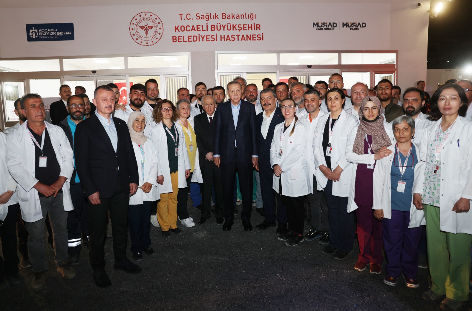 Cumhurbaşkanı Erdoğan, sahra hastanesindeki yaralıların durumu hakkında Sağlık Bakanı Koca'dan bilgi aldıktan sonra sağlık çalışanlarıyla hatıra fotoğrafı çektirdi, kendisine sevgi gösterisinde bulunanları el sallayarak selamladı.