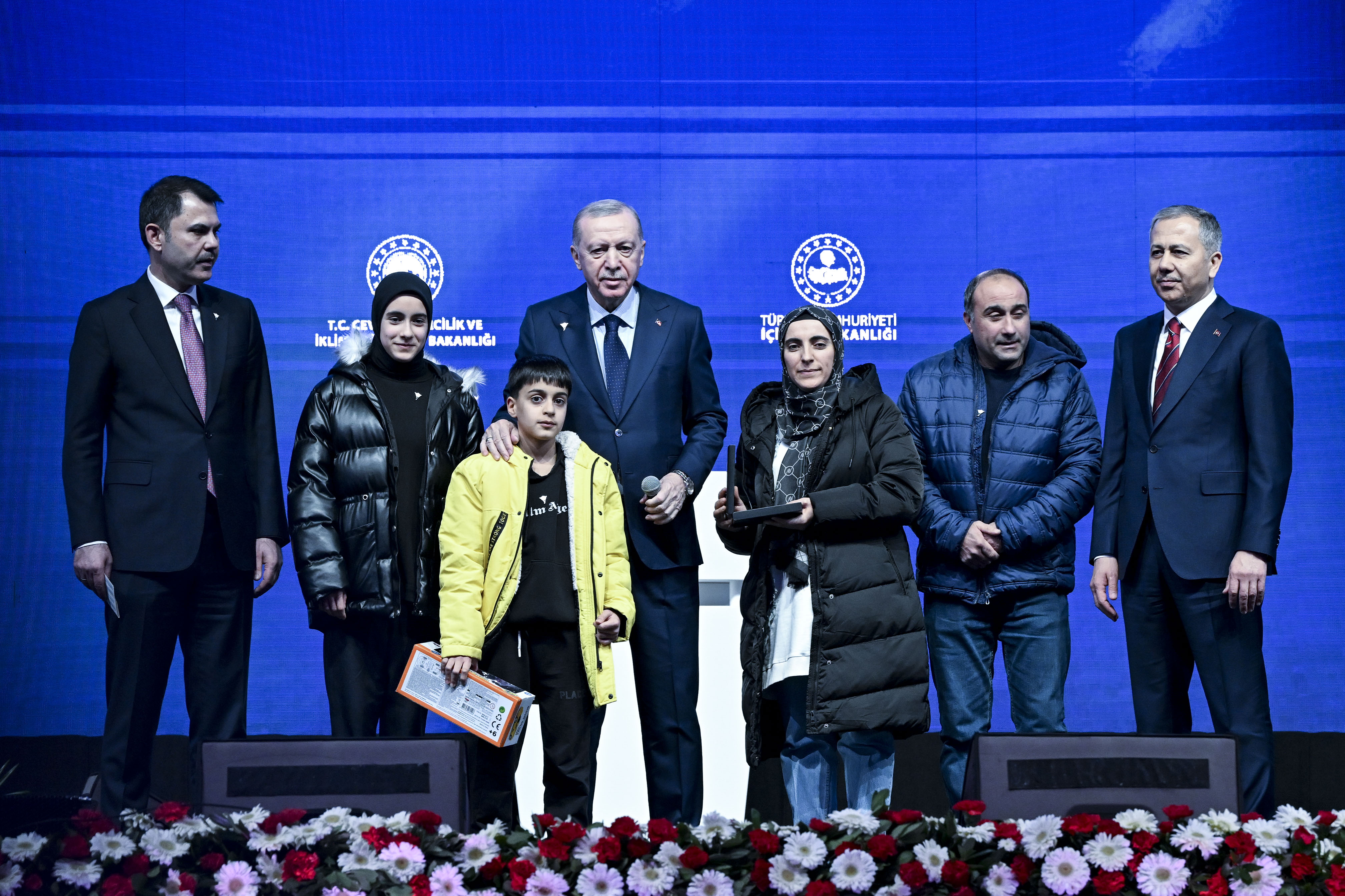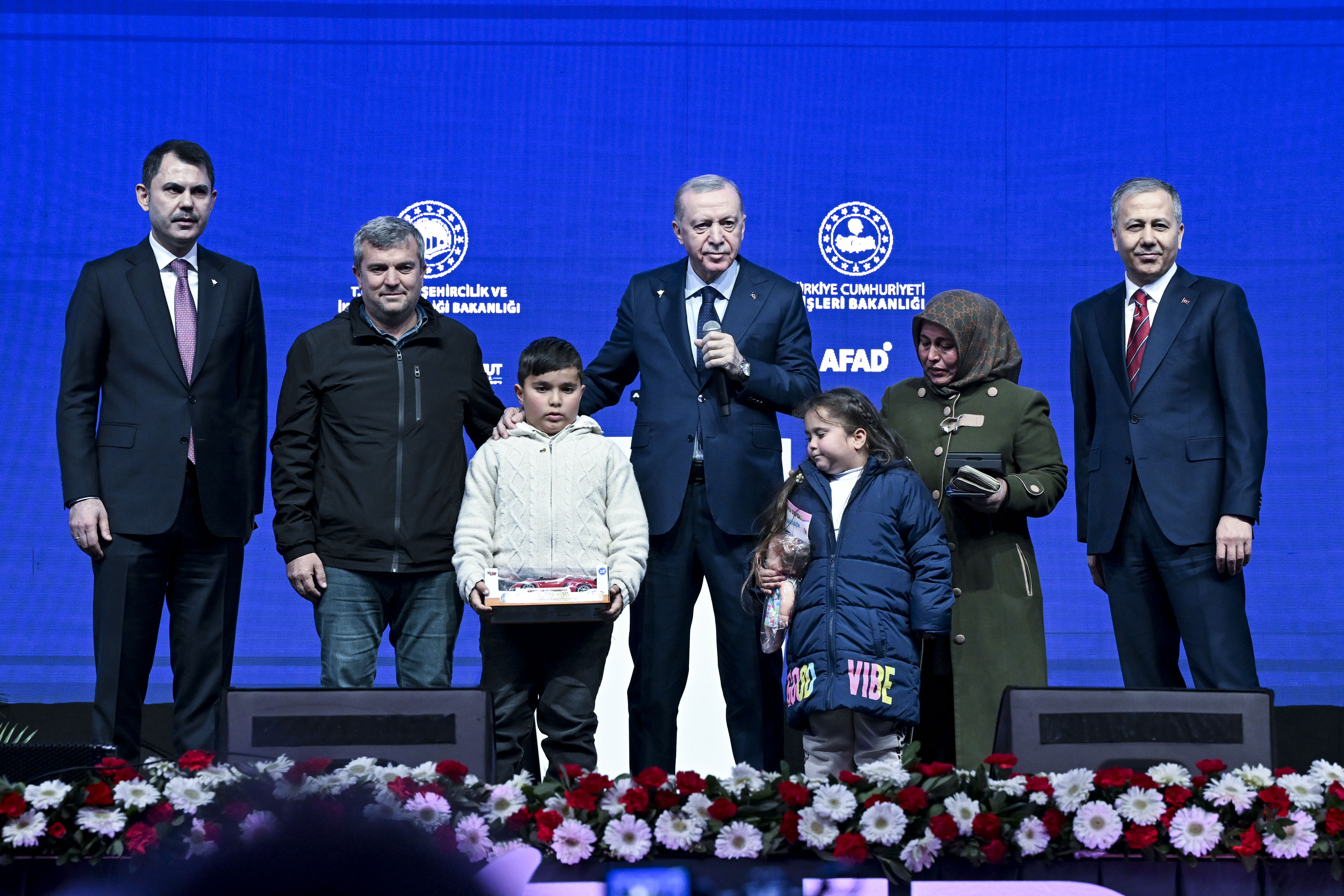 İki hafta önce 24 Ocak'ta, 201 bininci yuvanın anahtarlarını Malatya'da hak sahiplerine teslim ettiklerini hatırlatan Cumhurbaşkanı Erdoğan, "Son iki yılda deprem bölgemize 2,6 trilyon lirayı aşan yatırımlar yaptık. 2025 bütçemizde ise 584 milyar liralık kaynak tahsis ettik. İnşa edeceğimiz konutların tamamının yapımına başladık. Kalan 252 bin konut ve iş yerimizi de hızlıca bitirip hak sahiplerine teslim edeceğiz. Böylelikle yılbaşına kadar toplam 453 bin konut yani neredeyse yarım milyon konut yapacak ve evine girmeyen, iş yerine kavuşmayan tek bir vatandaşımızı dahi bırakmayacağız." diye konuştu.