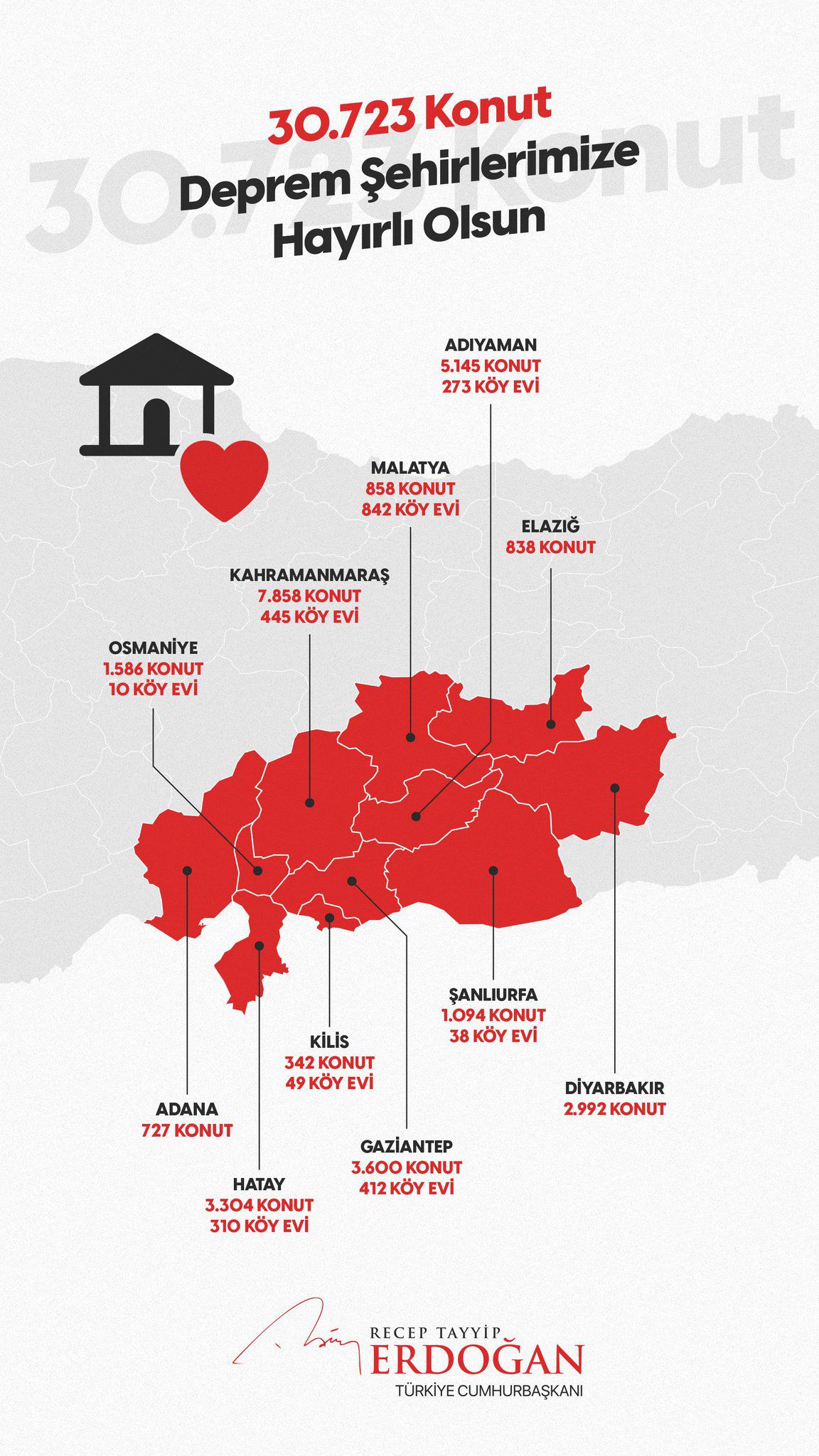 Kahramanmaraş'ta 7 bin 858'i konut ve 445 köy evi olmak üzere 8 bin 303, Hatay'da 3 bin 304'ü konut ve 310'u köy evi olmak üzere 3 bin 614, Adıyaman'da 5 bin 145'i konut ve 273'ü köy evi olmak üzere 5 bin 418, Gaziantep'te 3 bin 600'ü konut ve 412'si köy evi olmak üzere 4 bin 12, Diyarbakır'da 2 bin 992 konut, Malatya'da 858'i konut ve 842'si köy evi olmak üzere 1700, Osmaniye'de 1586'sı konut ve 10'u köy evi olmak üzere 1596, Şanlıurfa'da 1094'ü konut ve 38'i köy evi olmak üzere 1132, Elazığ'da 838 konut, Adana'da 727 konut, Kilis'te 342'si konut ve 49'u köy evi olmak üzere 391. Toplamda 30 bin 723 ailemize yeni yuvalarının hayırlı, uğurlu, bereketli olmasını diliyorum."