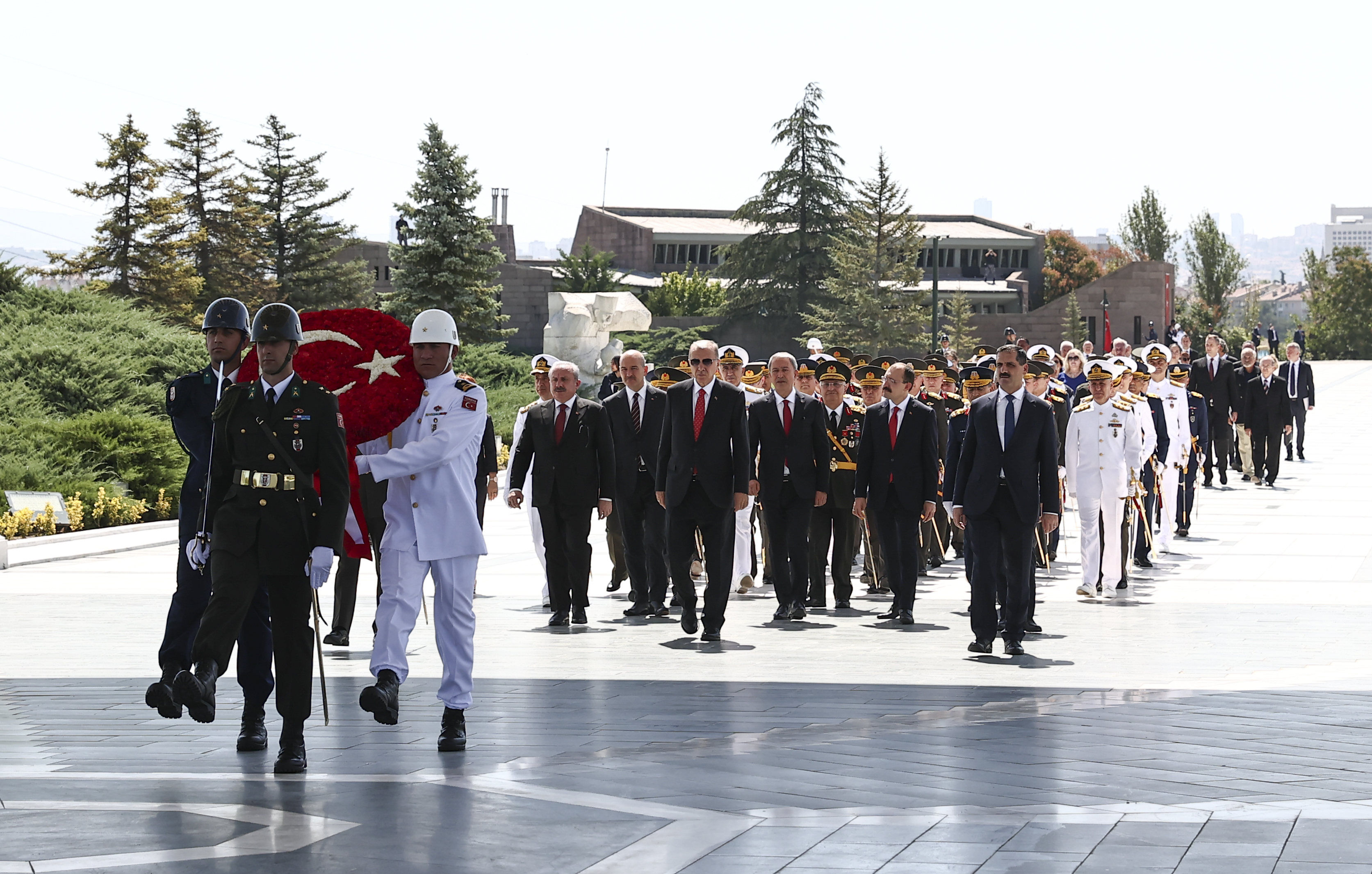 Cumhurbaşkanı Erdoğan, beraberindeki Meclis Başkanı Mustafa Şentop, Cumhurbaşkanı Yardımcısı Fuat Oktay, İçişleri Bakanı Süleyman Soylu, Milli Savunma Bakanı Hulusi Akar, Ticaret Bakanı Mehmet Muş, Genelkurmay Başkanı Orgeneral Yaşar Güler, kuvvet komutanları, garnizonda görevli general ve amiraller ile Milli Mücadele'de görev almış komutanların ve mücadelenin kahramanlarının torunları ve akrabalarıyla, 30 Ağustos Zafer Bayramı ve Türk Silahlı Kuvvetleri Günü dolayısıyla Devlet Mezarlığı'nda düzenlenen törene katıldı.