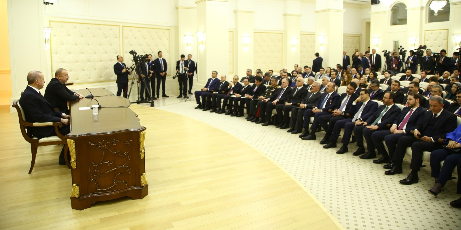 Cumhurbaşkanı Erdoğan ve Azerbaycan Cumhurbaşkanı İlham Aliyev, baş başa görüşmeleri ve başkanlıklarında gerçekleşen Yüksek Düzeyli Stratejik İşbirliği Konseyi 8'inci Toplantısı sonrasında Zagulba Sarayı'nda ortak basın toplantısı düzenledi.
