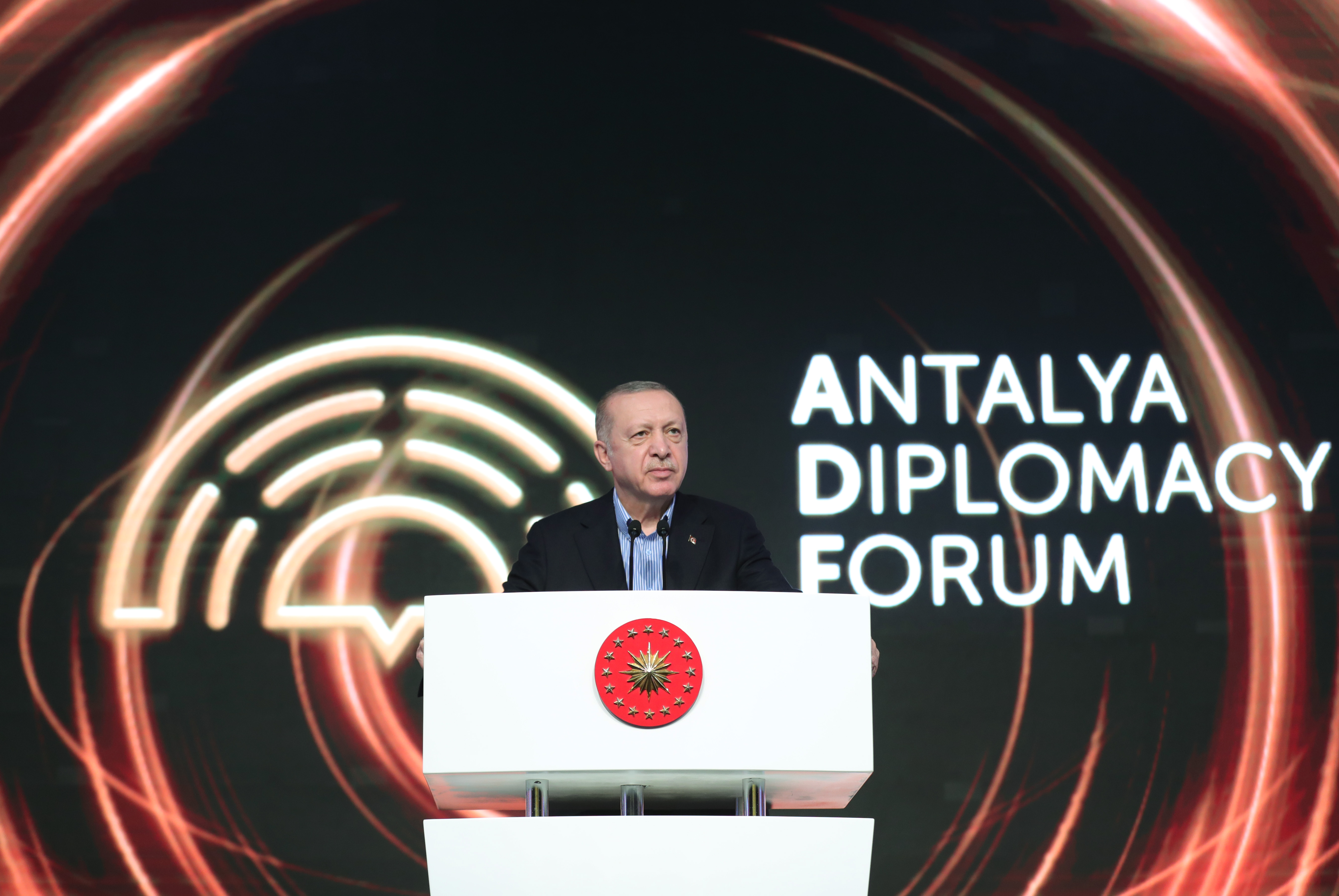 Antalya Diplomasi Formu'nun bu buluşmasında devlet ve hükümet başkanlarıyla bir araya gelmekten büyük bir memnuniyet duyduğunu belirten Cumhurbaşkanı Erdoğan, "Türk turizminin başkenti, Akdeniz'in incisi bu güzel şehrimize, Antalya'ya hoş geldiniz." dedi.