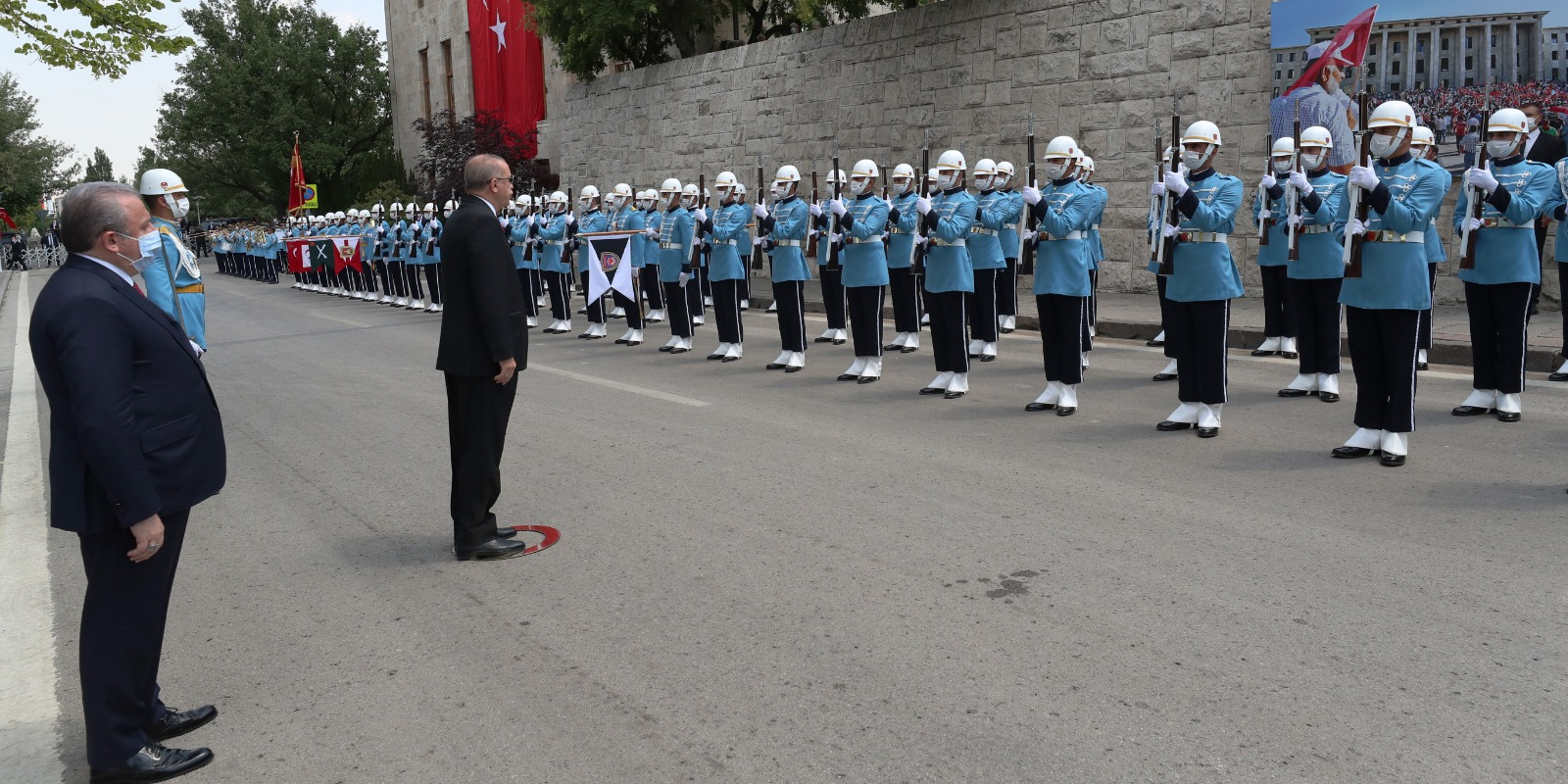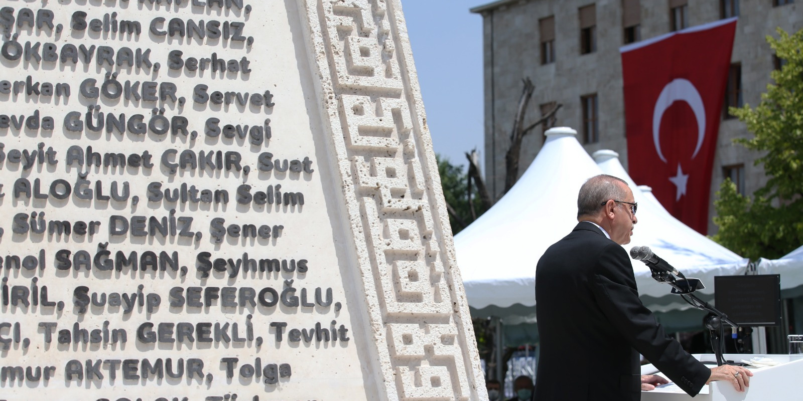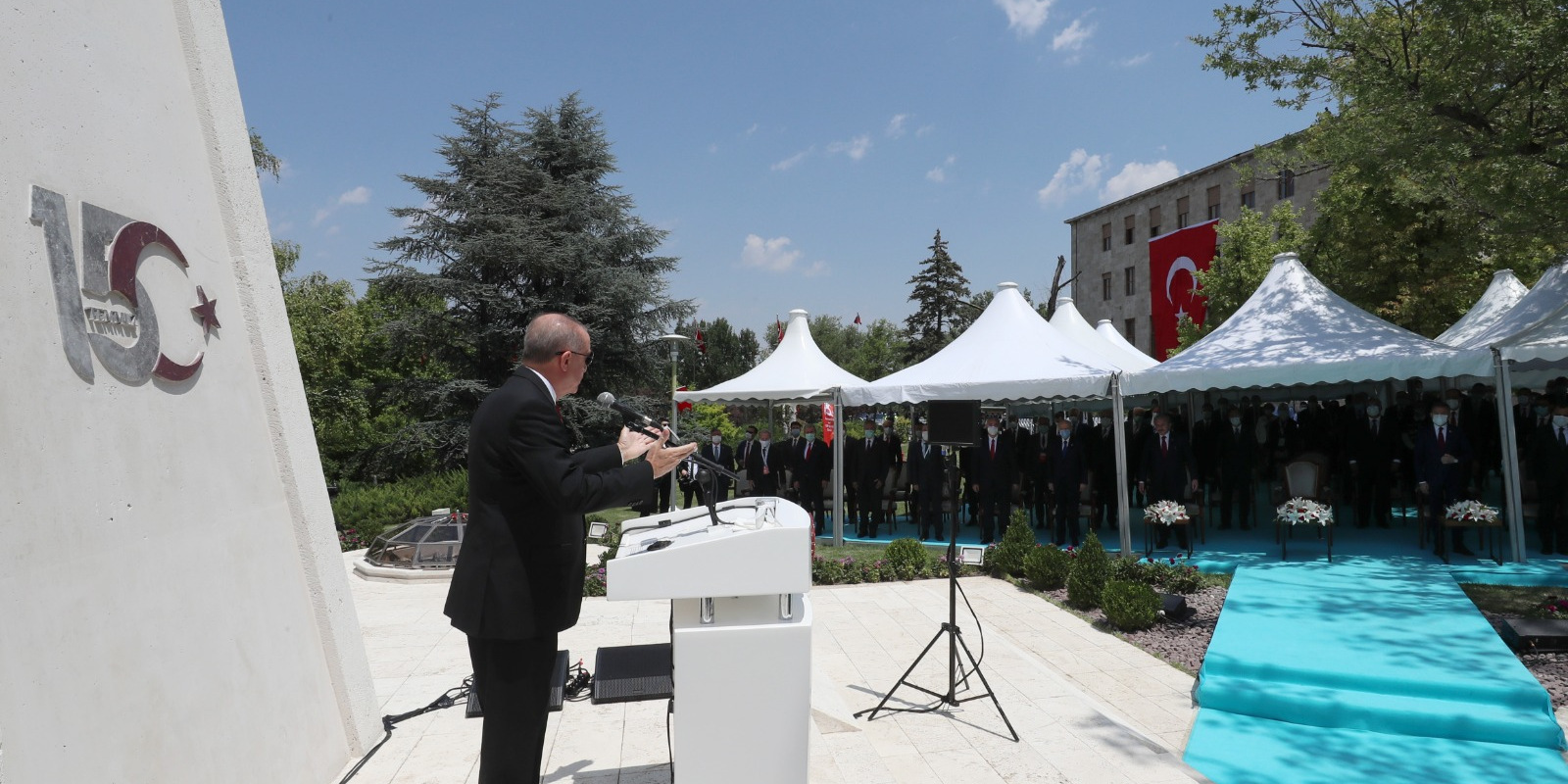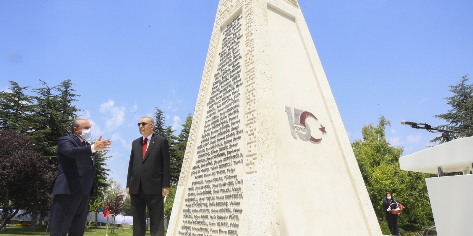 TBMM 15 Temmuz Anıtı'nı işaret eden Erdoğan, "Zaten şu anda önünde merasim yaptığımız anıtta da kufi olarak malum Rabb'imizin buyurduğu, 'Allah yolunda öldürülenlere ölüler demeyiniz. Onlar diridirler ancak siz bilemezsiniz.' hükmü yer almaktadır. Bu uğurda şehadete koşan şehitlerimize şahsım, milletim adına özellikle biz de şükranlarımızı ifade ediyoruz. Bin yıldır her karışını şehit kanlarıyla suladığımız bu toprakların vatanımız haline gelmesi ve kalması için verdiğimiz mücadelelerde yer alan gazilerimizi minnetle yad ediyorum." diye konuştu.