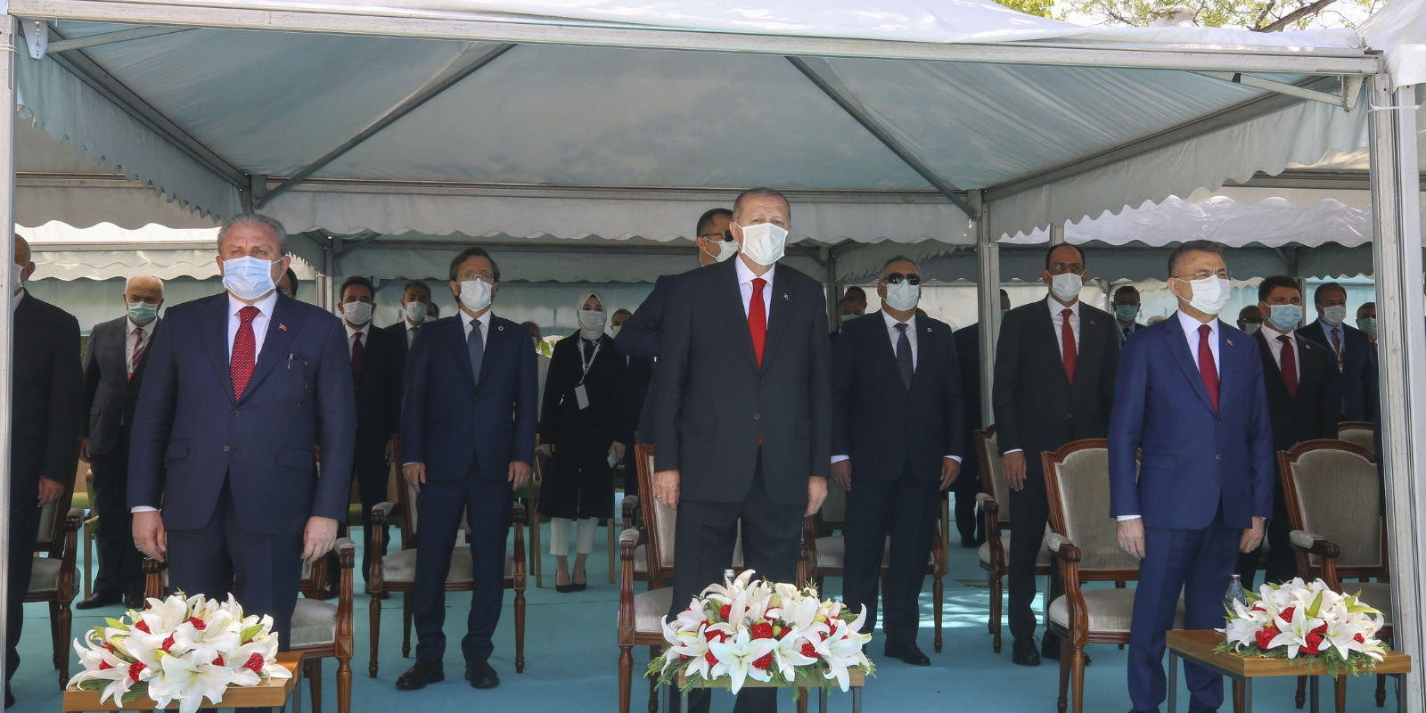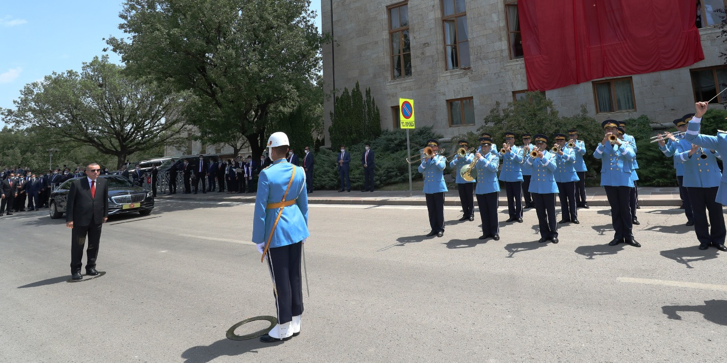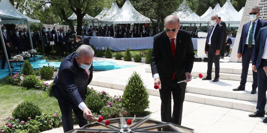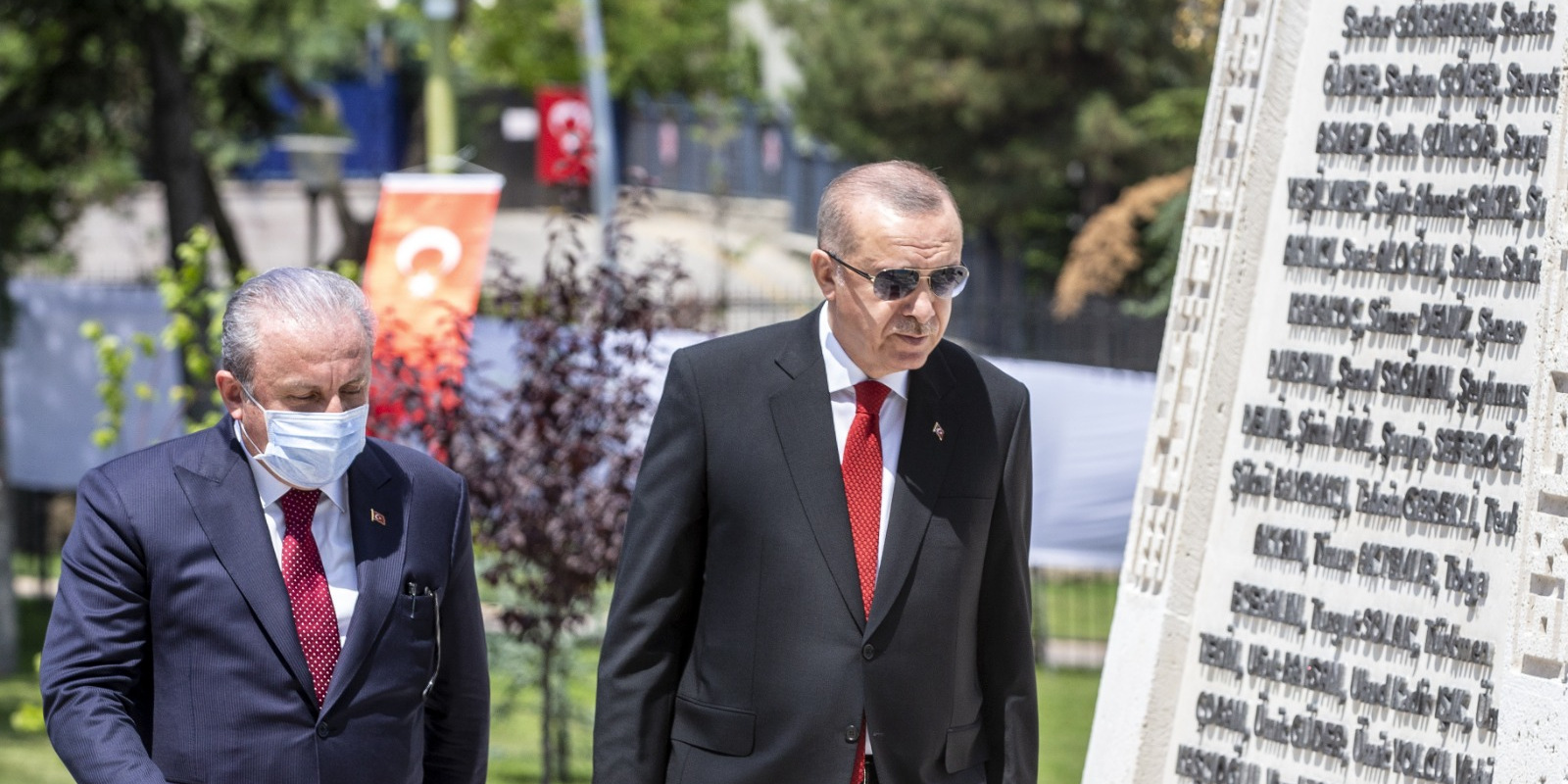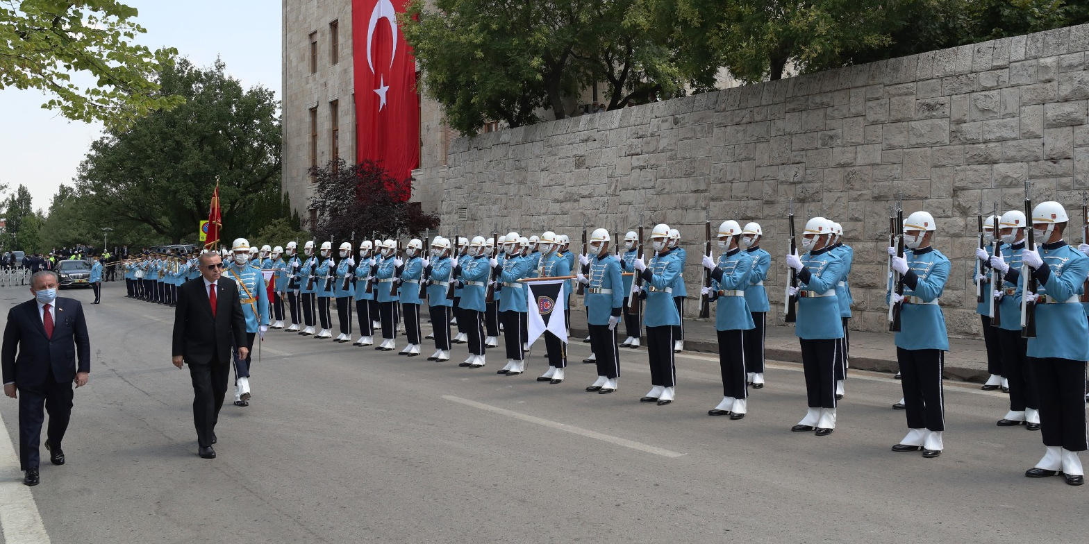 TBMM 15 Temmuz Anıtı'nı işaret eden Erdoğan, "Zaten şu anda önünde merasim yaptığımız anıtta da kufi olarak malum Rabb'imizin buyurduğu, 'Allah yolunda öldürülenlere ölüler demeyiniz. Onlar diridirler ancak siz bilemezsiniz.' hükmü yer almaktadır. Bu uğurda şehadete koşan şehitlerimize şahsım, milletim adına özellikle biz de şükranlarımızı ifade ediyoruz. Bin yıldır her karışını şehit kanlarıyla suladığımız bu toprakların vatanımız haline gelmesi ve kalması için verdiğimiz mücadelelerde yer alan gazilerimizi minnetle yad ediyorum." diye konuştu.