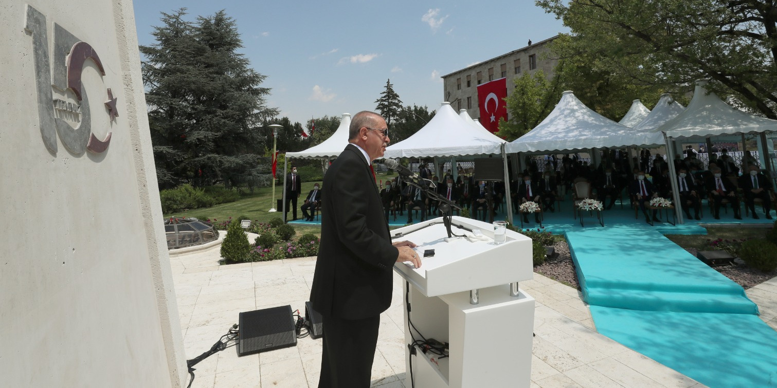 Türkiye'nin, 15 Temmuz öncesi, FETÖ'cülerin bürokrasideki, medyadaki, sivil toplum kuruluşlarındaki, iş dünyasındaki, siyasetteki mensupları vasıtasıyla yaptığı herhangi bir hamlenin adeta sonu felçle sonuçlanan bir ülke durumunda olduğunu belirten Erdoğan, "Çoğu defa, yaşadığımız durumun sebebini özellikle bilmeden çok enerji sarf ediyor, az netice elde ederek hedeflerimize doğru yol almaya çalışıyorduk. Elbette bir noktadan sonra, ülkemizin karşılaştığı sıkıntıların gerisinde bu örgütün silüetini görmeye başladık. Ama, örgütün sinsi yapısı sebebiyle, tespitlerimizi somutlaştırmakta ve etkili tedbir almakta zorlanıyorduk." diye konuştu.