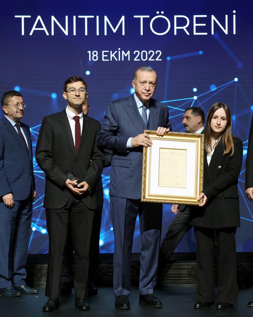 Cumhurbaşkanlığı Ulusal Staj Programı'ndan yararlanan 160 bin stajyeri temsilen de bir genç tarafından da Cumhurbaşkanı Erdoğan'a ödül takdim edildi.