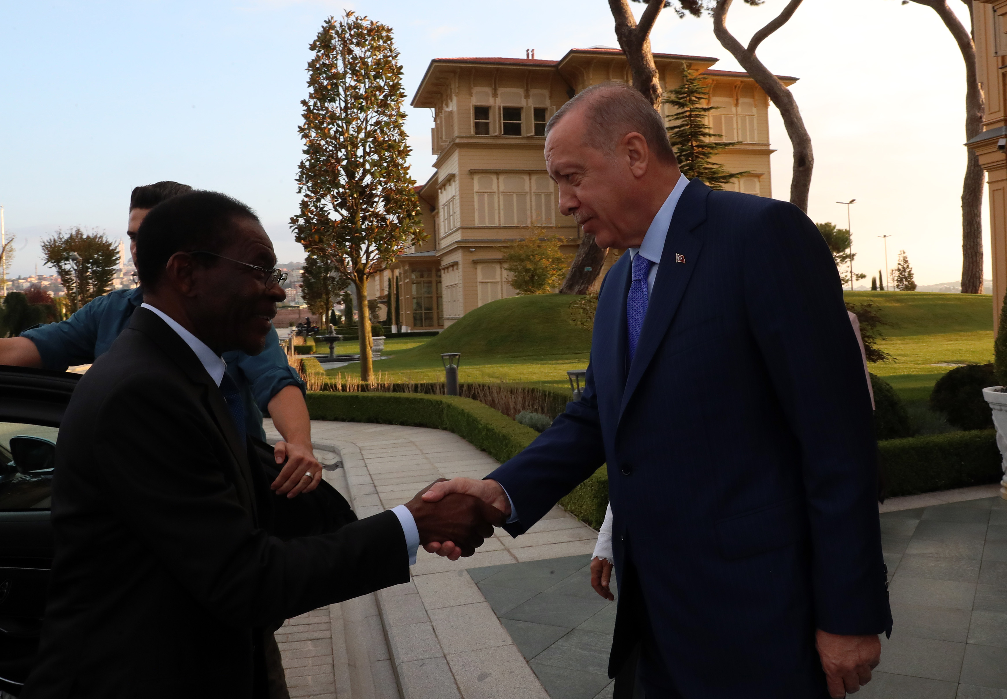Vahdettin Köşkü'ne gelen Mbasogo ve eşi Constancia Mangue'yi, Cumhurbaşkanı Erdoğan ile eşi Emine Erdoğan karşıladı.