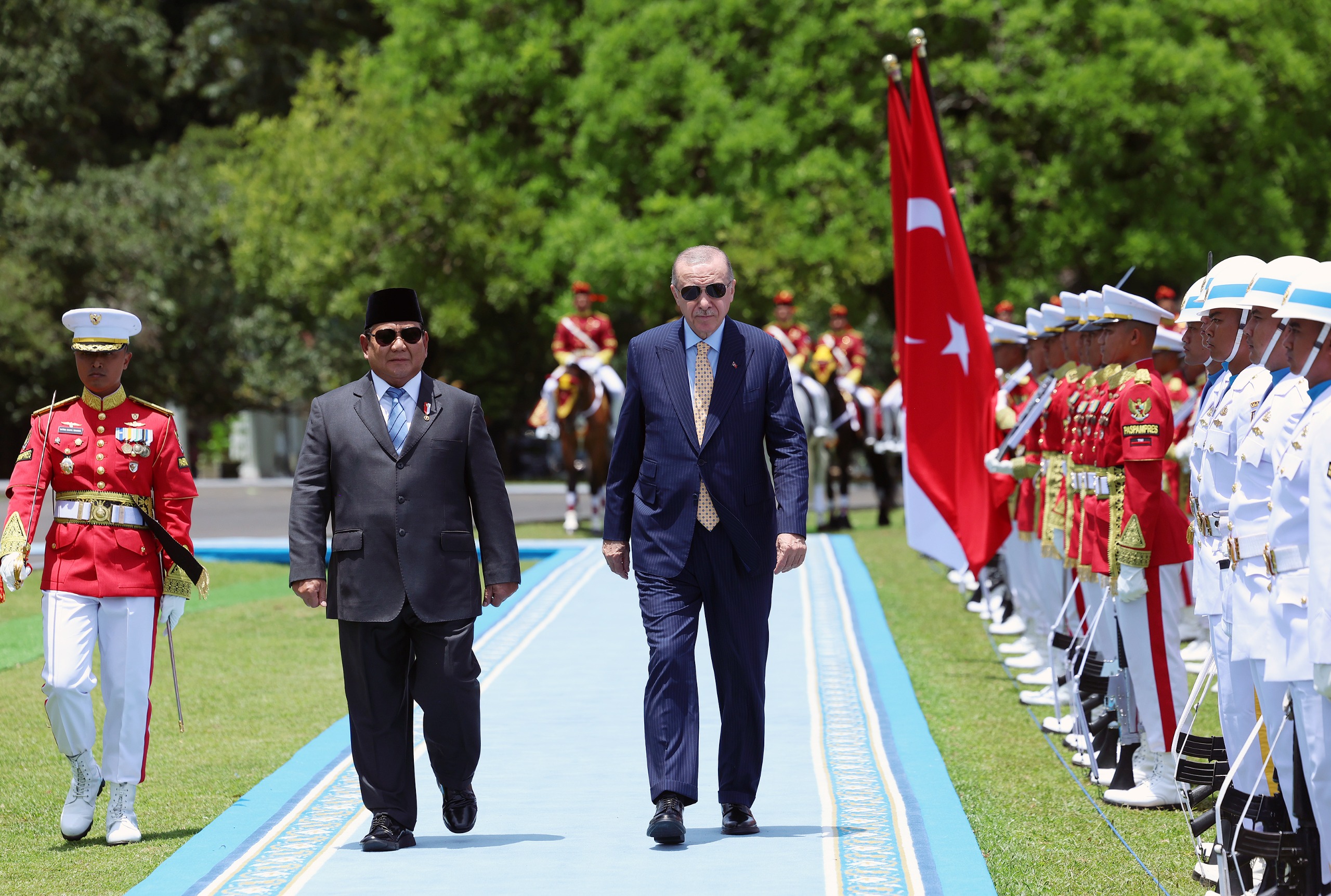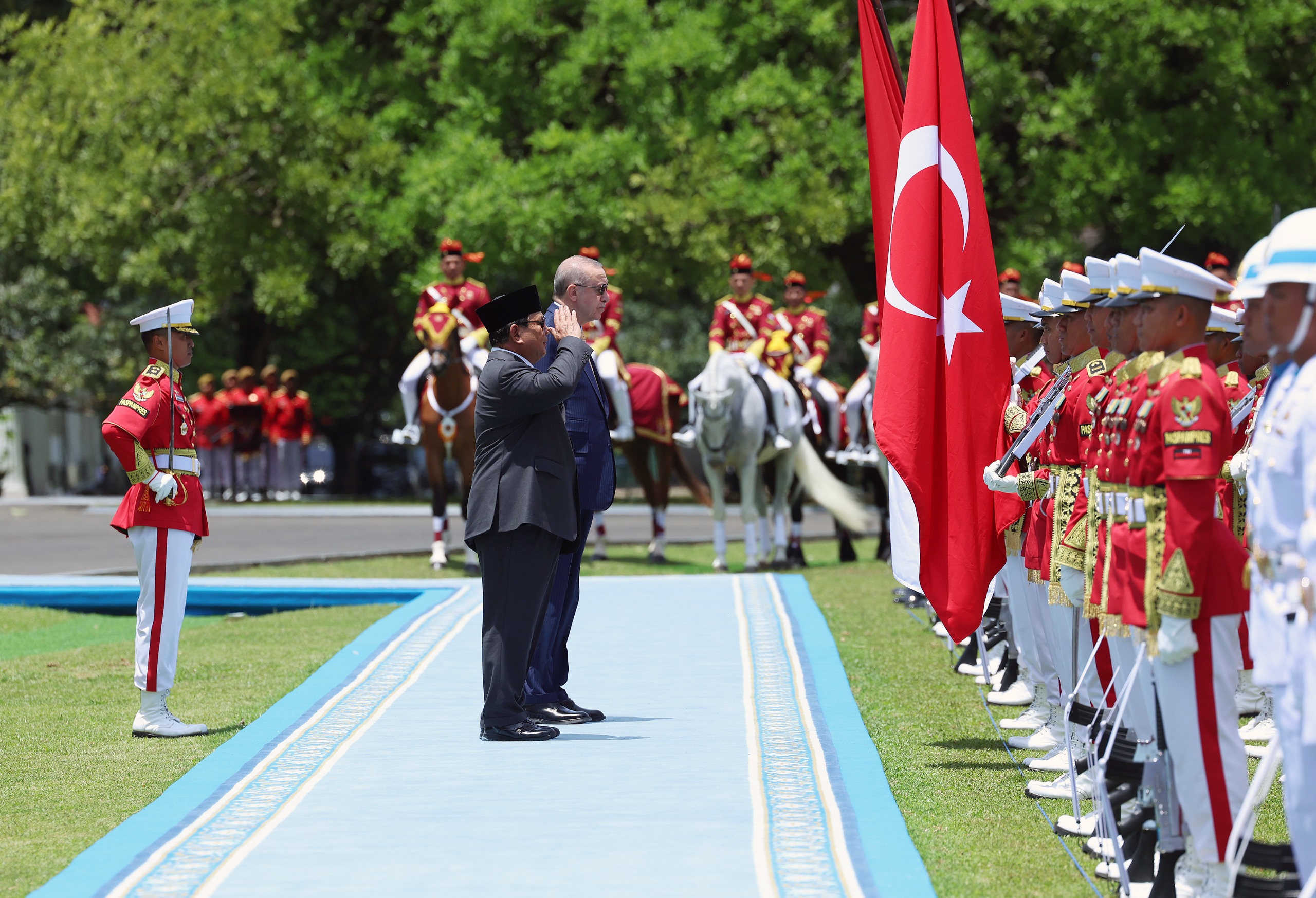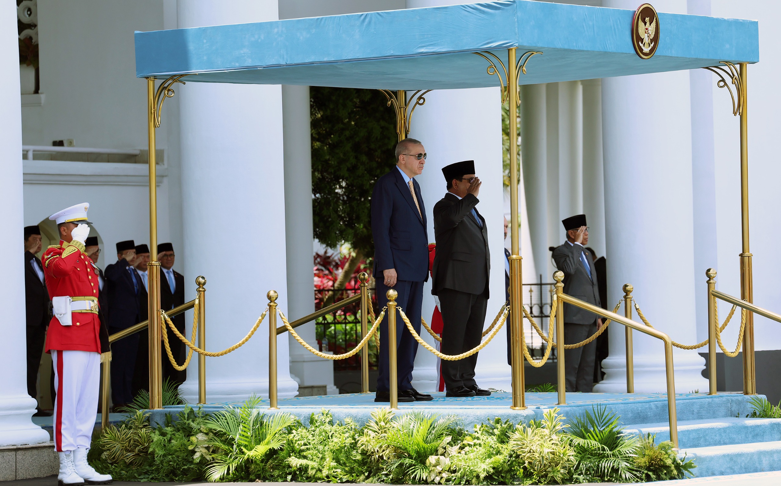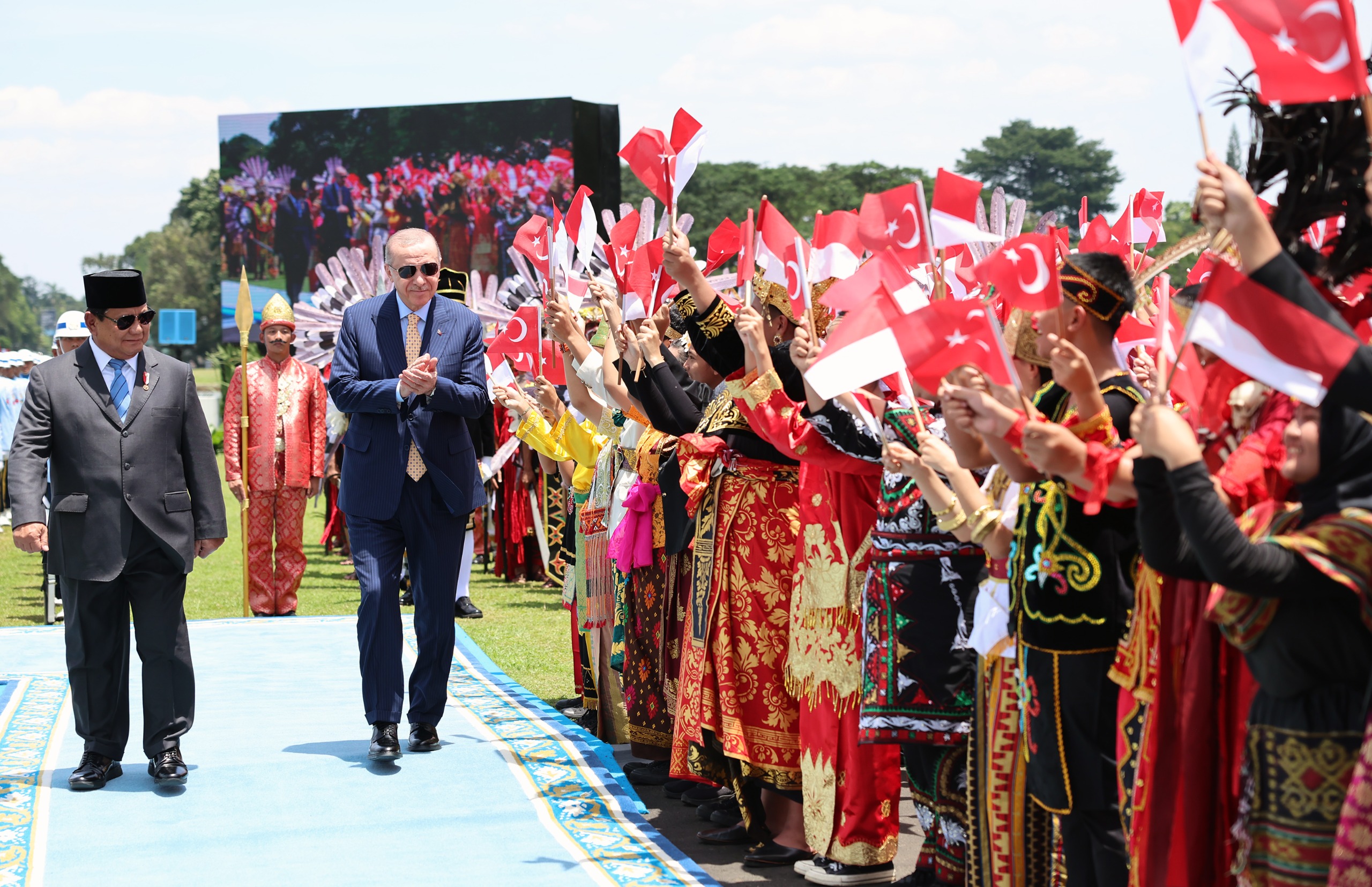 Endonezya Cumhurbaşkanı Subianto, Cumhurbaşkanı Erdoğan'ı giriş kapısında karşıladı. Cumhurbaşkanı Erdoğan ve Endonezya Cumhurbaşkanı Subianto'nun tören alanındaki yerlerini almasının ardından, askerî bando iki ülkenin millî marşlarını çaldı, top atışı yapıldı.