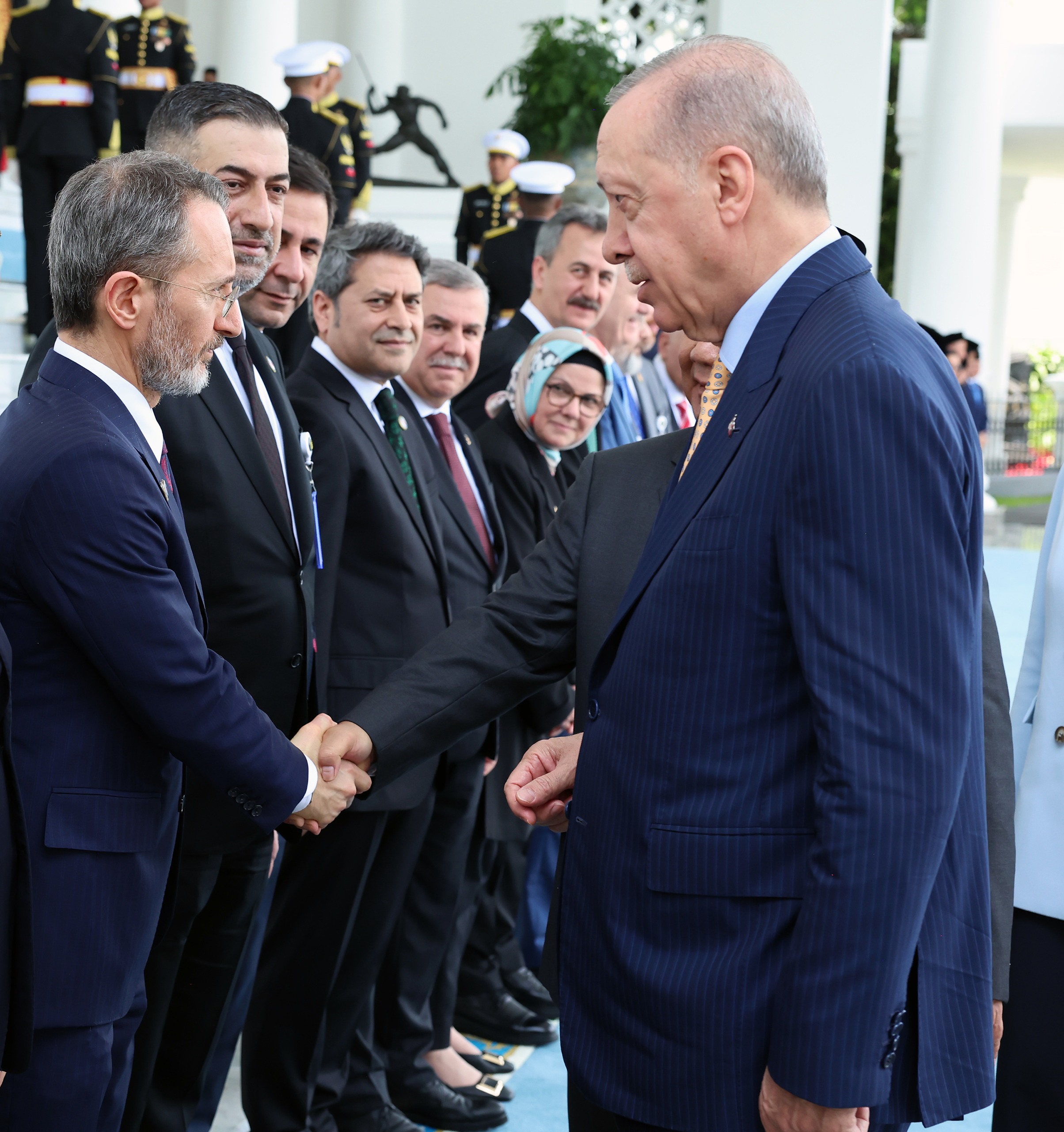 Tören kıtasını denetleyen Cumhurbaşkanı Erdoğan ve Endonezya Cumhurbaşkanı Subianto, bina girişinde Türkiye ve Endonezya bayrakları önünde tokalaşarak basın mensuplarına poz verdi.