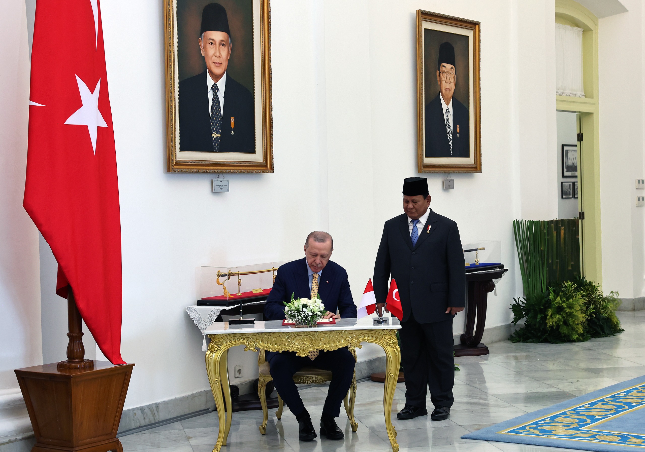 Bogor Cumhurbaşkanlığı Sarayı'nda şeref defterin imzalayan Cumhurbaşkanı Erdoğan, daha sonra Subianto ile baş başa görüşmeye geçti.