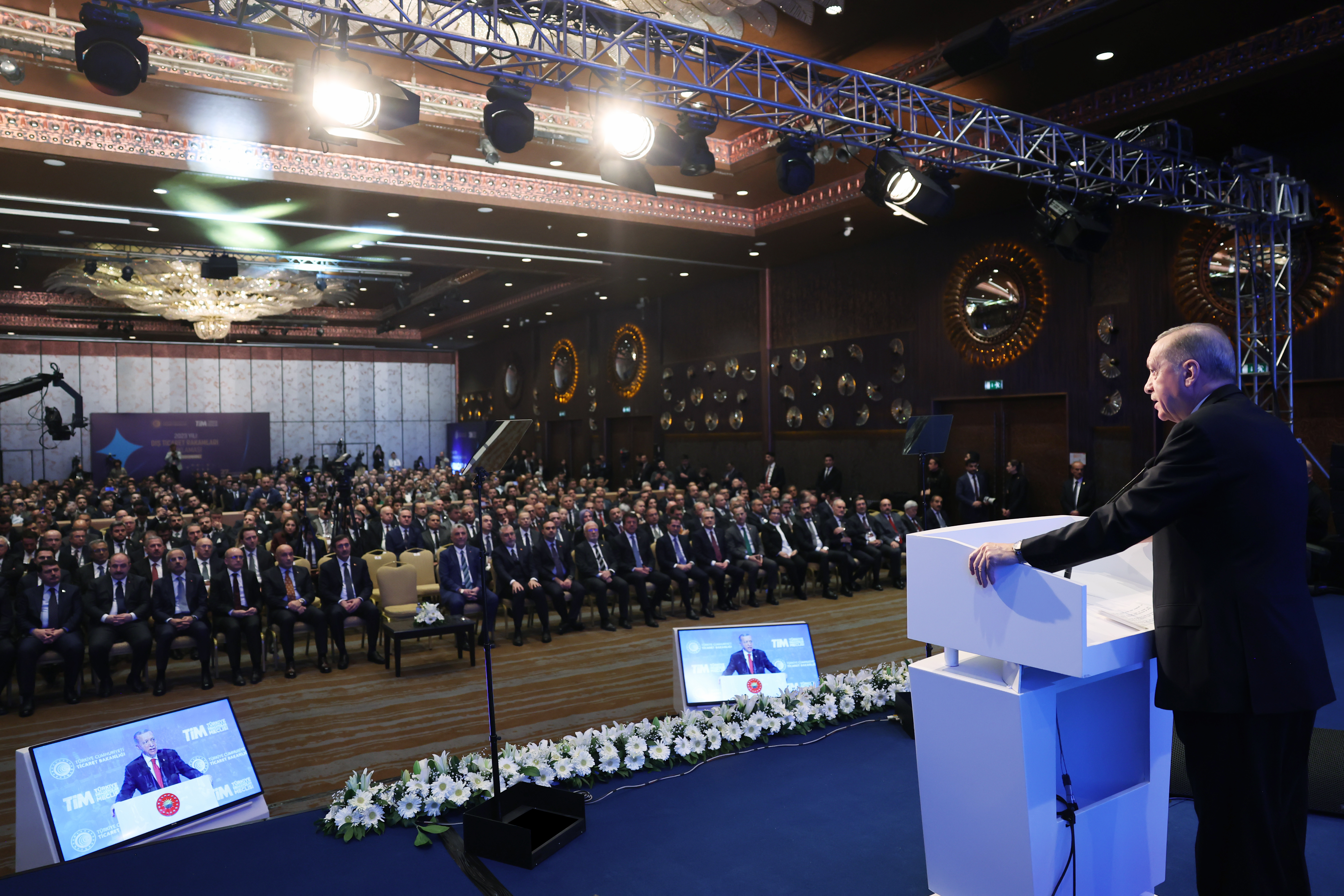 Cumhurbaşkanı Erdoğan, bugün sadece 2023'ün değerlendirmesini yapmadıklarını, aynı zamanda 2024'ün de hedeflerini belirlediklerini ifade ederek, "2024'te mal ve hizmet ihracatımızın 375 milyar doların üstüne çıkabileceğine inanıyoruz. Türkiye, bunu başaracak güce, kabiliyete ve imkâna fazlasıyla sahiptir." dedi.