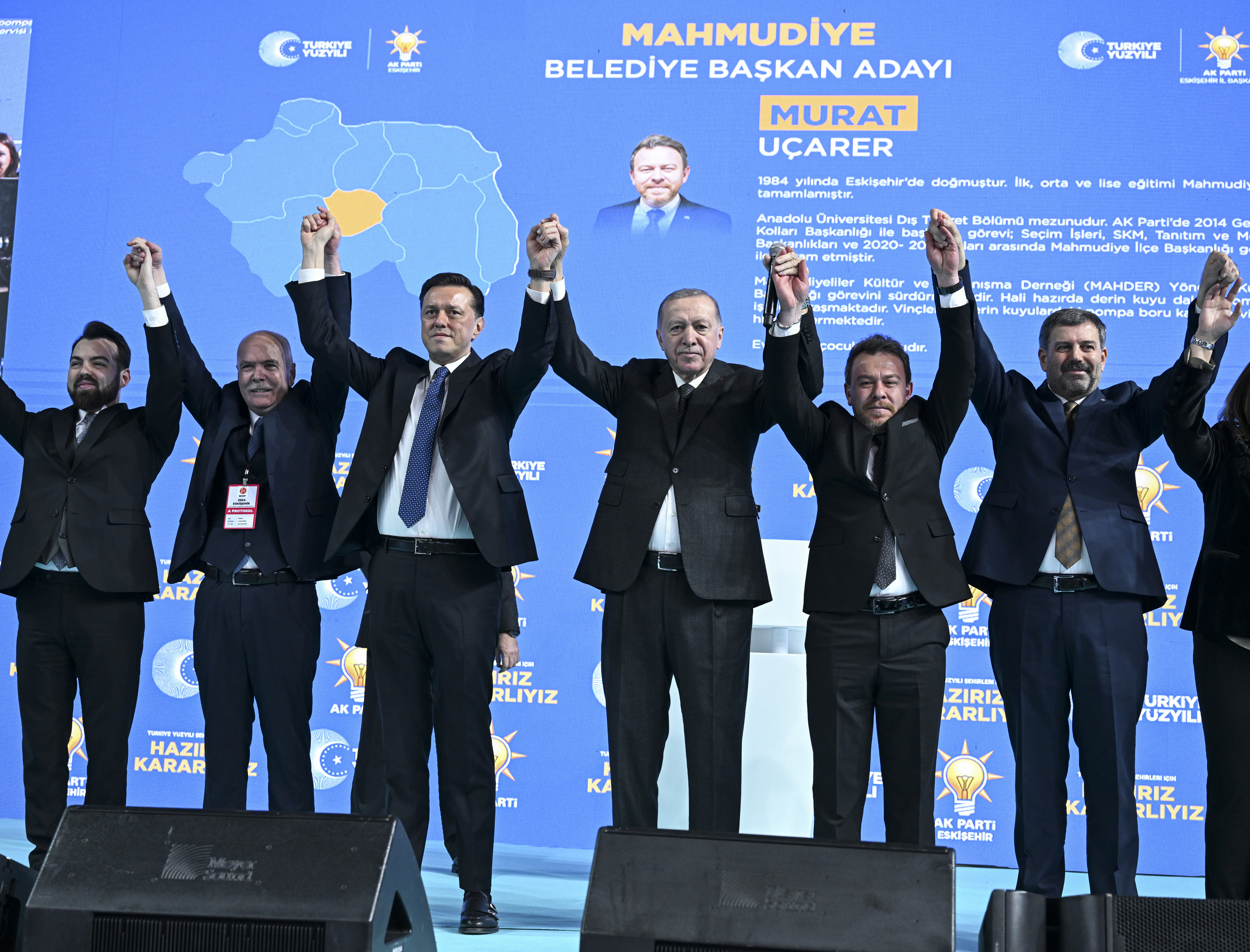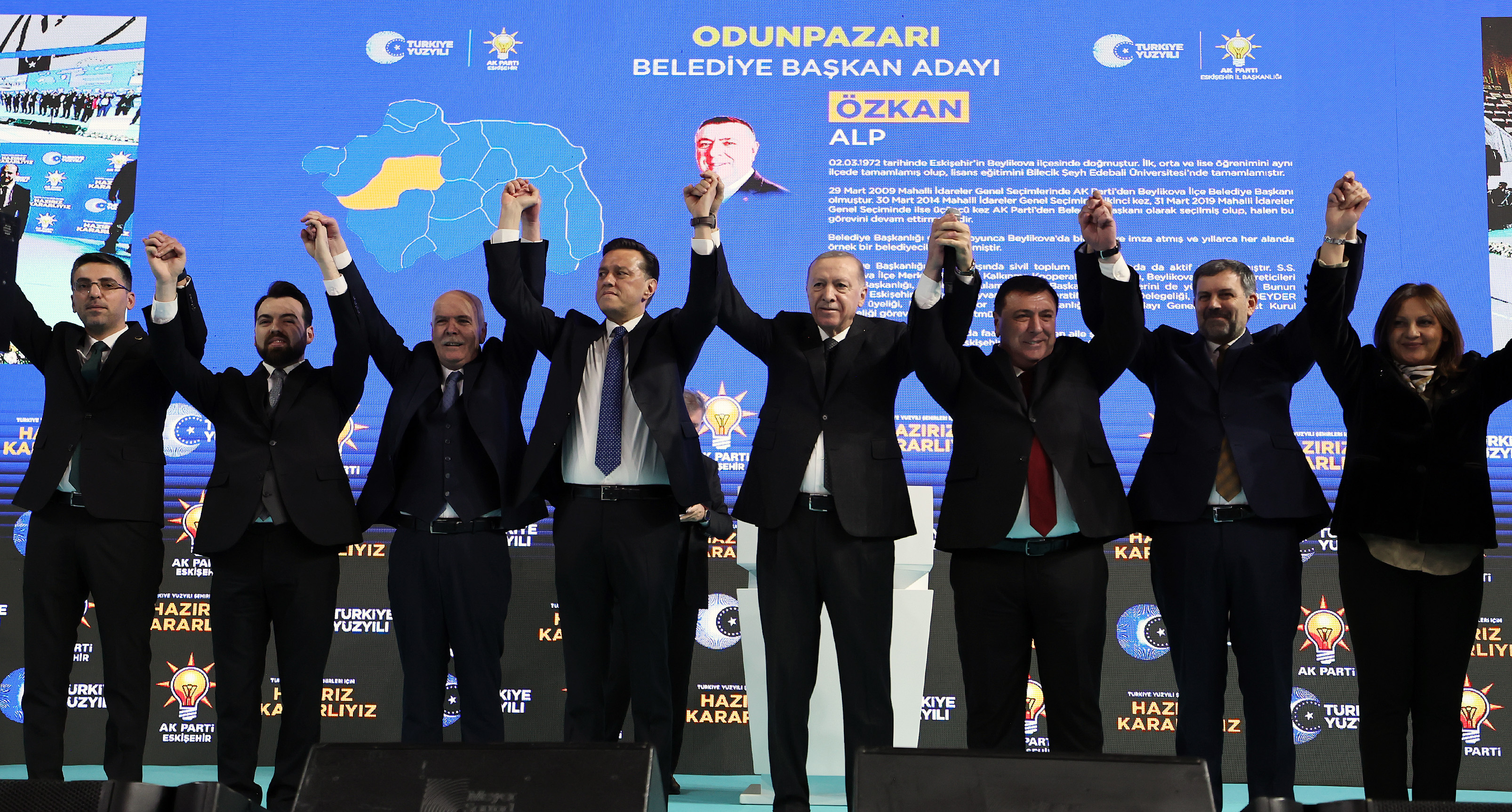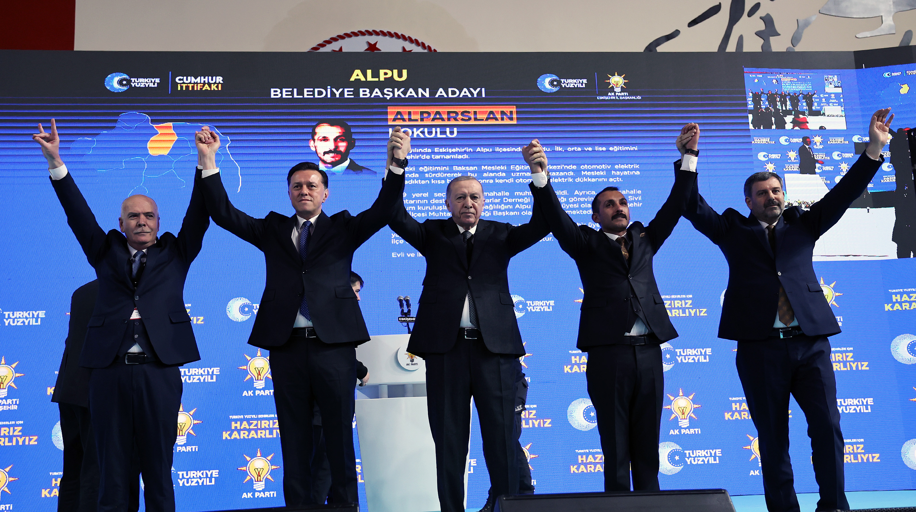 Toplantının yapıldığı salonda "Gökte ay yıldızlı bayrak, Odunpazarı yeniden aklanacak", "Sen uzayı fethetmeye devam et, Tepebaşı zaten bize emanet" pankartı, "Eskişehir tamam inşallah", "Hazırız, kararlıyız" yazısı ile AK Parti ve Türkiye Yüzyılı amblemleri yer aldı.