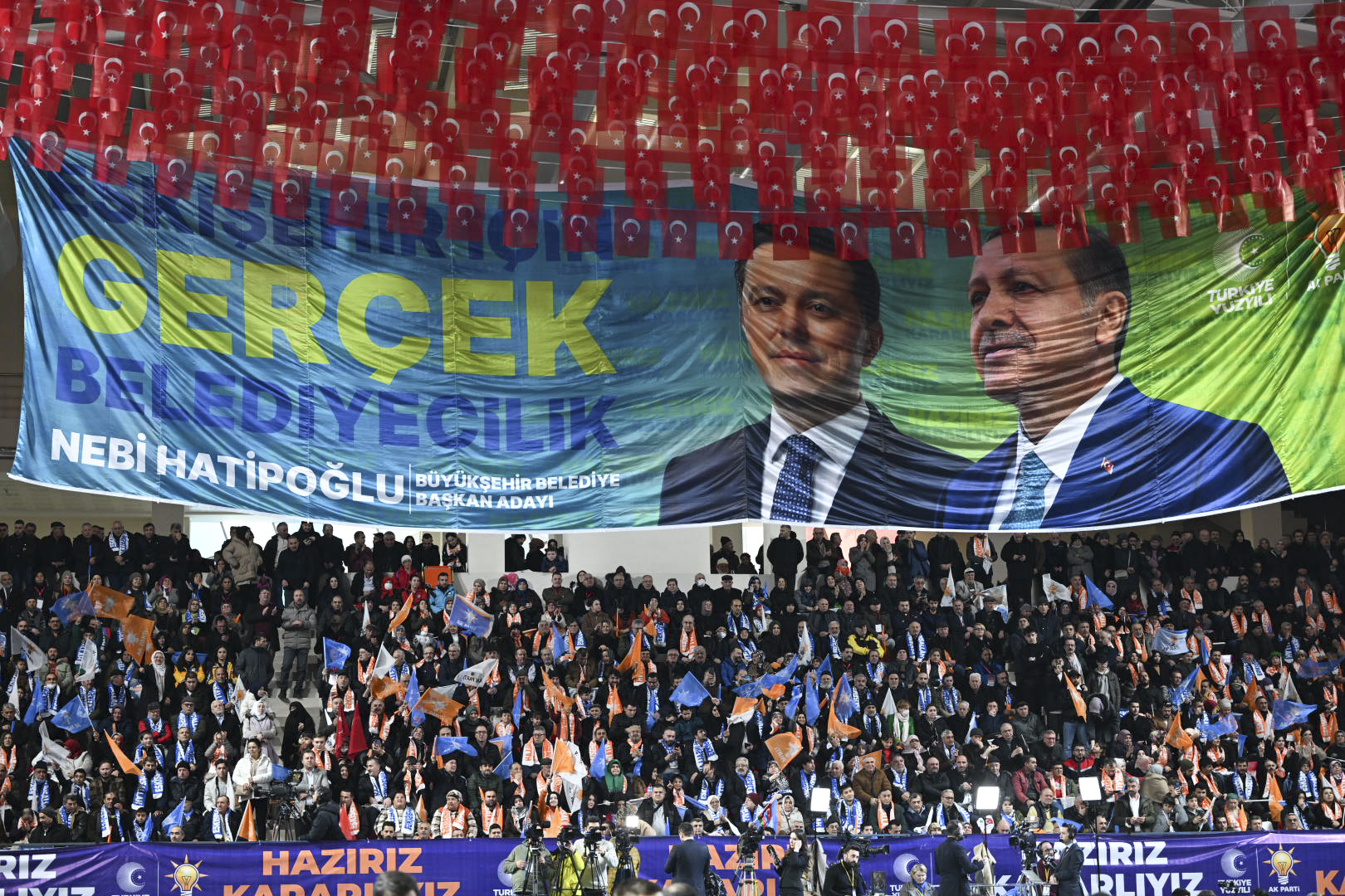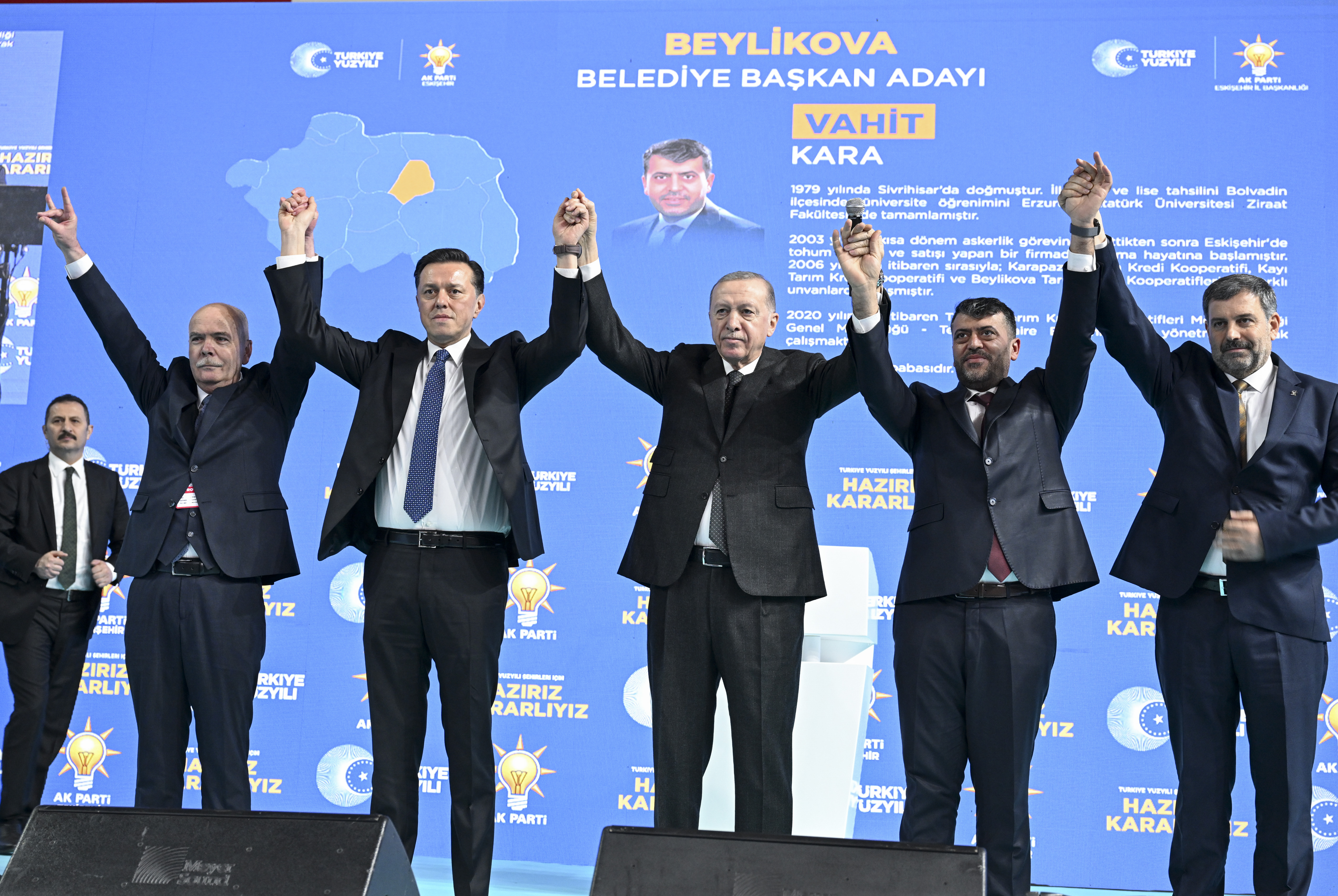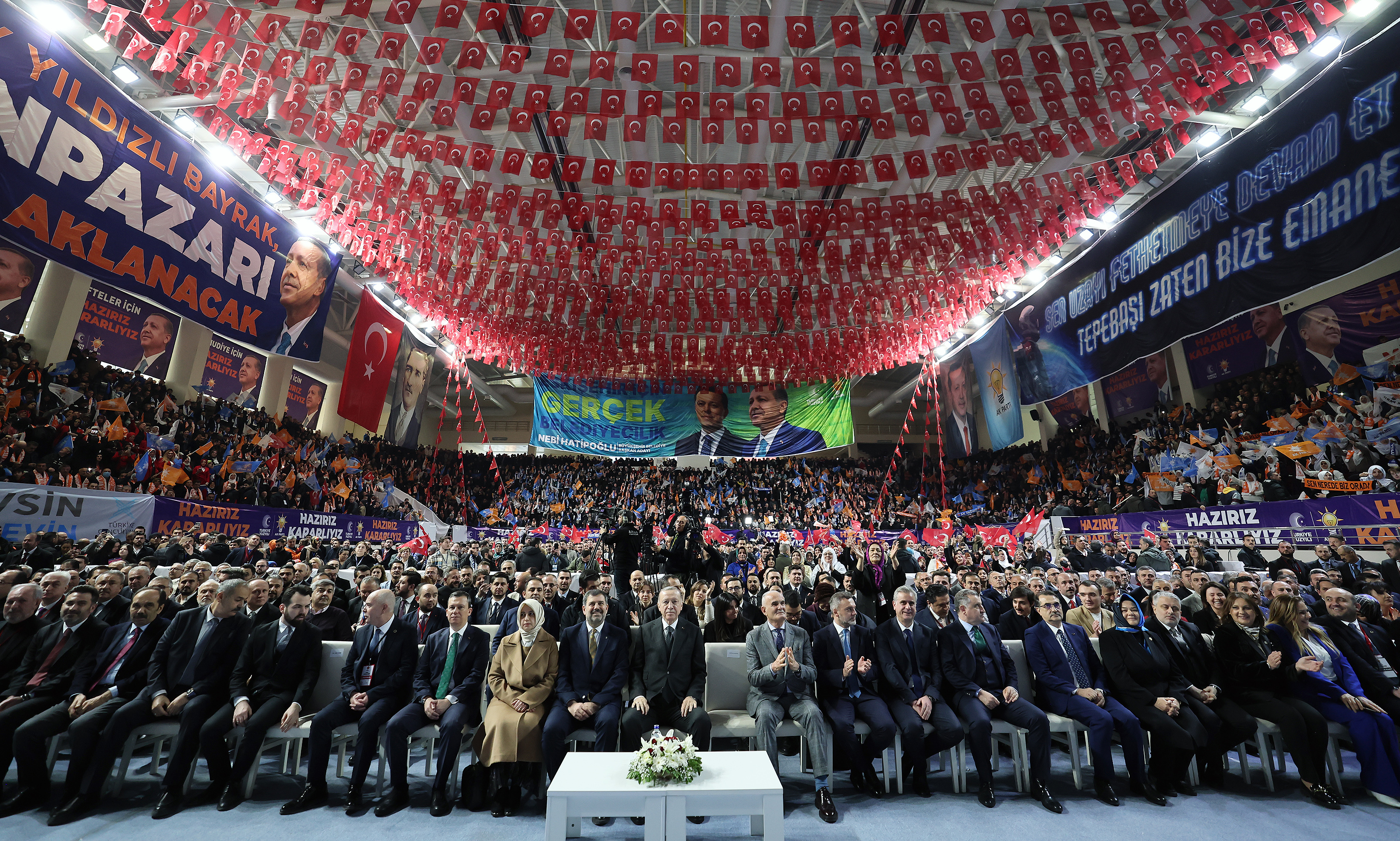 Toplantının yapıldığı salonda "Gökte ay yıldızlı bayrak, Odunpazarı yeniden aklanacak", "Sen uzayı fethetmeye devam et, Tepebaşı zaten bize emanet" pankartı, "Eskişehir tamam inşallah", "Hazırız, kararlıyız" yazısı ile AK Parti ve Türkiye Yüzyılı amblemleri yer aldı.