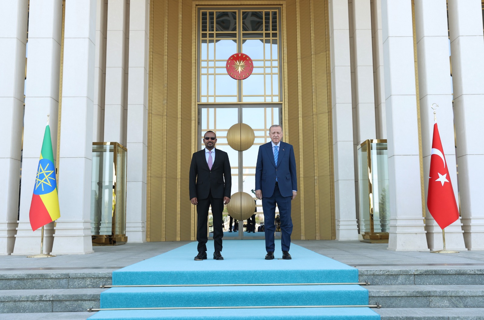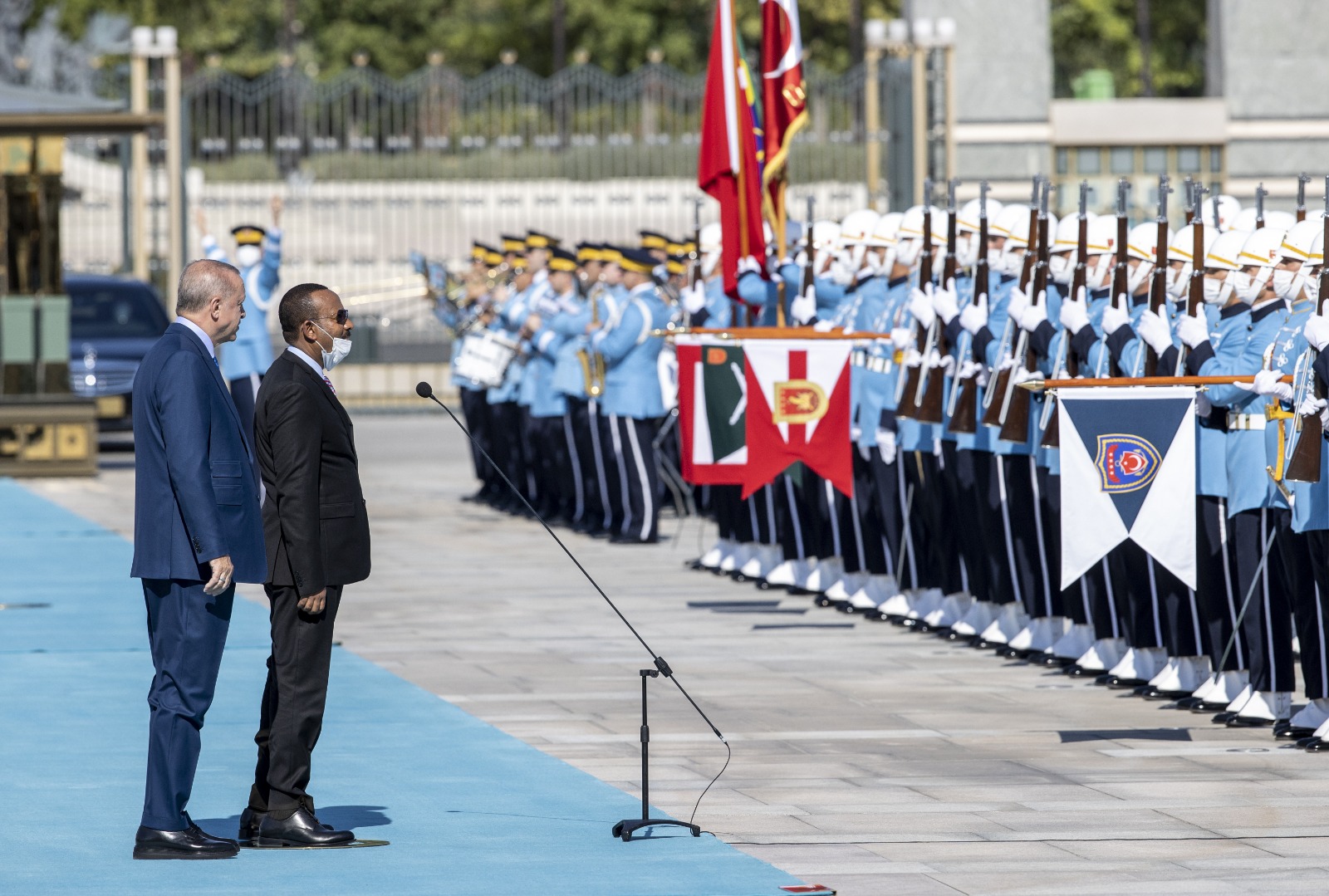 Etiyopya Federal Cumhuriyeti Başbakanı Ali, Muhafız Alayı Tören Kıtası'nı selamladı. Törende, tarihte kurulan 16 Türk devletini temsil eden bayraklar ve askerler de yer aldı. Heyetlerini birbirine takdim eden Cumhurbaşkanı Erdoğan ve Etiyopya Federal Cumhuriyeti Başbakanı Ali, merdivenlerde Türkiye ve Etiyopya bayrakları önünde gazetecilere poz verdi.