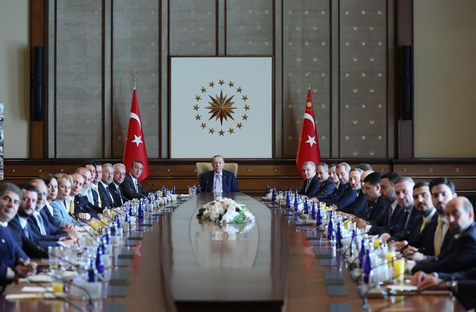 Cumhurbaşkanı Recep Tayyip Erdoğan, Cumhurbaşkanlığı Külliyesi'nde Fenerbahçe Spor Kulübü Başkanı Ali Koç ve beraberindeki yönetim kurulu üyelerini kabul etti.