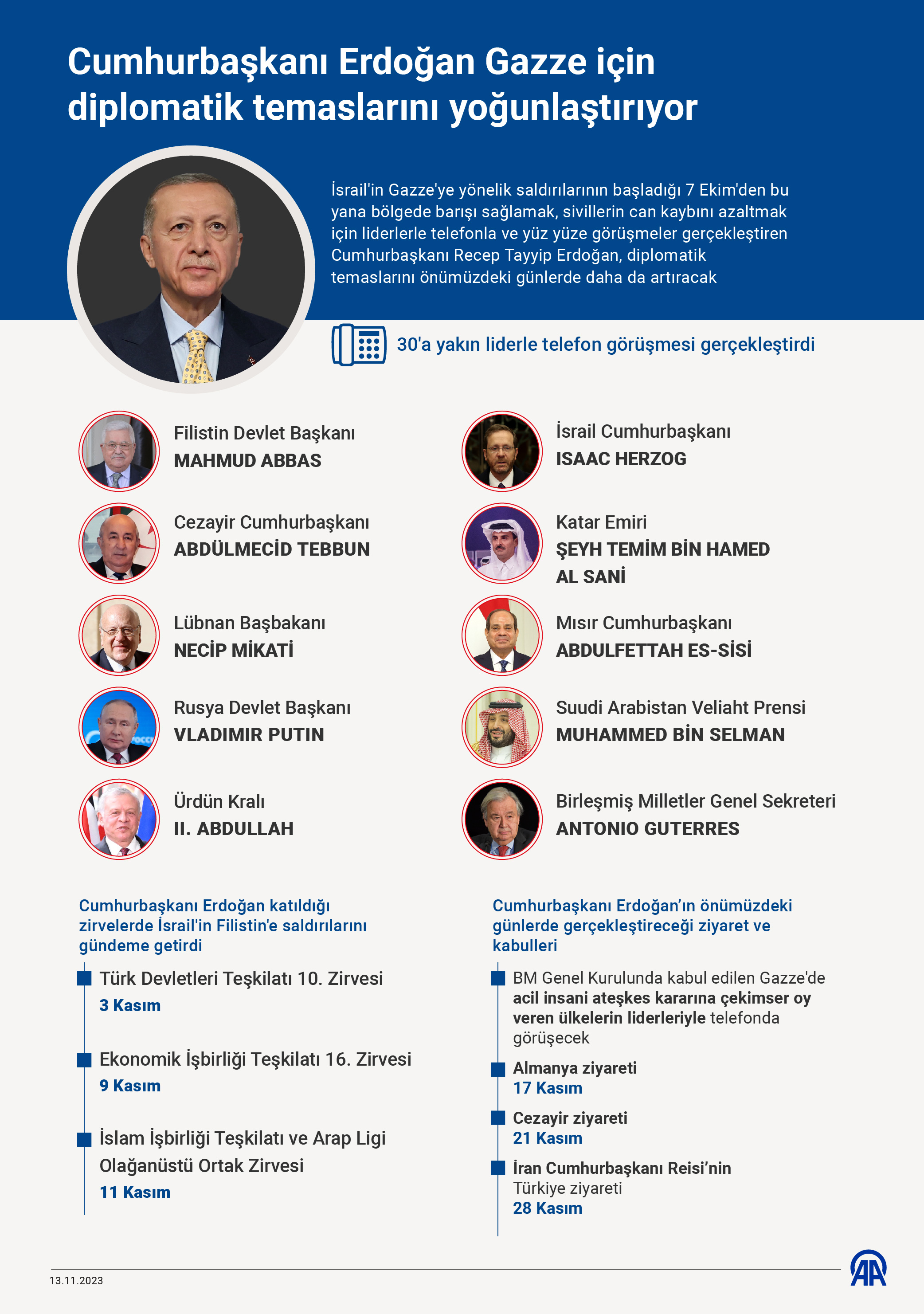 Cumhurbaşkanı Erdoğan, İsrail'in Gazze'ye yönelik saldırılarının başladığı ilk günden bu yana, Filistin Devlet Başkanı Mahmud Abbas, İsrail Cumhurbaşkanı Isaac Herzog, Birleşmiş Milletler Genel Sekreteri Antonio Guterres, Mısır Cumhurbaşkanı Abdulfettah es-Sisi, Lübnan Başbakanı Necip Mikati, Katar Emiri Şeyh Temim bin Hamed Al Sani, Rusya Devlet Başkanı Vladimir Putin, Ürdün Kralı 2. Abdullah, Cezayir Cumhurbaşkanı Abdülmecid Tebbun ve Suudi Arabistan Veliaht Prensi Muhammed bin Selman'ın da aralarında bulunduğu 30'a yakın liderle telefon görüşmesi gerçekleştirdi.