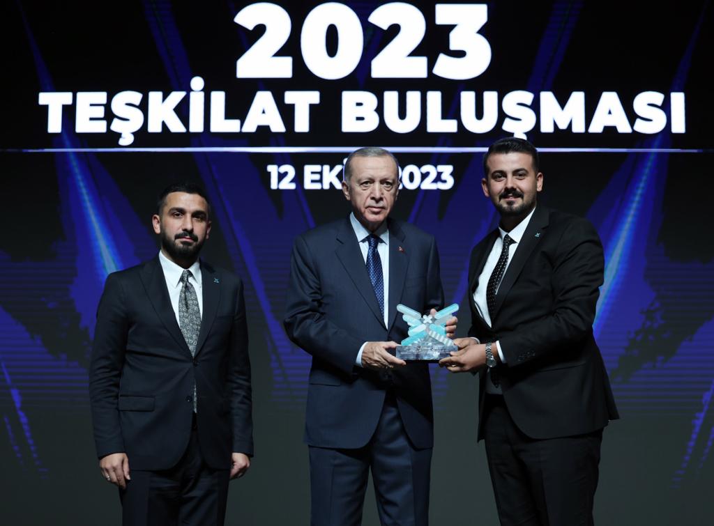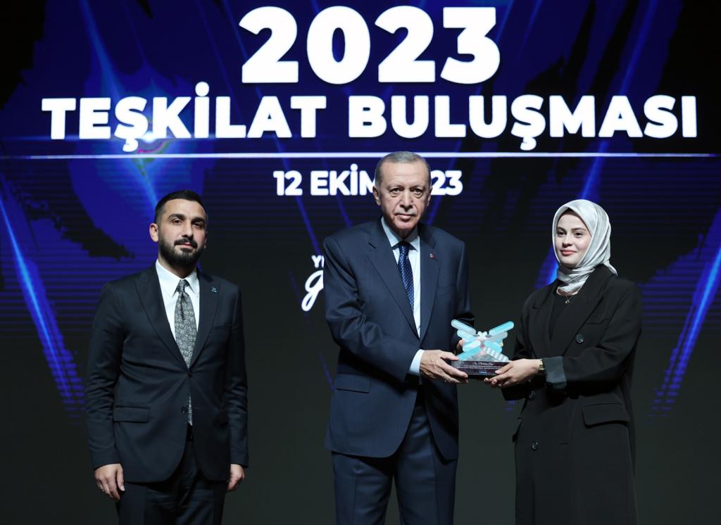 Cumhurbaşkanı Erdoğan da konuşmasının ardından TÜGVA gönüllüsü gençlere plaketlerini verdi.
