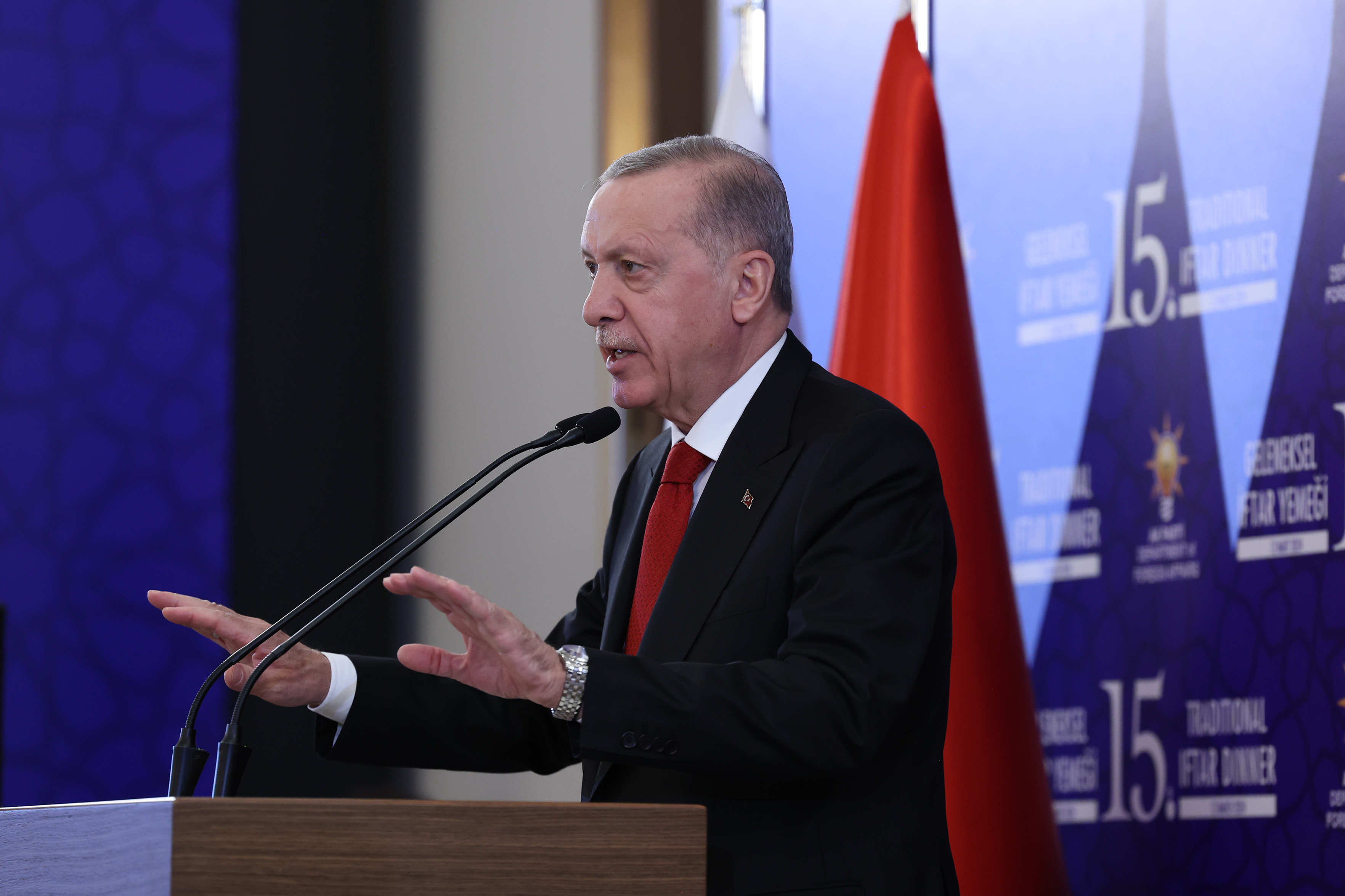 "Sizlerle son iftarımızda Türkiye 14 ve 28 Mayıs'ta (2023) yapılan genel seçimlerin hemen arifesinde bulunuyordu. İftarımızda sizlere dalga dalga büyüyen zaferin ayak seslerini duyduğumuzu söylemiştik. Yaşadığımız asrın felaketi 6 Şubat (2023) depremlerine rağmen mayıs seçimlerini yüzde 90'ları bulan rekor katılım oranıyla tam bir demokrasi şöleni havasında gerçekleştirdik. Seçimlerin ikinci turunda yüzde 52'yi aşan oy oranıyla aziz milletimizden beş sene daha Türkiye'ye ve kendisine hizmet etme yetkisi aldık. Tıpkı geçen seneki gibi bugünkü iftar programımızı da yine bir seçim sürecinde yapıyoruz."