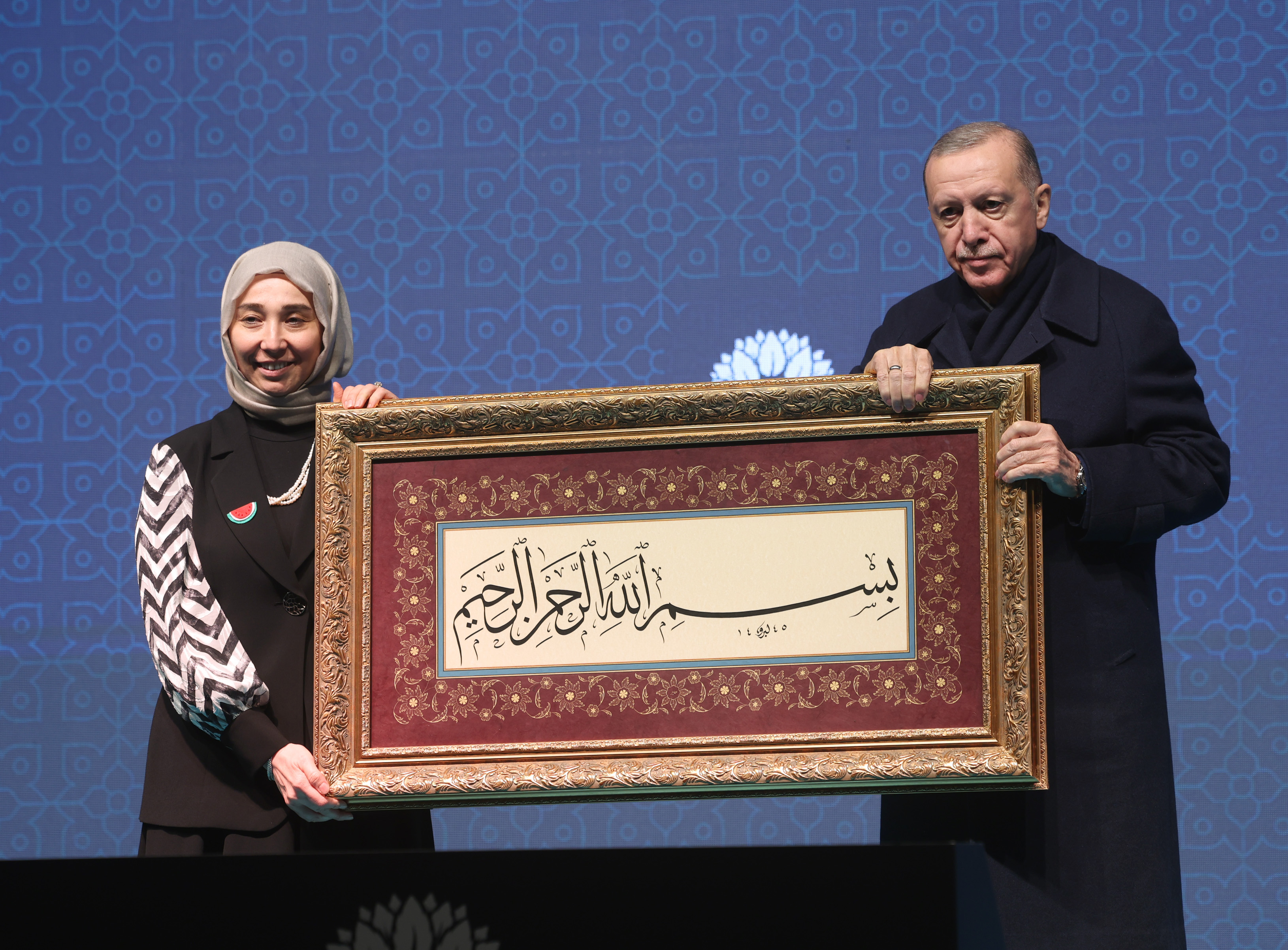 Altun, TÜRGEV'in hat ve tezhip atölyesinde yapılan, üzerinde besmelenin bulunduğu tablo ile TÜRGEV Güzel İşler Fabrikası öğrencileri tarafından üretilen Cuma selamlığı kokusunu Cumhurbaşkanı Erdoğan'a hediye etti.