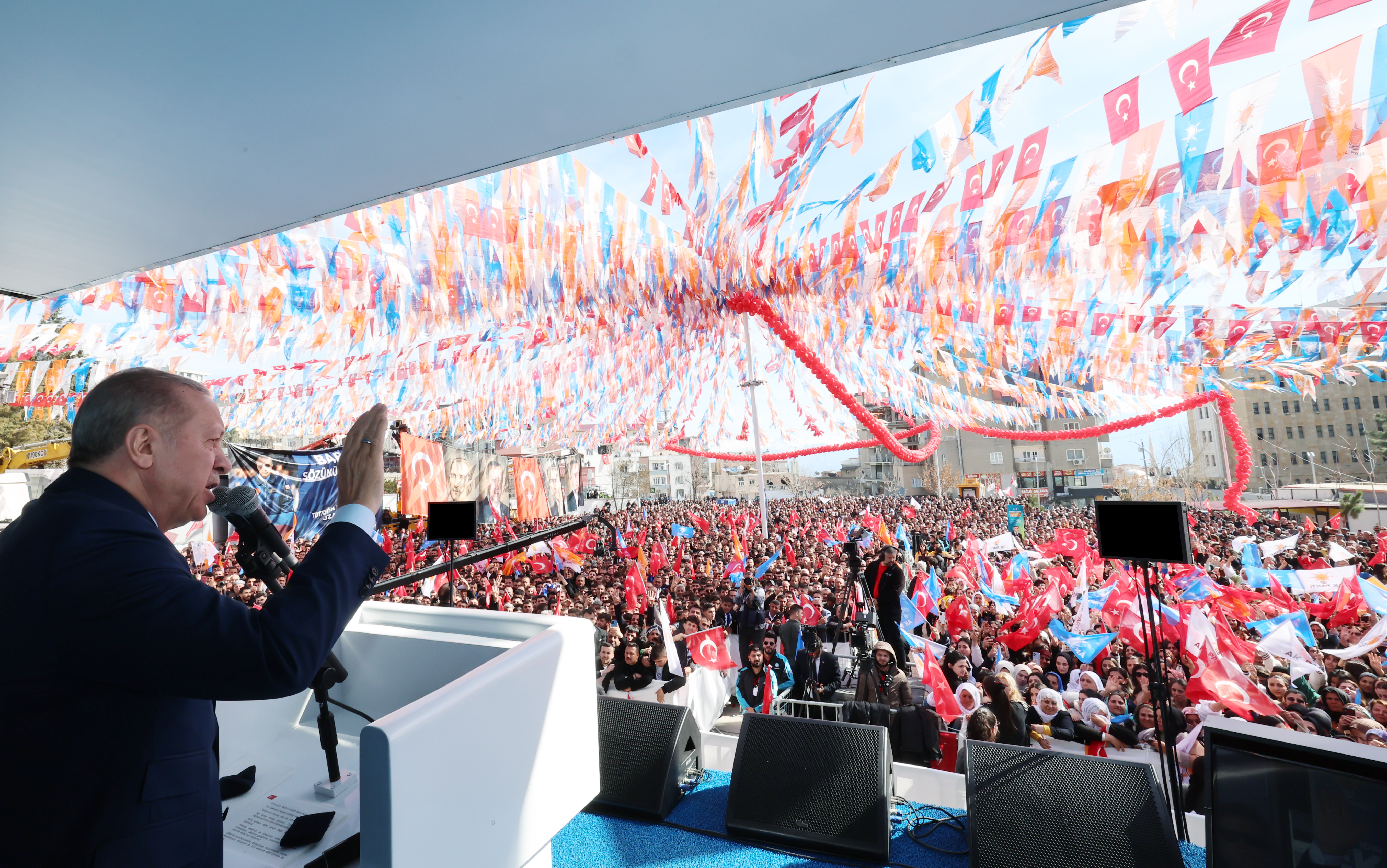 Cumhurbaşkanı Erdoğan, alandakilere, "Serhat şehrimiz, tarih ve medeniyet şehri Şırnak, 31 Mart'ta Türkiye Yüzyılı şehirleri için hazır mıyız? 31 Mart'ta Türkiye Yüzyılı şehirleri için kararlı mıyız? 31 Mart'ta gerçek belediyeciliği tercih ediyor muyuz? Bunun için seçim gününe kadar ana kademe, kadın kolları, gençler kapı kapı dolaşmaya var mıyız? Kadın kolları var mıyız? Şırnak'la birlikte Türkiye haritasının tamamını Cumhur İttifakı'nın renkleriyle boyamaya var mıyız?" diye sordu.