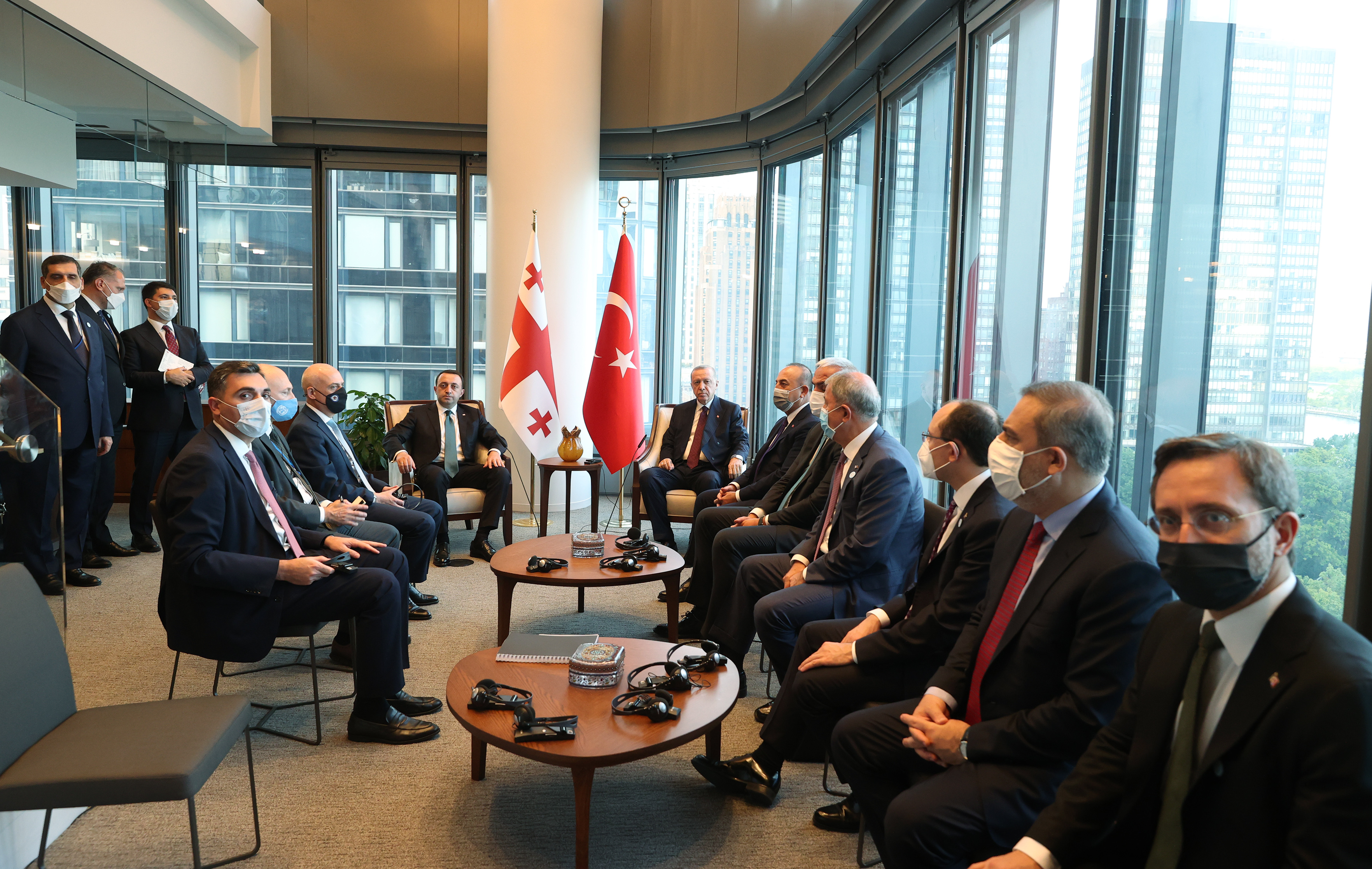Birleşmiş Milletler (BM) 76. Genel Kurulu'na katılmak üzere New York'ta bulunan Cumhurbaşkanı Erdoğan'ın Garibaşvili'yi kabulü, Yeni Türkevi'nde yaklaşık 25 dakika sürdü.
