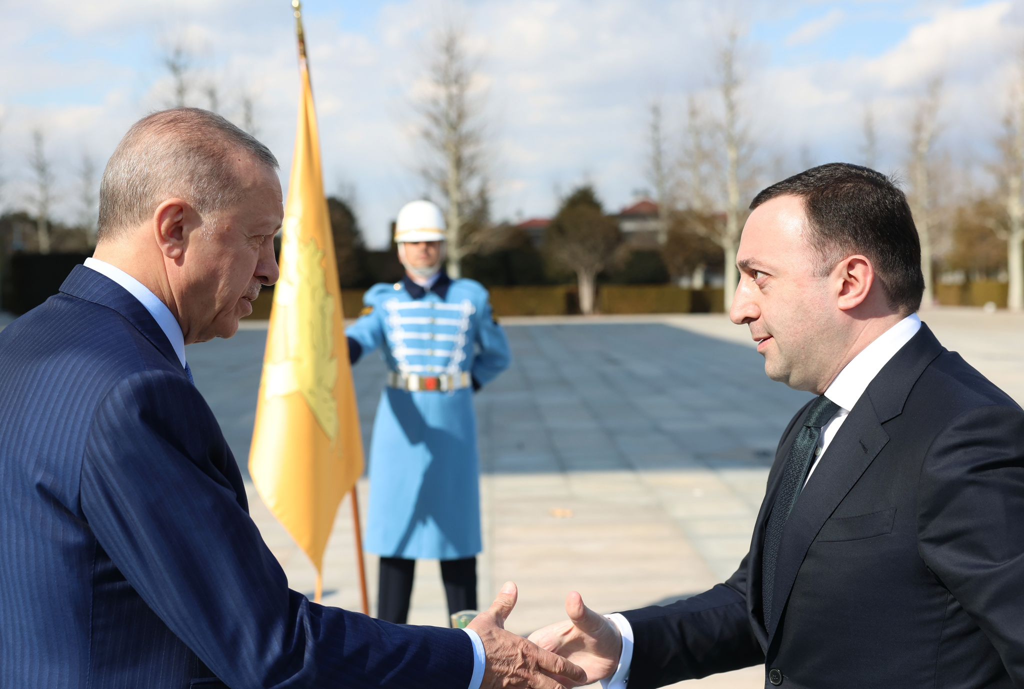 Tarihte kurulan 16 Türk devletini temsil eden bayraklar ve askerlerin de yer aldığı karşılamada, Cumhurbaşkanı Erdoğan ve Garibaşvili, merdivenlerde Türkiye ve Gürcistan bayrakları önünde gazetecilere poz verdi.