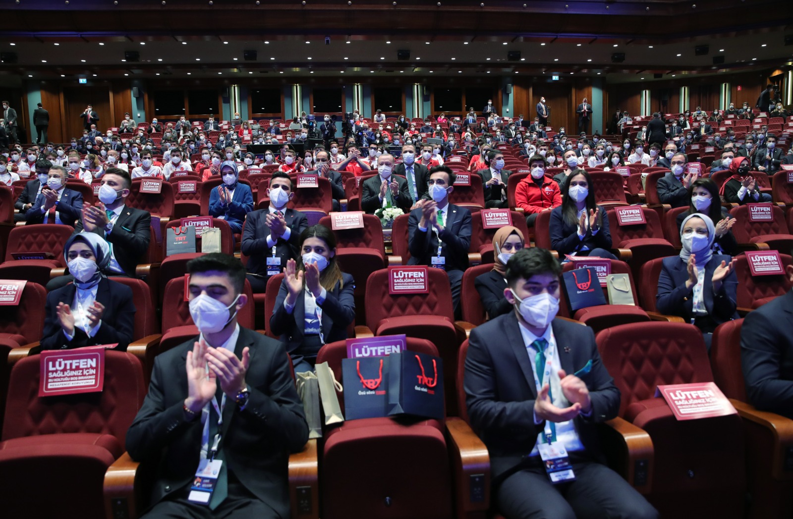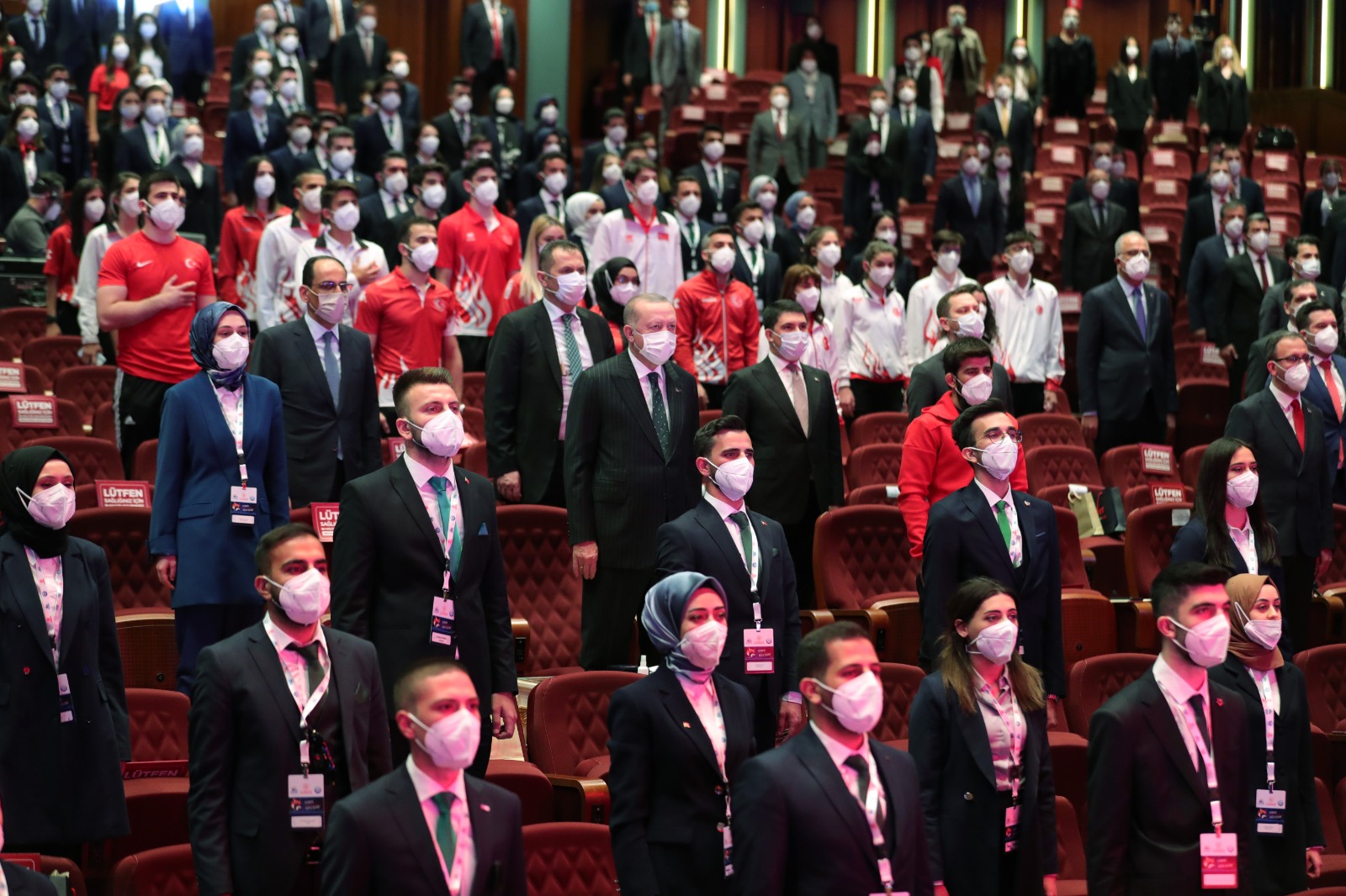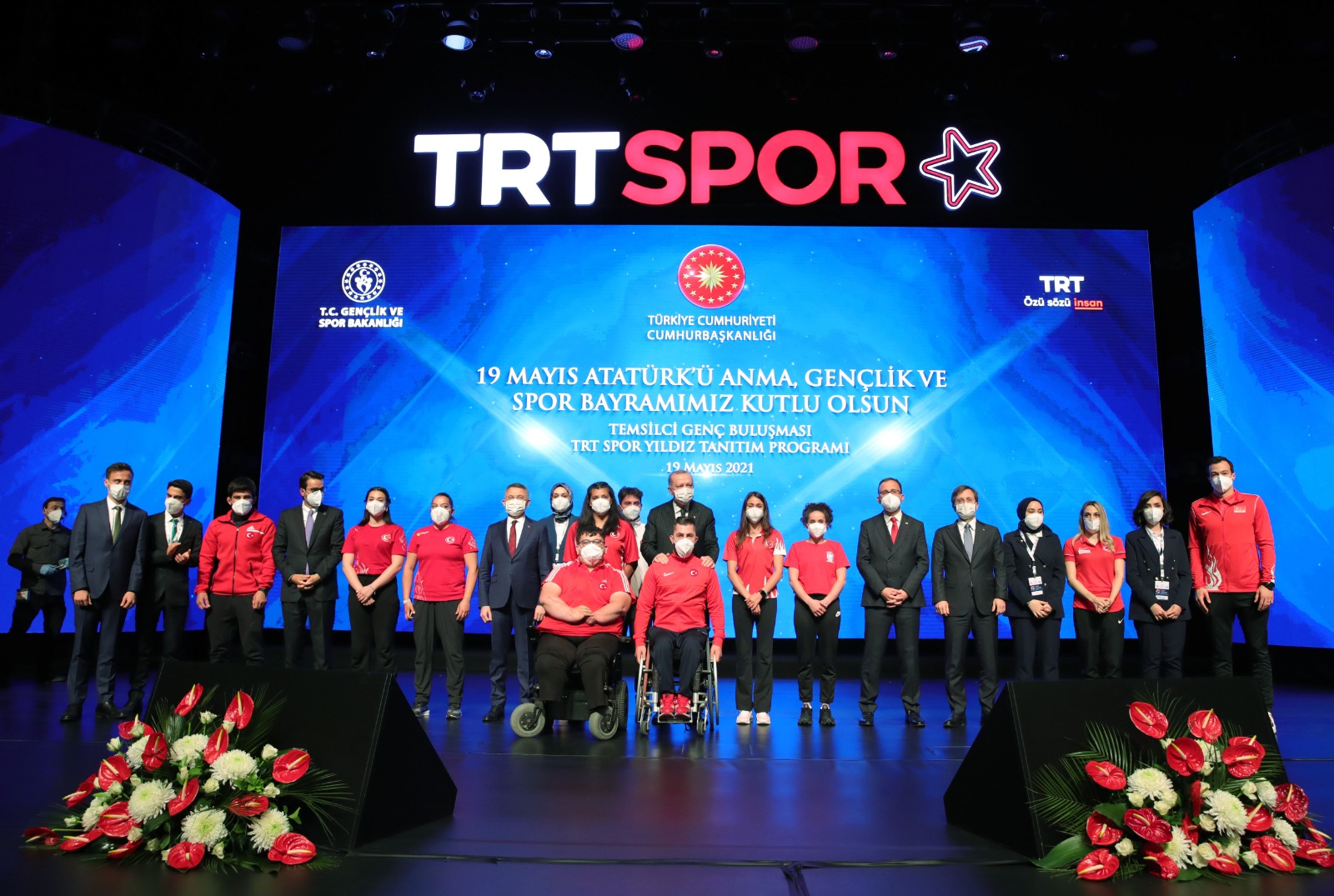 Cumhurbaşkanı Erdoğan ve beraberindeki Cumhurbaşkanı Yardımcısı Fuat Oktay, Gençlik ve Spor Bakanı Mehmet Muharrem Kasapoğlu, Cumhurbaşkanlığı İletişim Başkanı Fahrettin Altun ve TRT Genel Müdürü İbrahim Eren sporcu gençlerle hatıra fotoğrafı çektirdi.