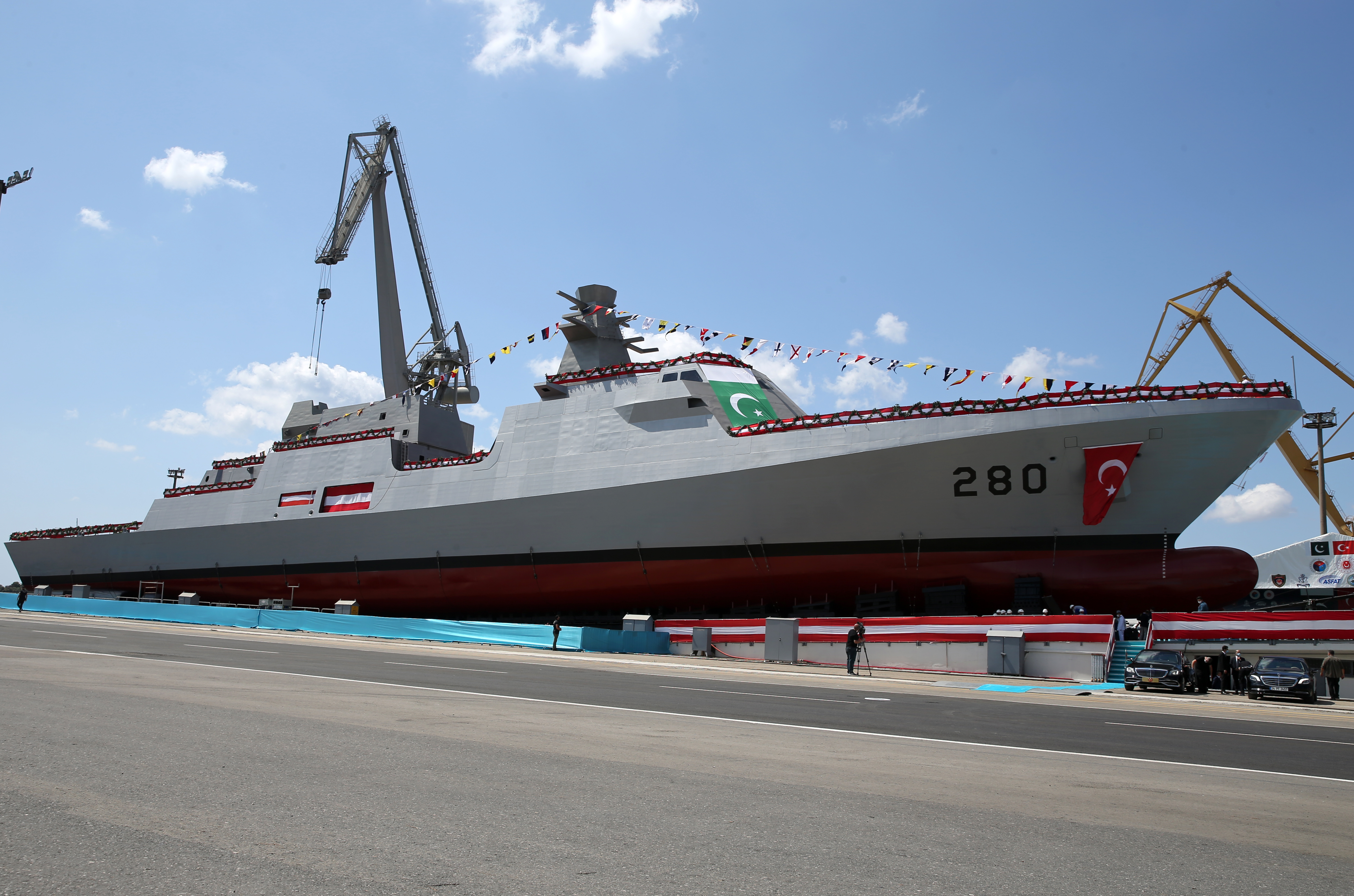 "Bunların 2'si ülkemizde, 2'si ise Pakistan'da üretilecek. Korvetlerde kullanılacak ilave teknoloji ve teçhizatlar da yine ülkemiz savunma sanayi ürünleri arasından seçilecek. Sac kesme törenini 2019 yılında yaptığımız ilk geminin bugün suya indirme merasimini gerçekleştiriyoruz. İkinci gemiyi kızağa koyma töreni de nisan ayında yapıldı. Pakistan'da üretilecek olan 3. geminin omurgasının kızağa indirilmesi töreni geçtiğimiz yılın ekim ayında, 4. geminin sac kesme töreni de bu yılın haziran ayında icra edilmişti. Sözleşmesi yaklaşık 3 yıl önce imzalanan bu projeye göre, 2025 yılına kadar korvetlerin teslimatı tamamlanacak. Görüldüğü gibi, tüm gemilerin üretim süreçleri planlandığı şekilde yürüyor. Pakistan'ın her kazanımını kendi kazanımımız olarak görüyoruz. Milli Savunma Bakanlığımızın savunma sanayi alanında iş birliği yaptığı 80'e yakın ülke arasında, Pakistan'ın ayrı bir yeri vardır. Diğer alanlardaki ilişkilerimizi de arzu ettiğimiz seviyeye çıkararak bölgemizde ve dünyada örnek bir dayanışma ortaya koymayı sürdüreceğiz.
