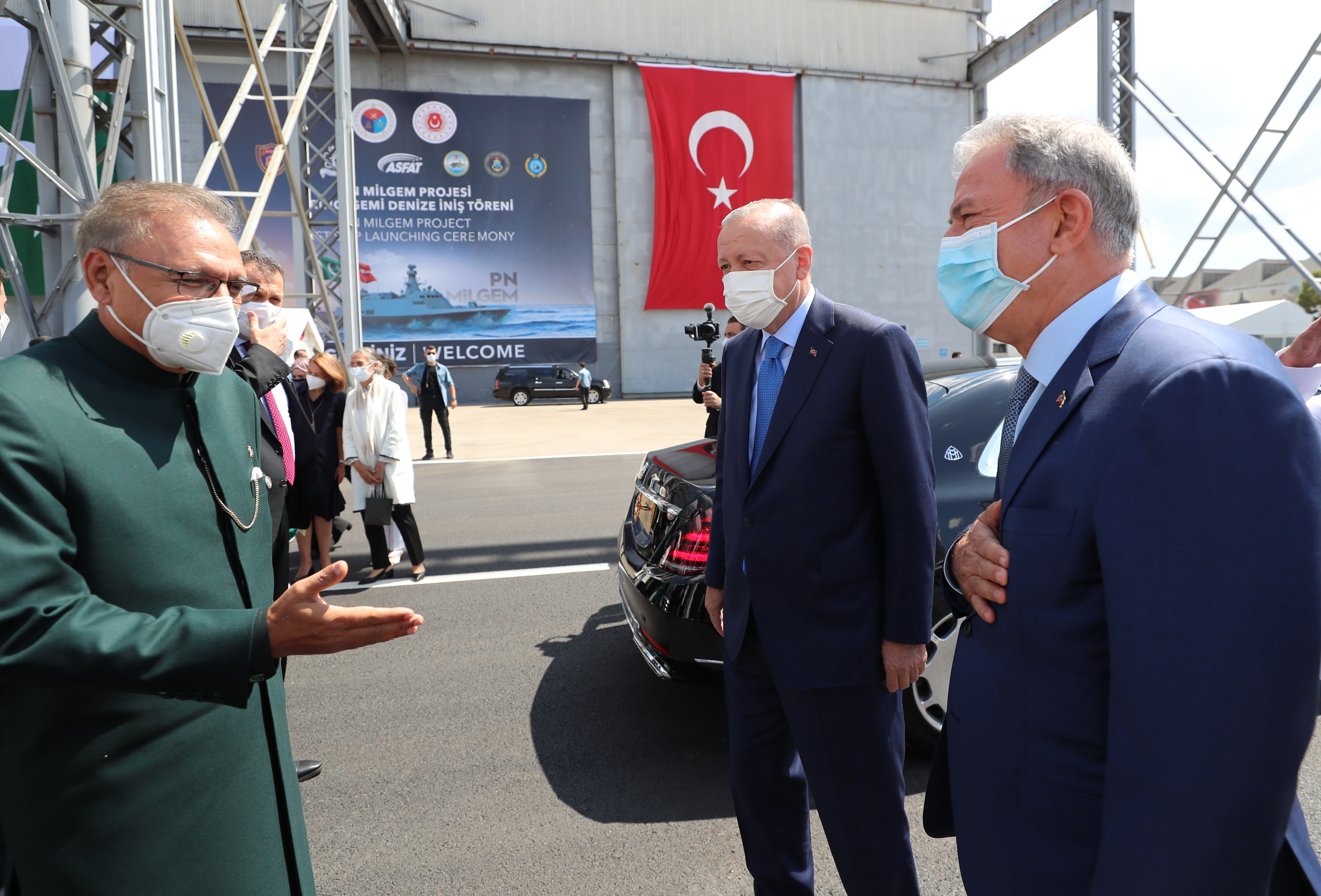 "Savunma sanayi alanında bugün ilk gemisinin açılışını yapmakta olduğumuz MİLGEM korvetleri yanında ATAK helikopterleri ve eğitim uçakları gibi çok başarılı ortak iş birliği projeleri bulunuyor. Savunma sanayi alanındaki ortaklığımızı daha da ilerletmek konusunda mutabıkız. Pakistan ile aramızdaki güçlü siyasi ilişkilerimizin ve savunma sanayimizdeki iş birliğimizin ticari ilişkilerimize yansımasını istiyoruz. Bu konuda hepimize yardımcı olacak bir yol haritasını Pakistan ile Şubat 2020'de İslamabad'da imzaladık. Kurumlarımız, bu eylem planının hayata geçirilmesi için çalışmalarına devam ediyor.