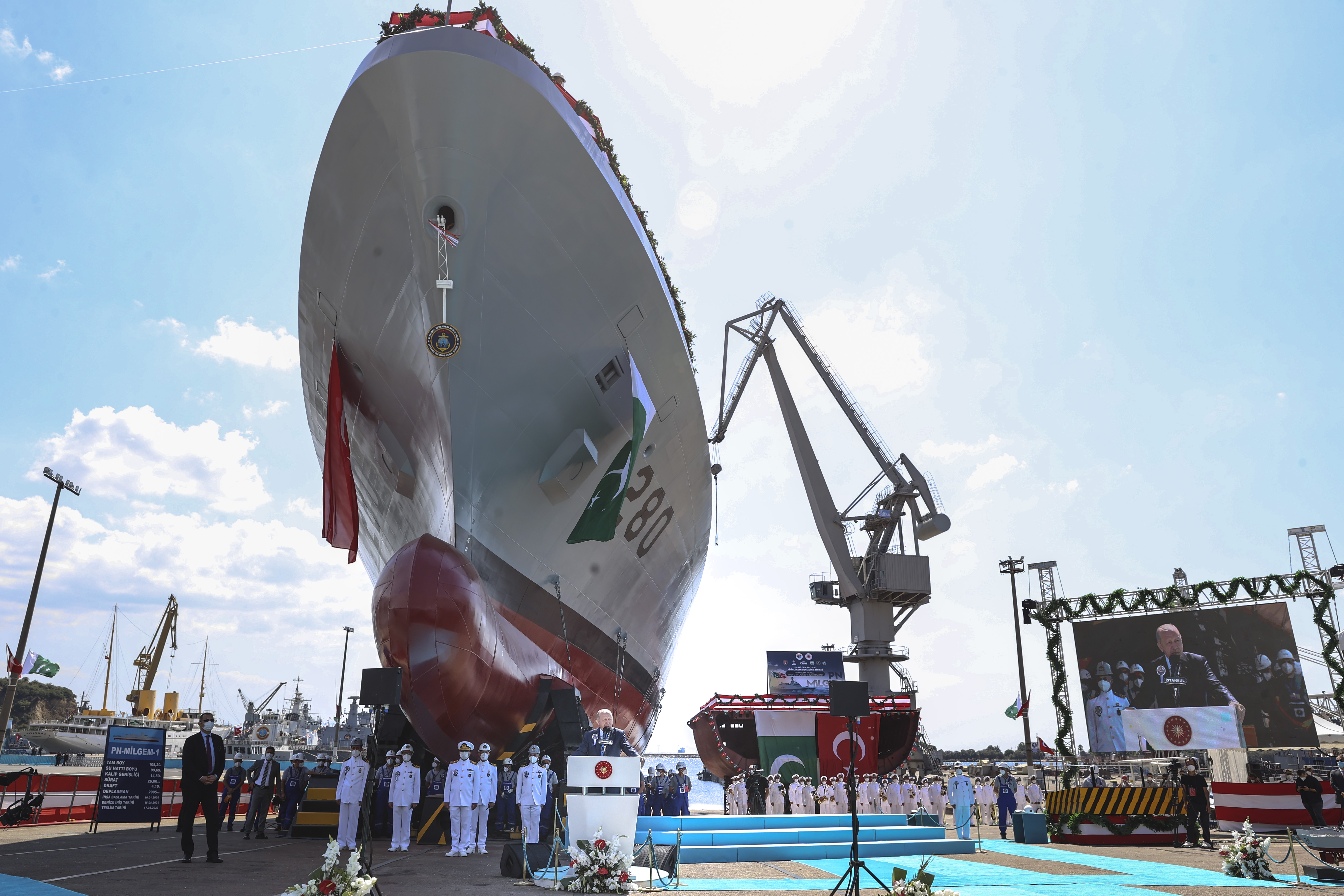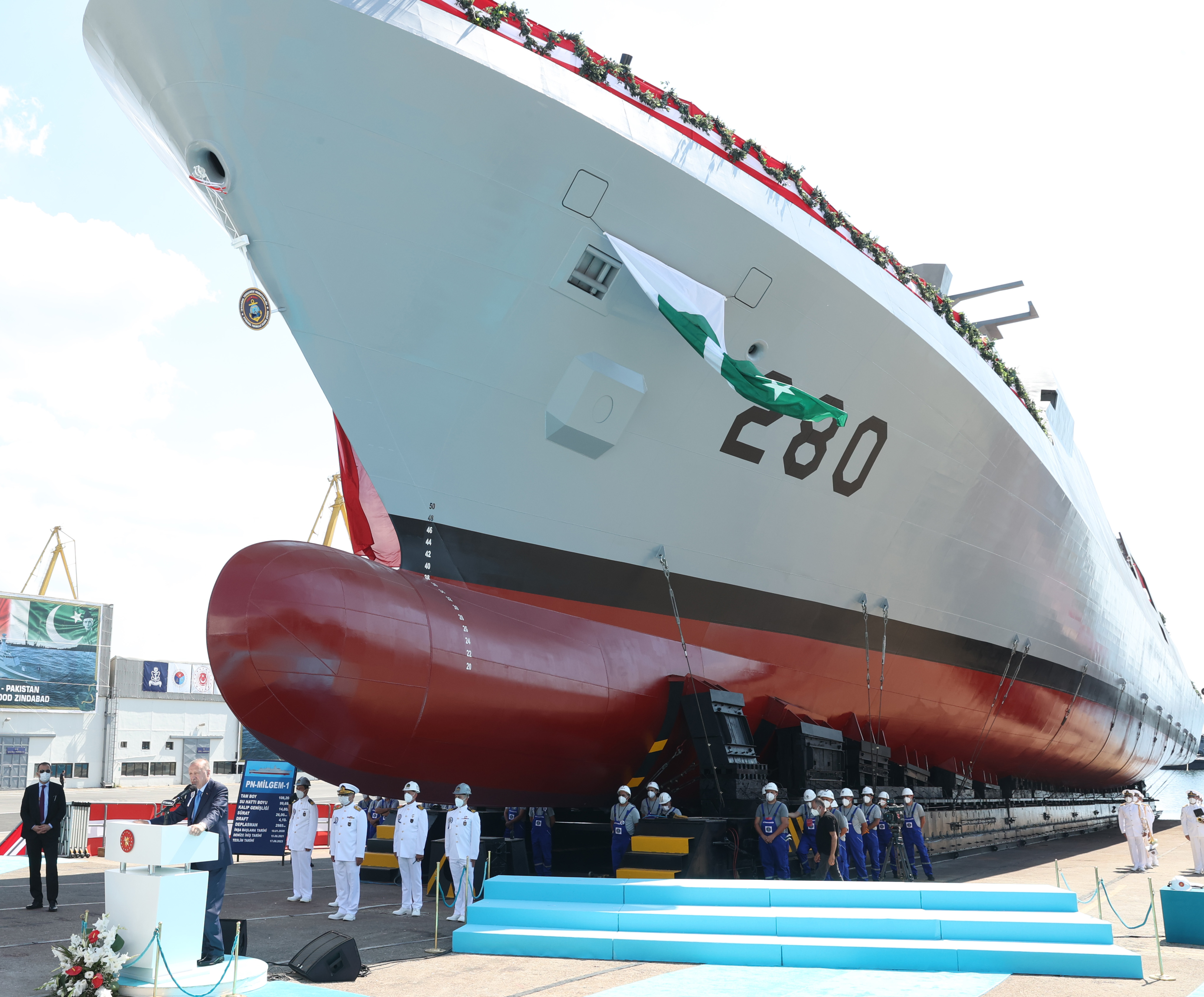 Denize indirdikleri korvetin, Pakistanlılara hayırlı olmasını dileyen Cumhurbaşkanı Erdoğan, projenin hayata geçmesinde emeği olanları tebrik etti.