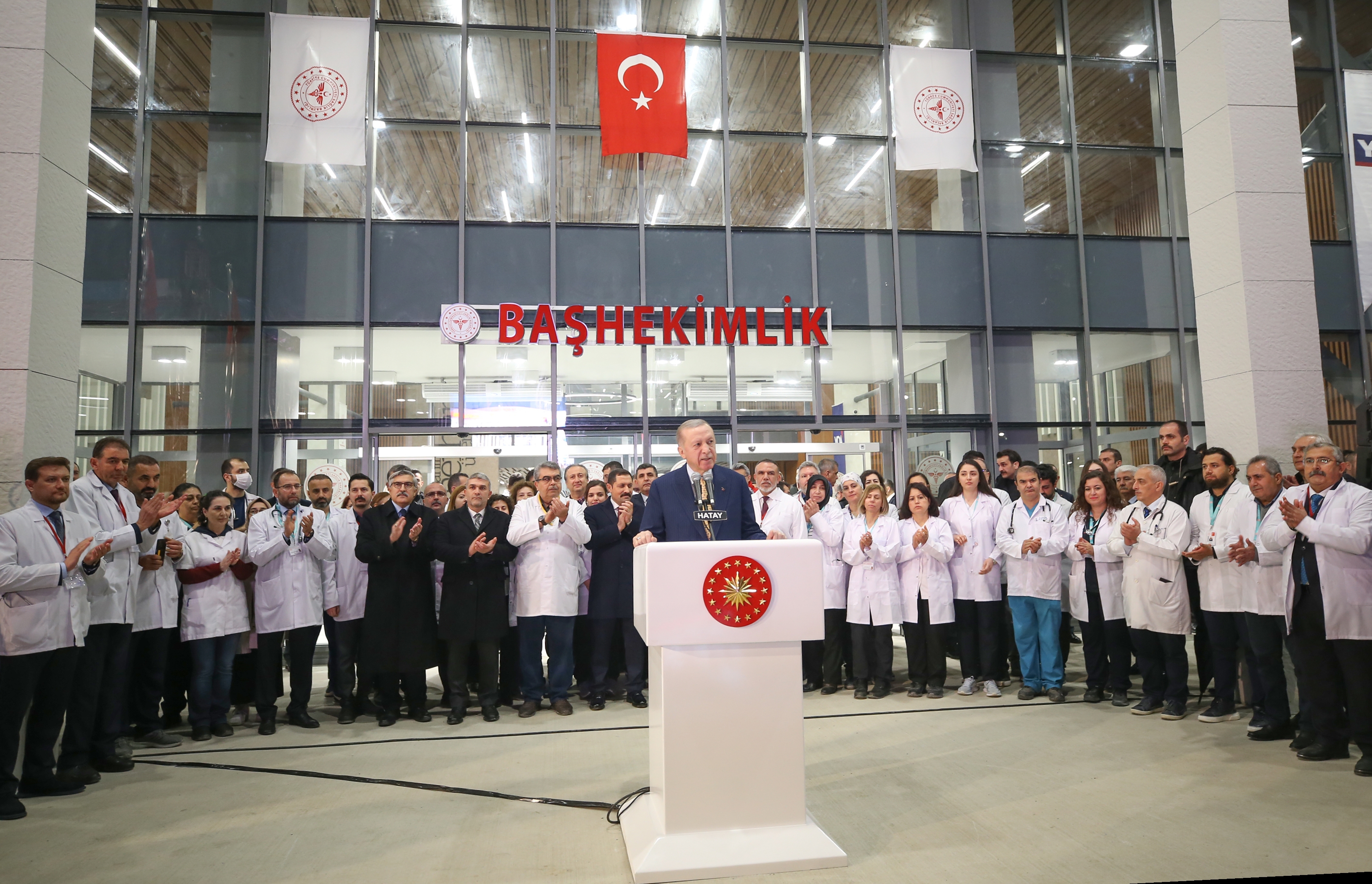 Cumhurbaşkanı Recep Tayyip Erdoğan, Hatay Eğitim ve Araştırma Hastanesi ile İskenderun Devlet Hastanesi Açılış Töreni'nde, deprem konutlarının inşasının Hatay'ın dört bir yanında devam ettiğini söyledi.