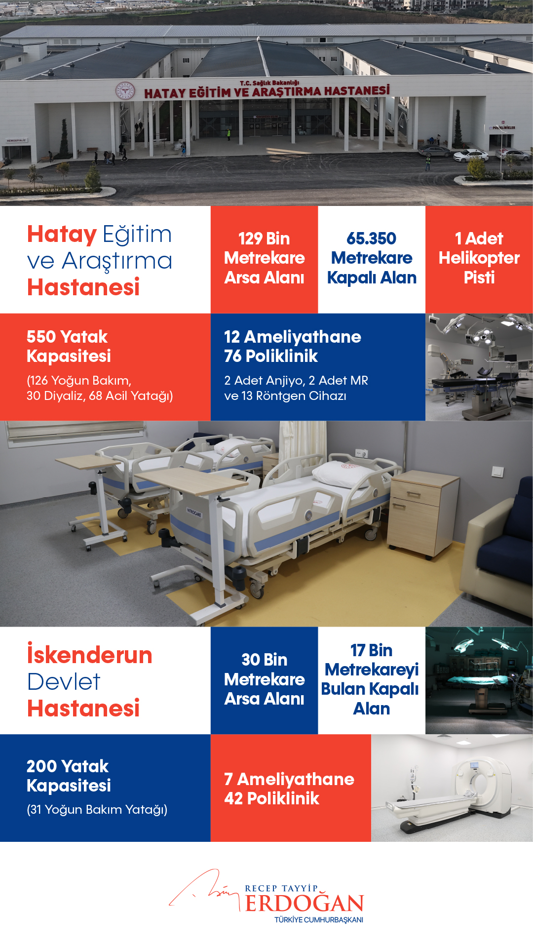 Hastanede 12 ameliyathane, 76 poliklinik, 2 anjiyografi, 2 MR ve 13 röntgen cihazı bulunduğunu belirten Cumhurbaşkanı Erdoğan, diyaliz ünitesinden yanık merkezine, tam kapsamlı laboratuvardan fizik tedavi ve rehabilitasyon ünitesine, anjiyo ve onkoloji ünitesinden inme ve kalp merkezine pek çok özellikli hizmetin sunulduğu hastanenin Hatay'a hayırlı olmasını diledi.