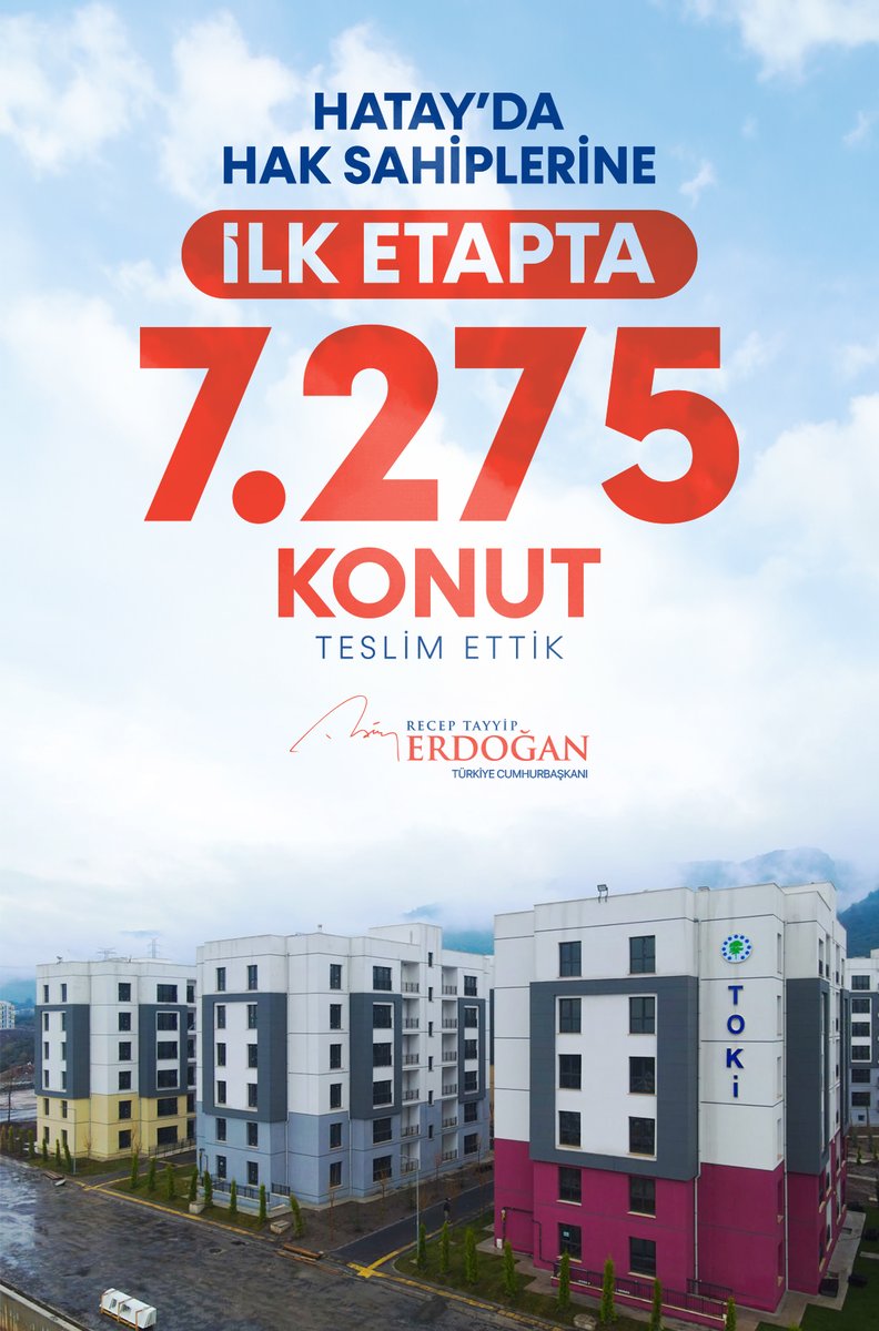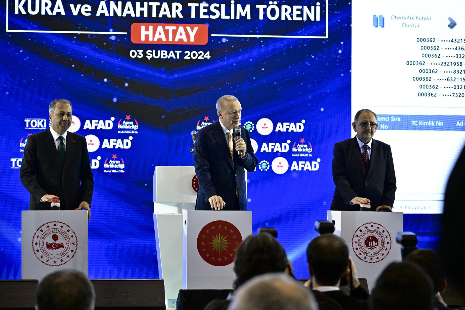 “Hatay’daki kura törenimizle 6.572’si il ve ilçe merkezlerimizde, 703’ü kırsalda olmak üzere ilk etapta toplam 7.275 konutu hak sahiplerine teslim ettik.