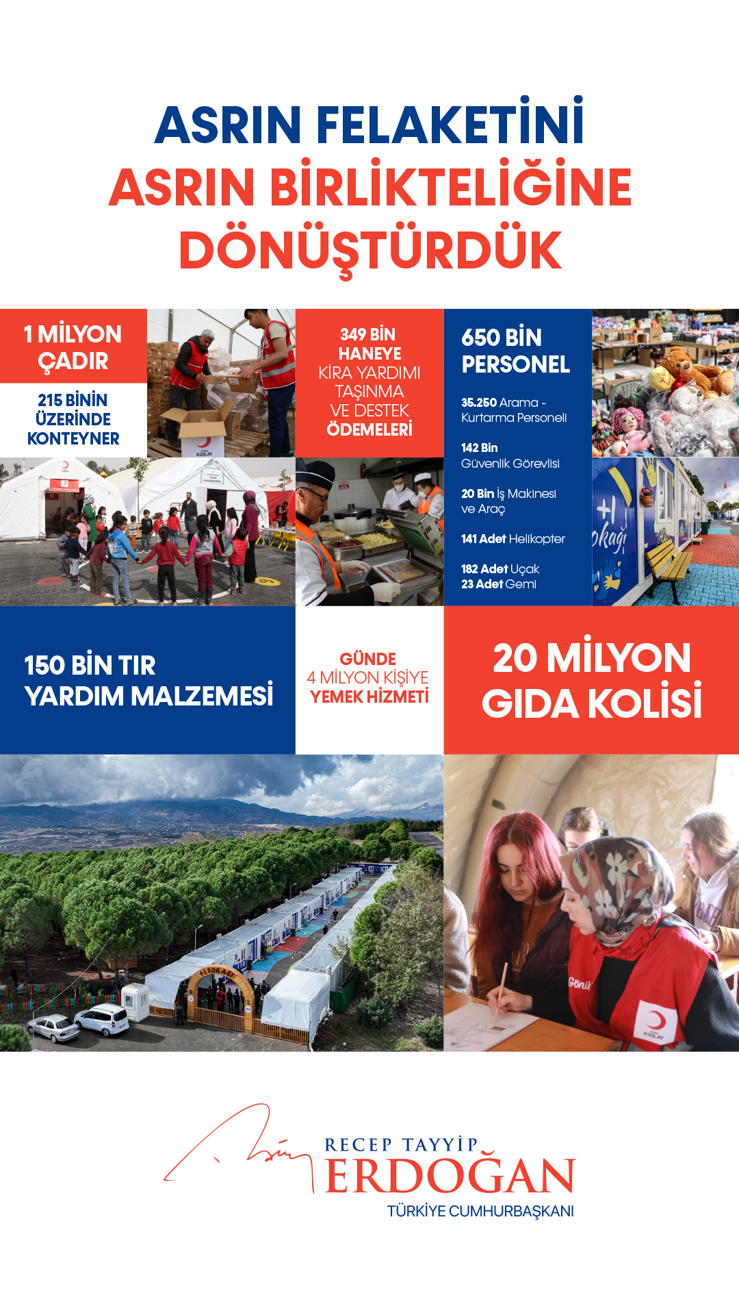 "Deprem bölgesi geneline 150 bin tır yardım malzemesi gönderilirken 20 milyon gıda kolisi dağıtıldı. Günde 4 milyon kişiye yemek hizmeti sunuldu. Esasen bu afet bir yönüyle de dünyanın en büyük arama-kurtarma ve iyileştirme operasyonudur. Yine afet sonrası hem enkaz kaldırma hem yeniden inşa çalışmalarının en hızlı yürütüldüğü bir örneği beraberce yaşadık.