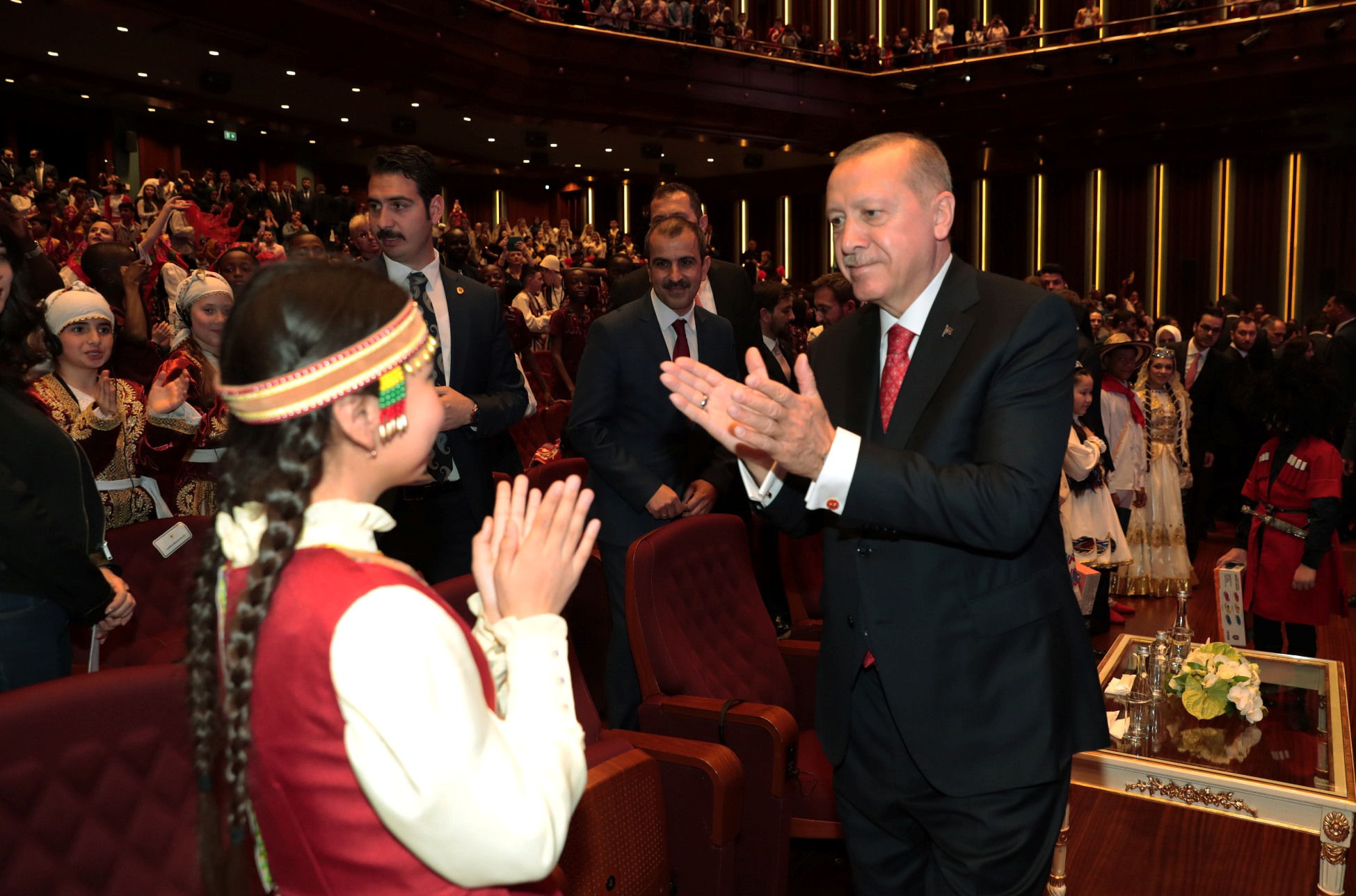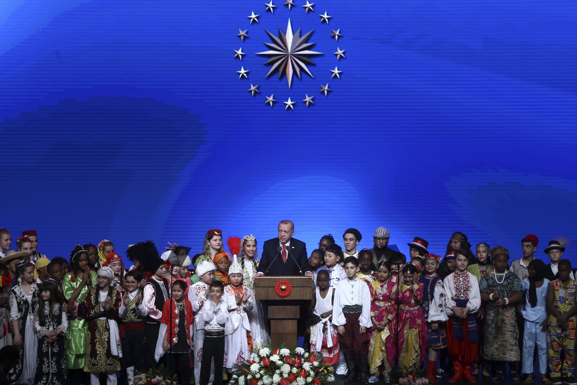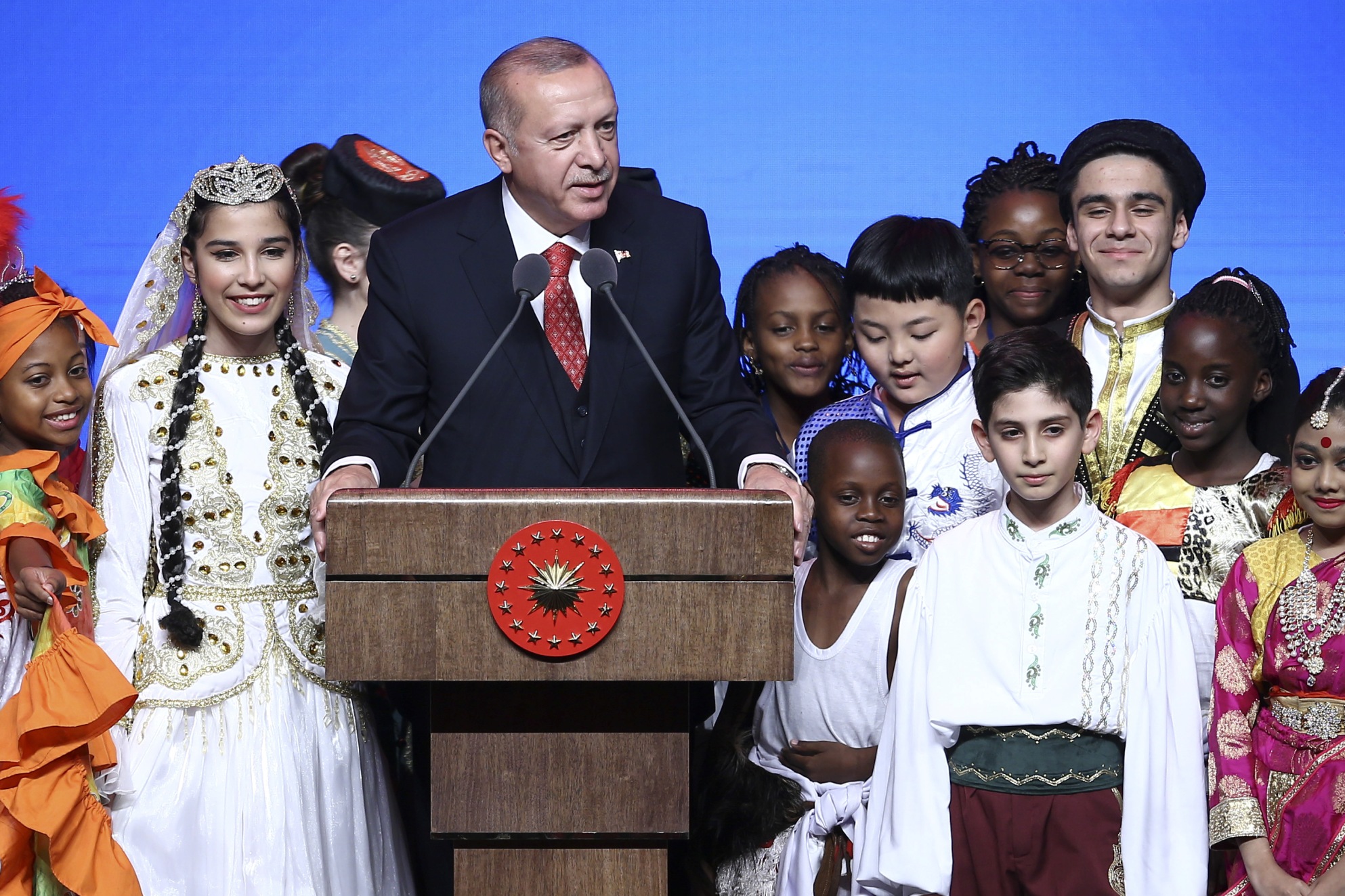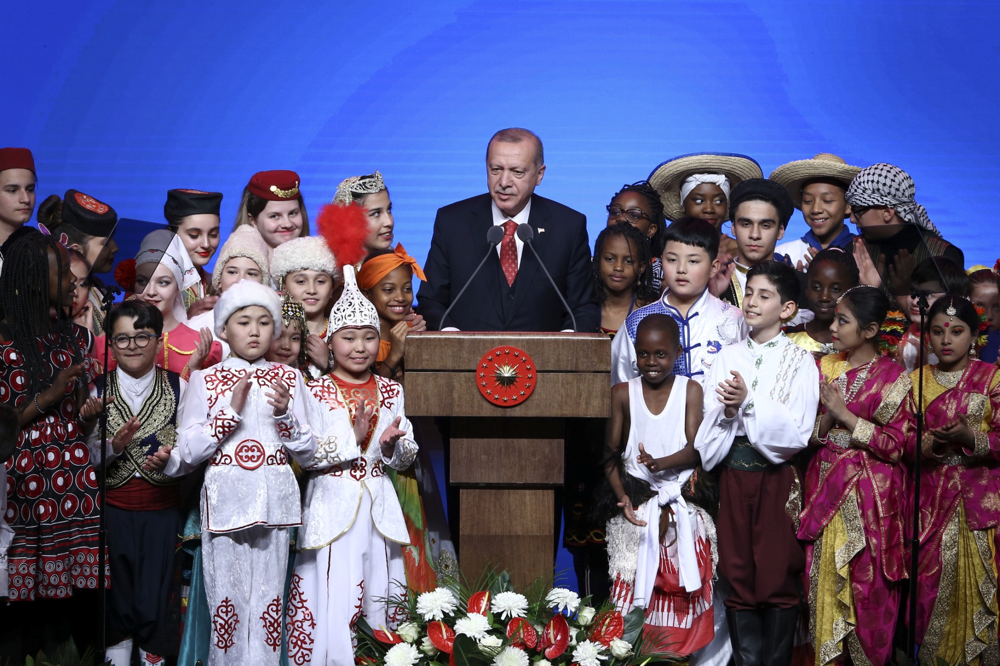 Erdoğan, konuşmasını sürdürürken, gösterilerini sunan çocuklar sahneye geldi. Kendisine "Merhaba" diyen bir çocuğa, "Nasıl gidiyor araba?" karşılığını veren Erdoğan, "Şu anda çok zenginim, zira 40 ülkeden böyle güzel yavrular etrafımızı sarınca fakir olmak mümkün değil, zenginim." ifadesini kullandı.