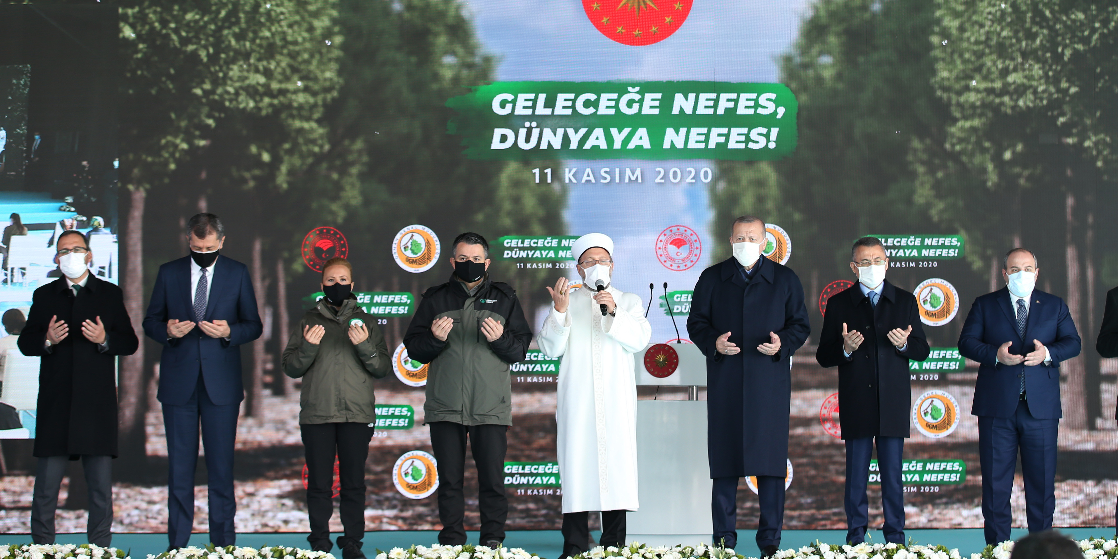 Diyanet İşleri Başkanı Ali Erbaş'ın duasının ardından Cumhurbaşkanı Erdoğan, fidan dikim alanında fidanları toprakla buluşturdu.