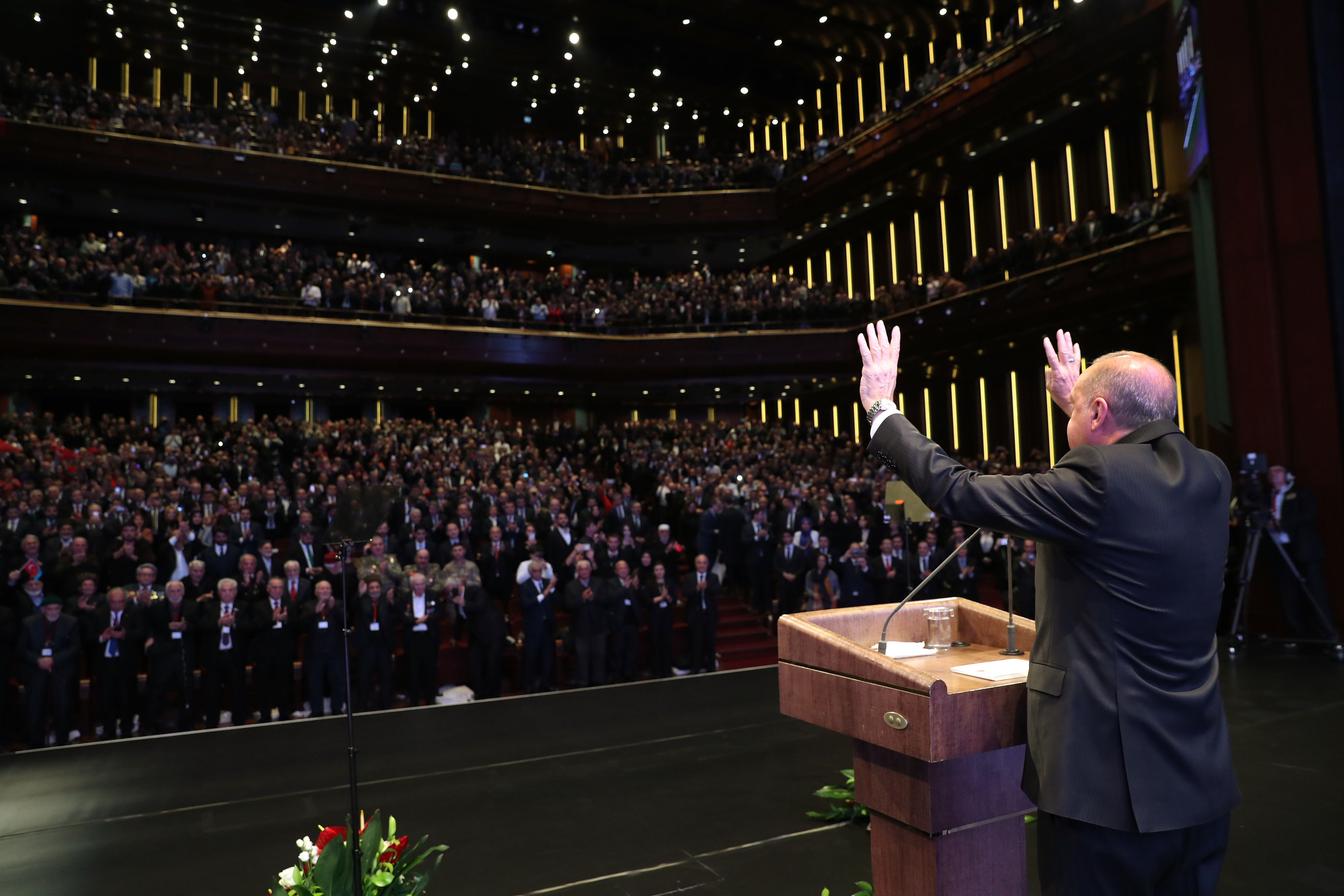 Konuşmasına tüm katılımcıları selamlayarak başlayan Cumhurbaşkanı Erdoğan, "Sizleri Cumhurbaşkanlığı Külliyesi'nde, milletin evinde, bu gazi mekânda misafir etmekten büyük bir bahtiyarlık duyuyorum." diye konuştu.