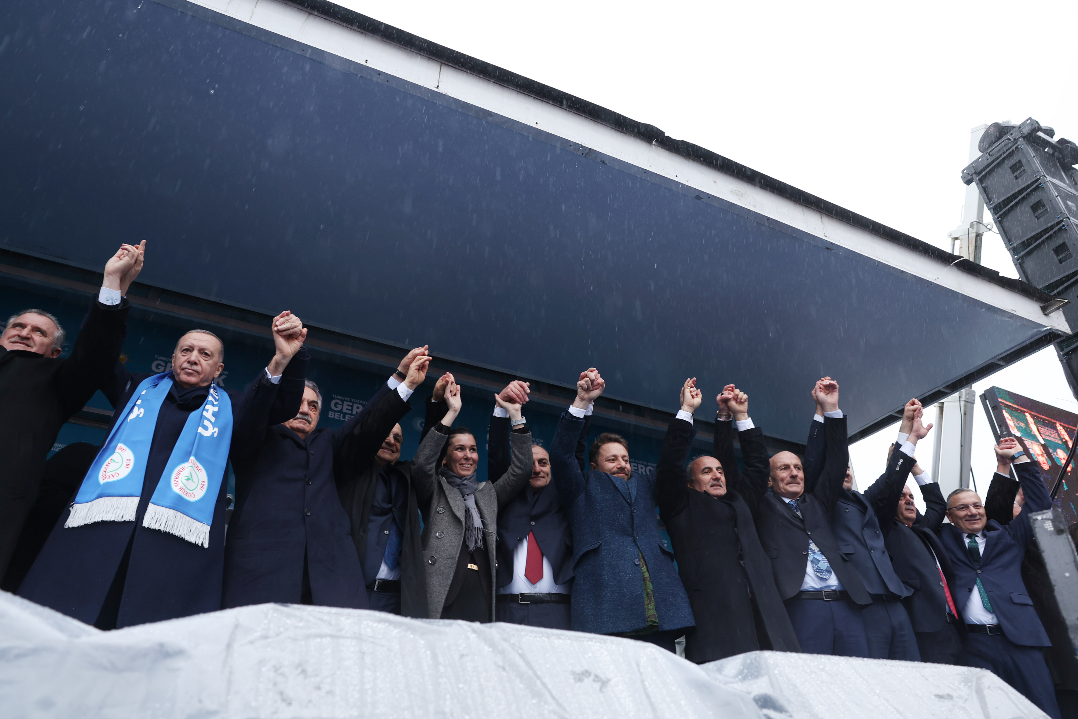 Cumhurbaşkanı Erdoğan'ın konuşmasının ardından, AK Parti Rize ilçe belediye başkan adayları sahneye tek tek çağrılarak vatandaşlara tanıtıldı. Erdoğan, belediye başkan adaylarıyla vatandaşları selamladı.