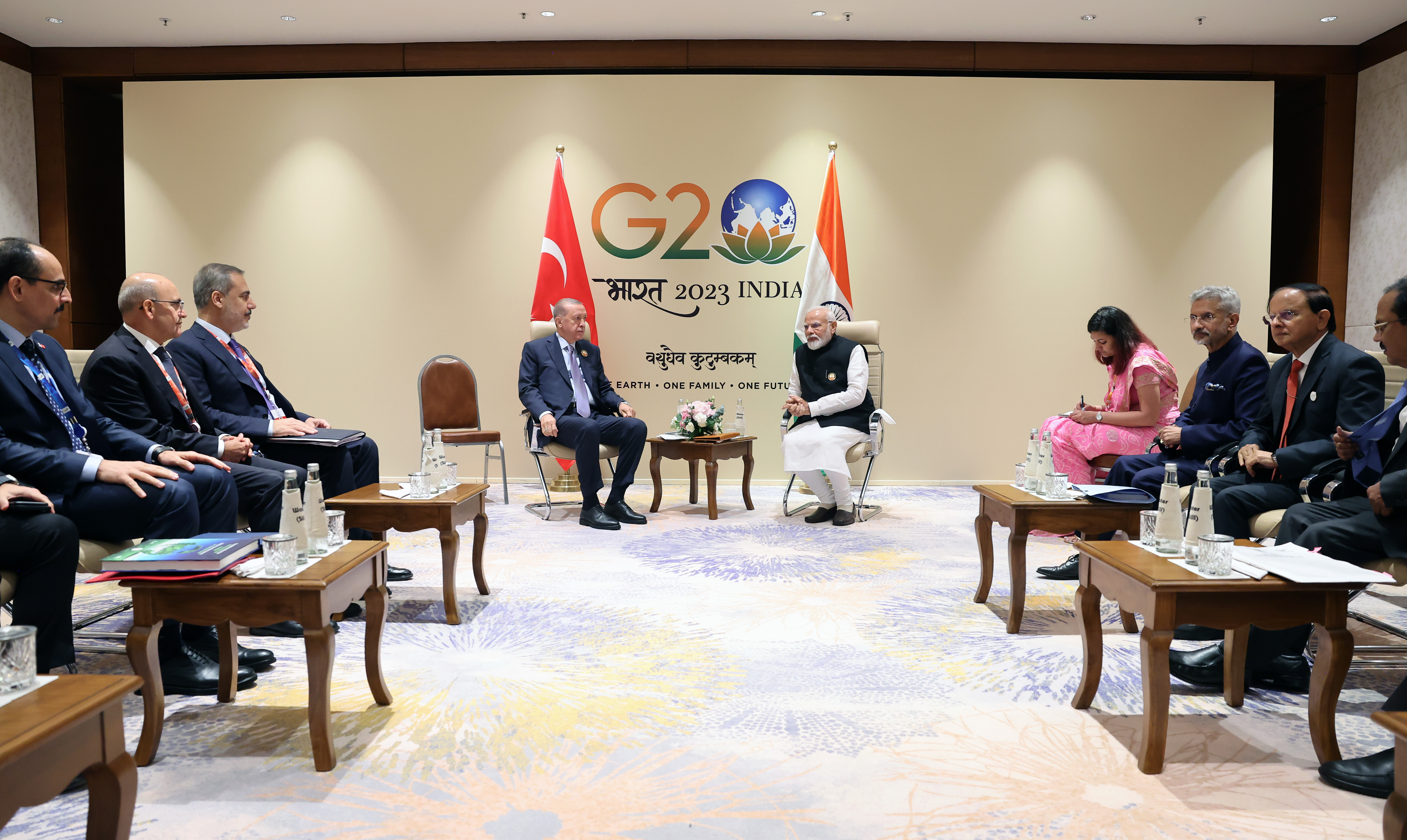 Cumhurbaşkanı Erdoğan, Bharat Mandapam Uluslararası Fuar ve Kongre Merkezi'nde gerçekleştirilen zirvenin ardından Hindistan'ın Başbakanı Narendra Modi ile görüştü.