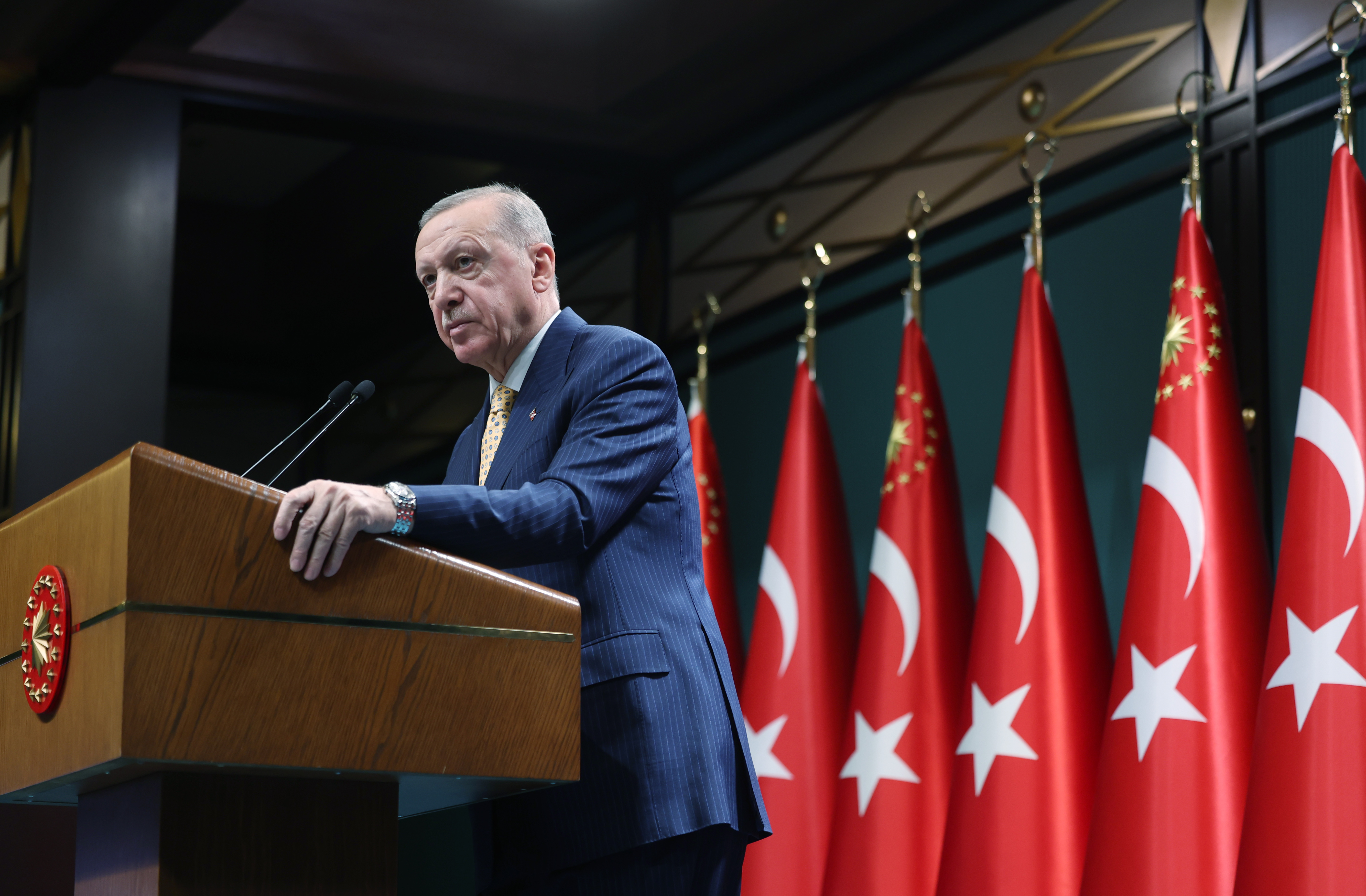 Cumhurbaşkanı Recep Tayyip Erdoğan, Cumhurbaşkanlığı Külliyesi'ndeki Cumhurbaşkanlığı Kabine Toplantısı'nın ardından millete seslendiği konuşmasında, Türkiye'nin, etrafı kan ve ateş çemberi ile çevrili olduğu halde, hedeflerine kararlılıkla ilerlediğine dikkati çekti.