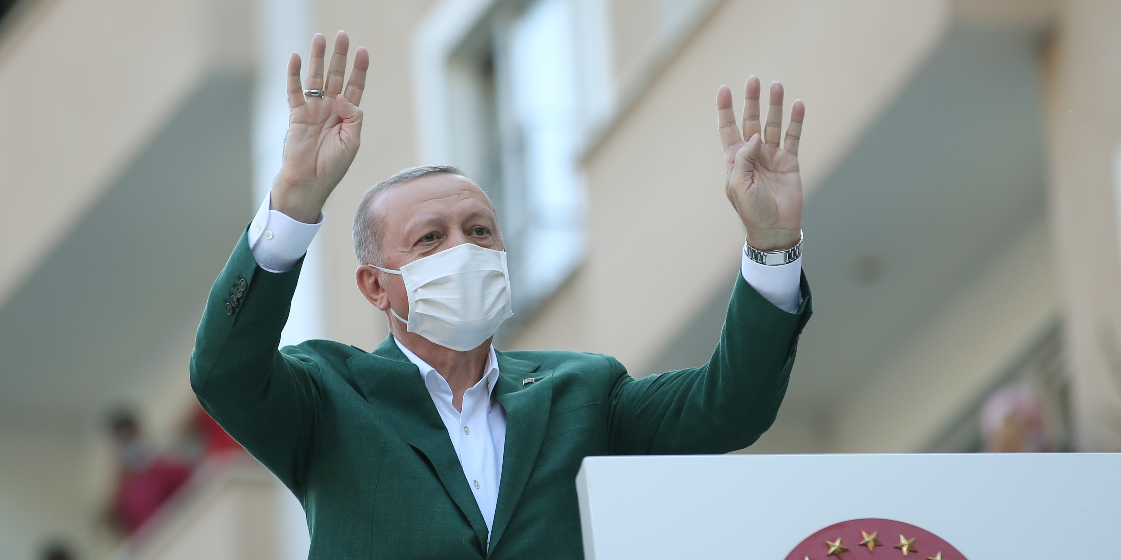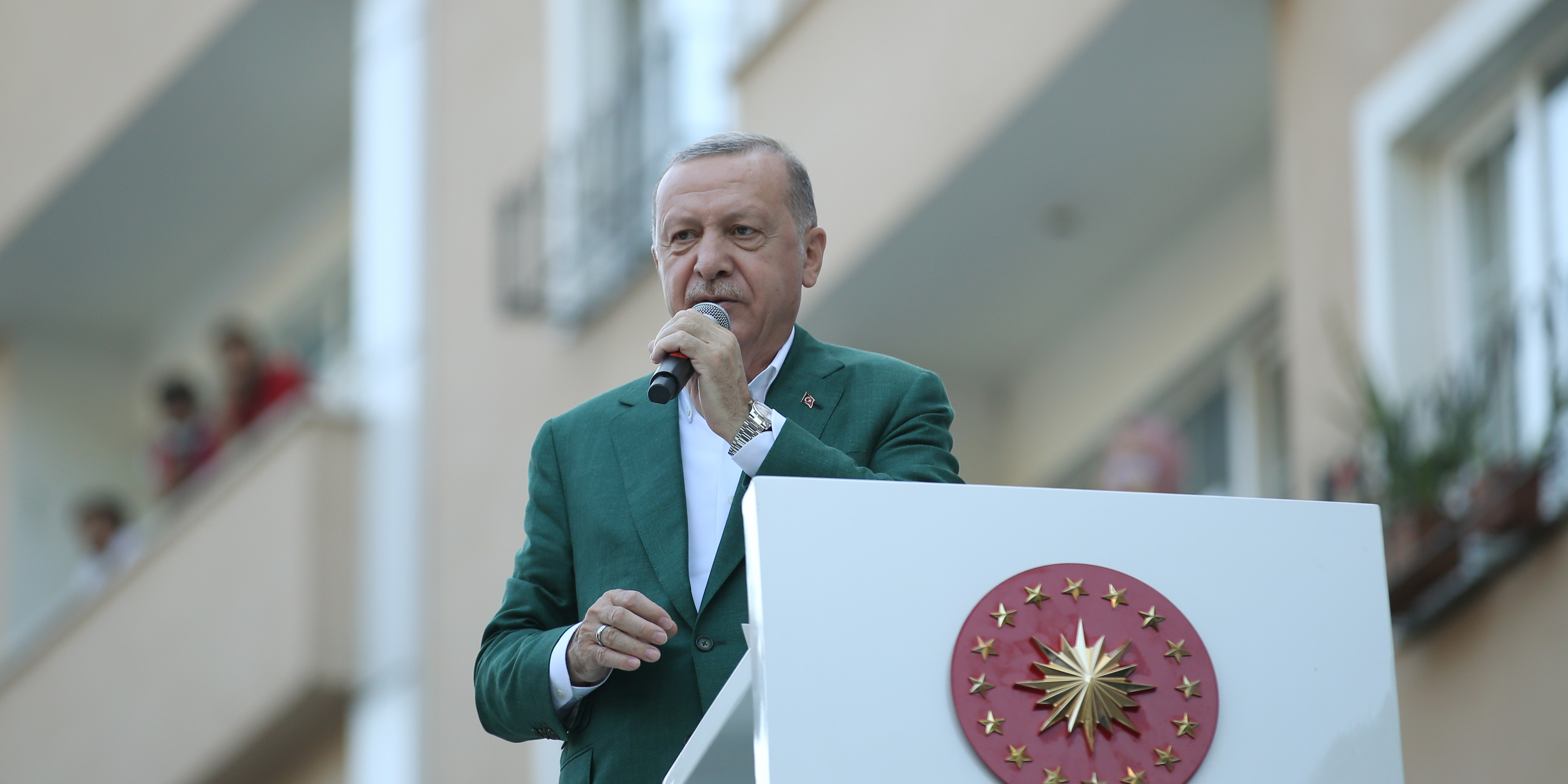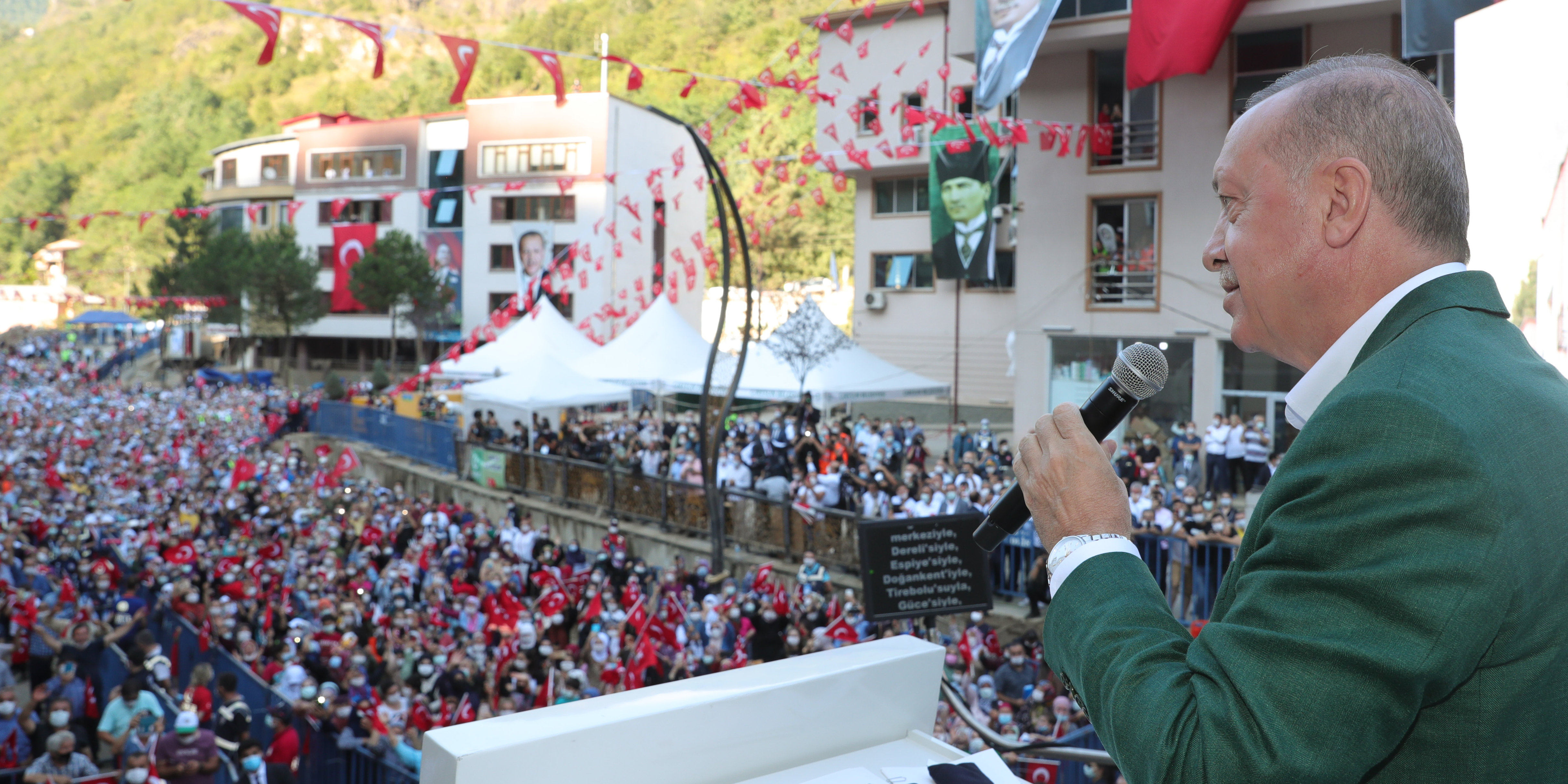 Erdoğan, Giresun'daki sel afetinden zarar gören ilçelerden Dereli'de Belediye binası önünde halka hitap etti.