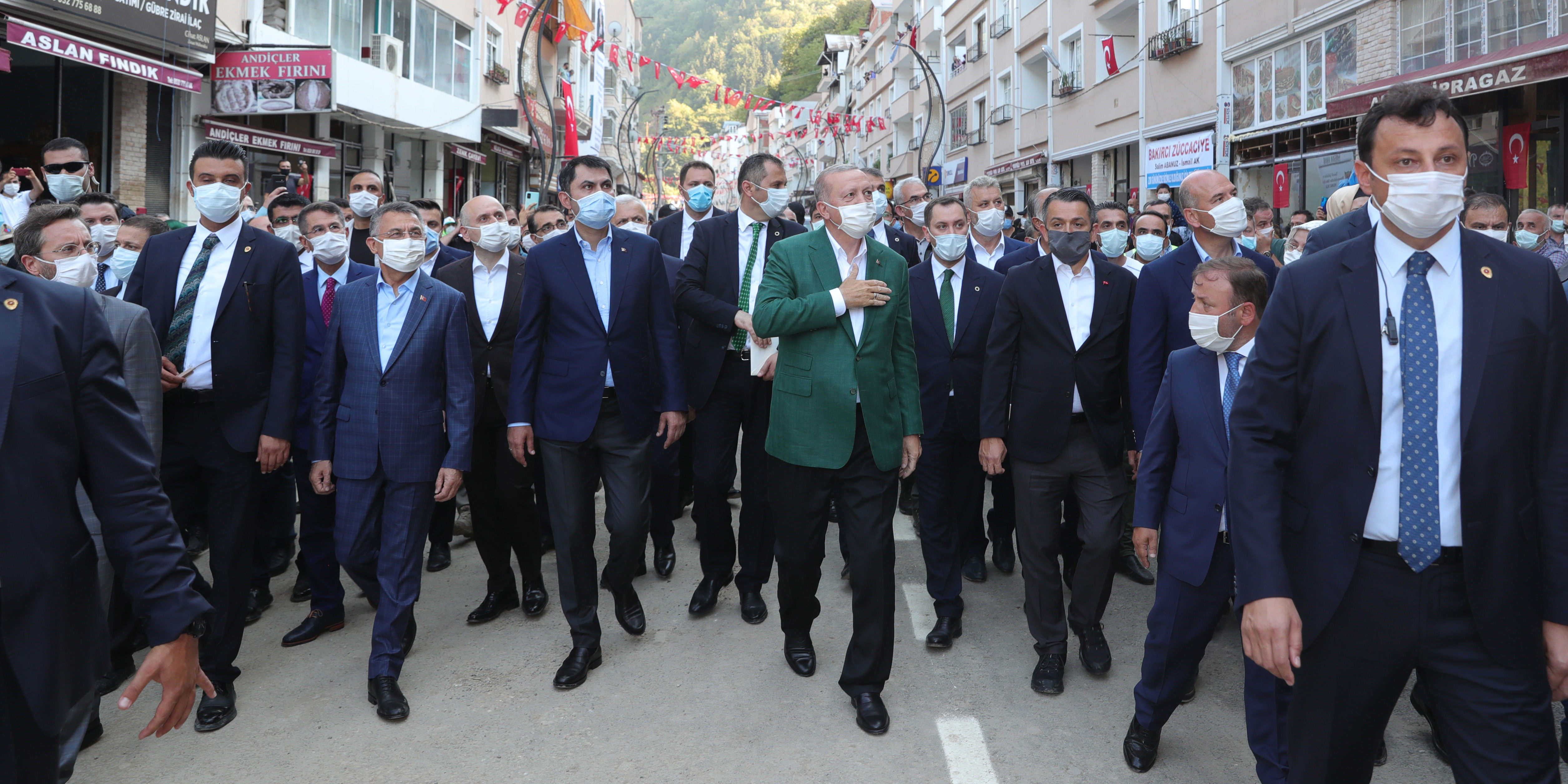 İçişleri Bakanı Süleyman Soylu'nun felaket gününden beri ekibiyle çalışmaları koordine ettiğini, Çevre ve Şehircilik, Tarım ve Orman ile Ulaştırma ve Altyapı başta olmak üzere tüm ilgili bakanların kendi görev alanlarıyla ilgili her hususu yakından takip ettiğini ifade eden Erdoğan, afetin ilk anından itibaren çeşitli kurumların 1264 araç ve 3 bin 672 personel ile çalışmalarda yerini aldığını aktardı.