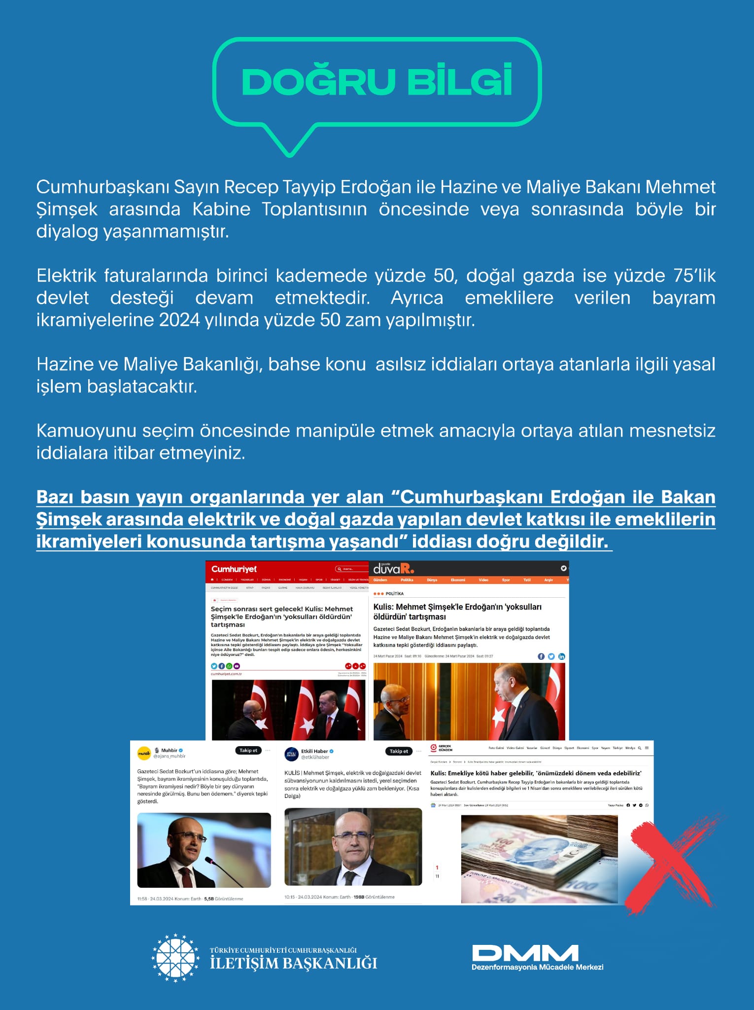 Bazı basın yayın organlarında yer alan “Cumhurbaşkanı Erdoğan ile Bakan Şimşek arasında elektrik ve doğal gazda yapılan devlet katkısı ile emeklilerin ikramiyeleri konusunda tartışma yaşandı” iddiası doğru değildir.