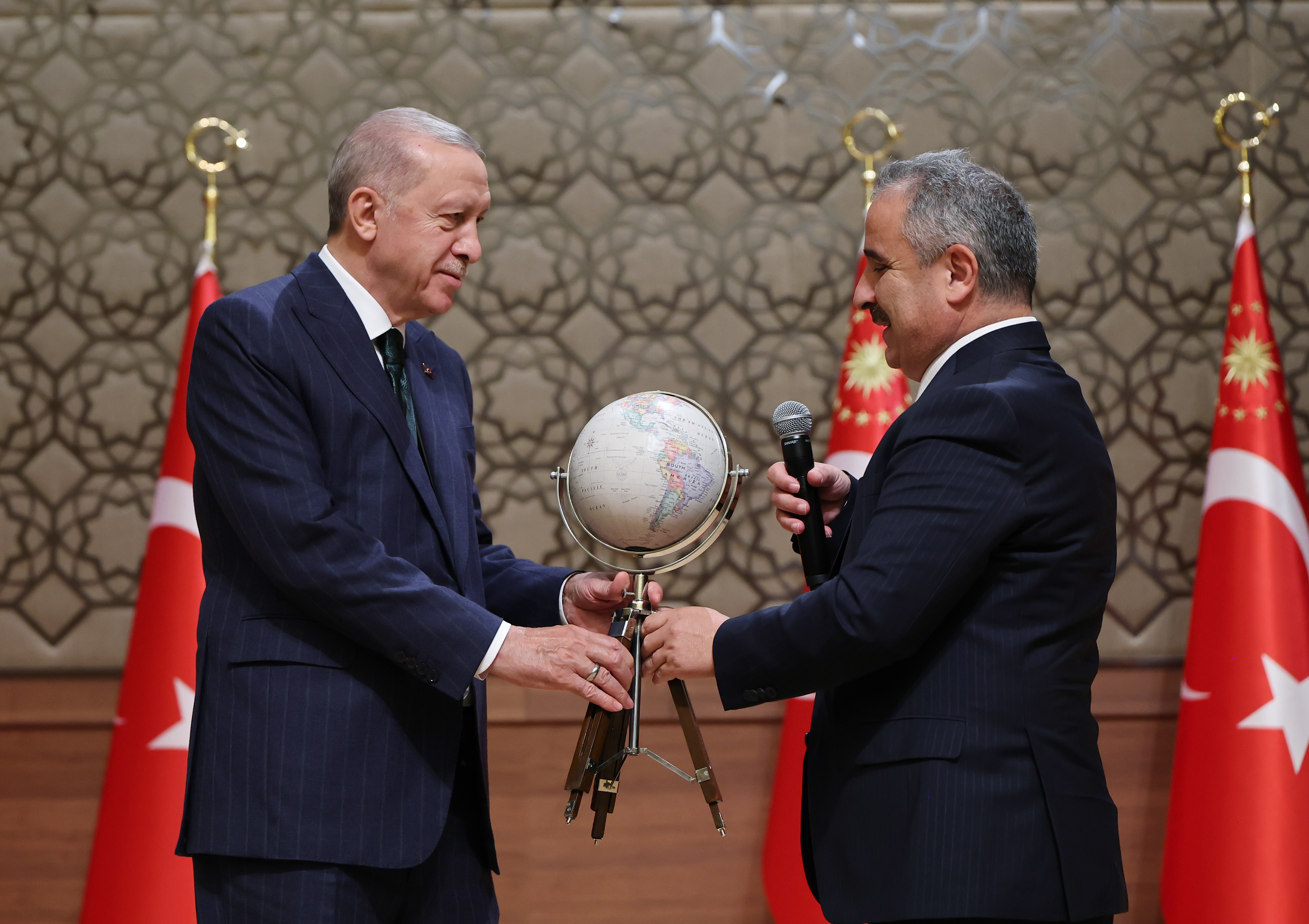 Konuşmalarının ardından, Anadolu Yayıncılar Federasyonu Genel Başkanı Sinan Burhan, "dünyada hakkın sesini duyurduğu için" Cumhurbaşkanı Erdoğan'a dünya küresi hediye etti.