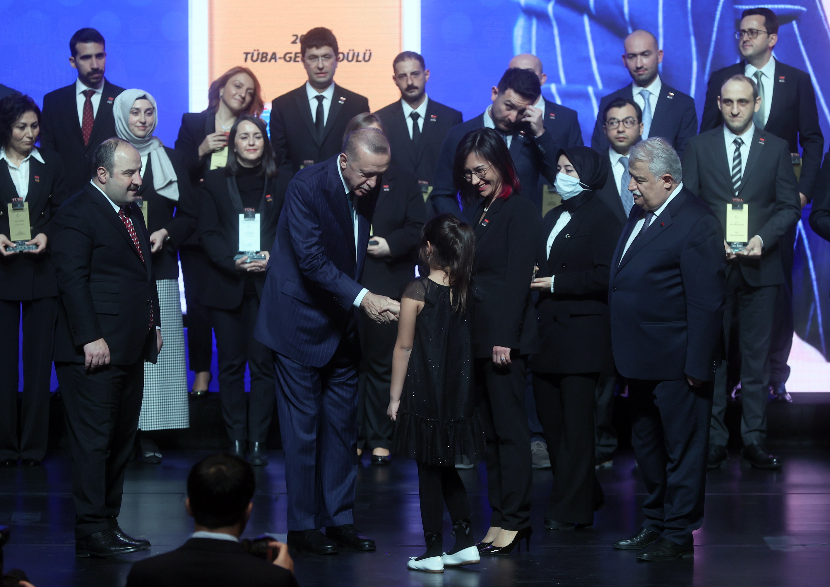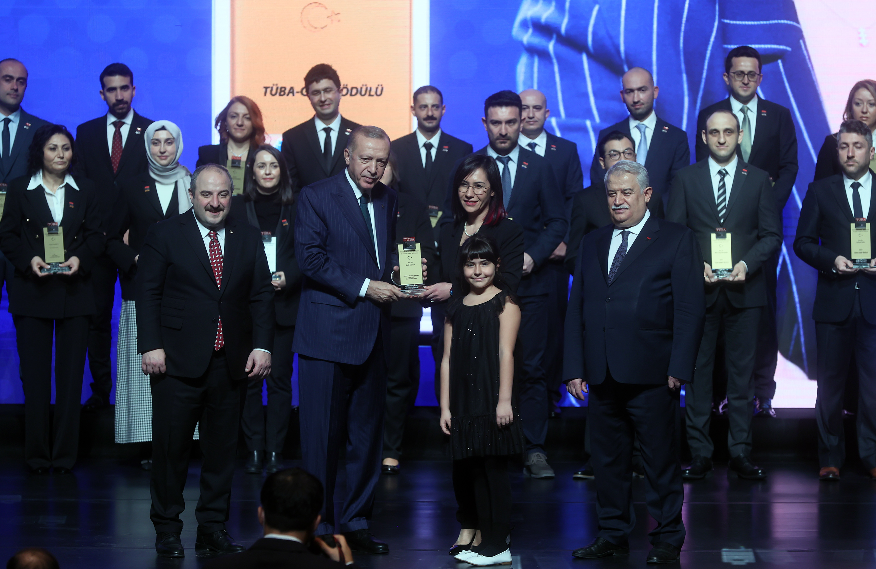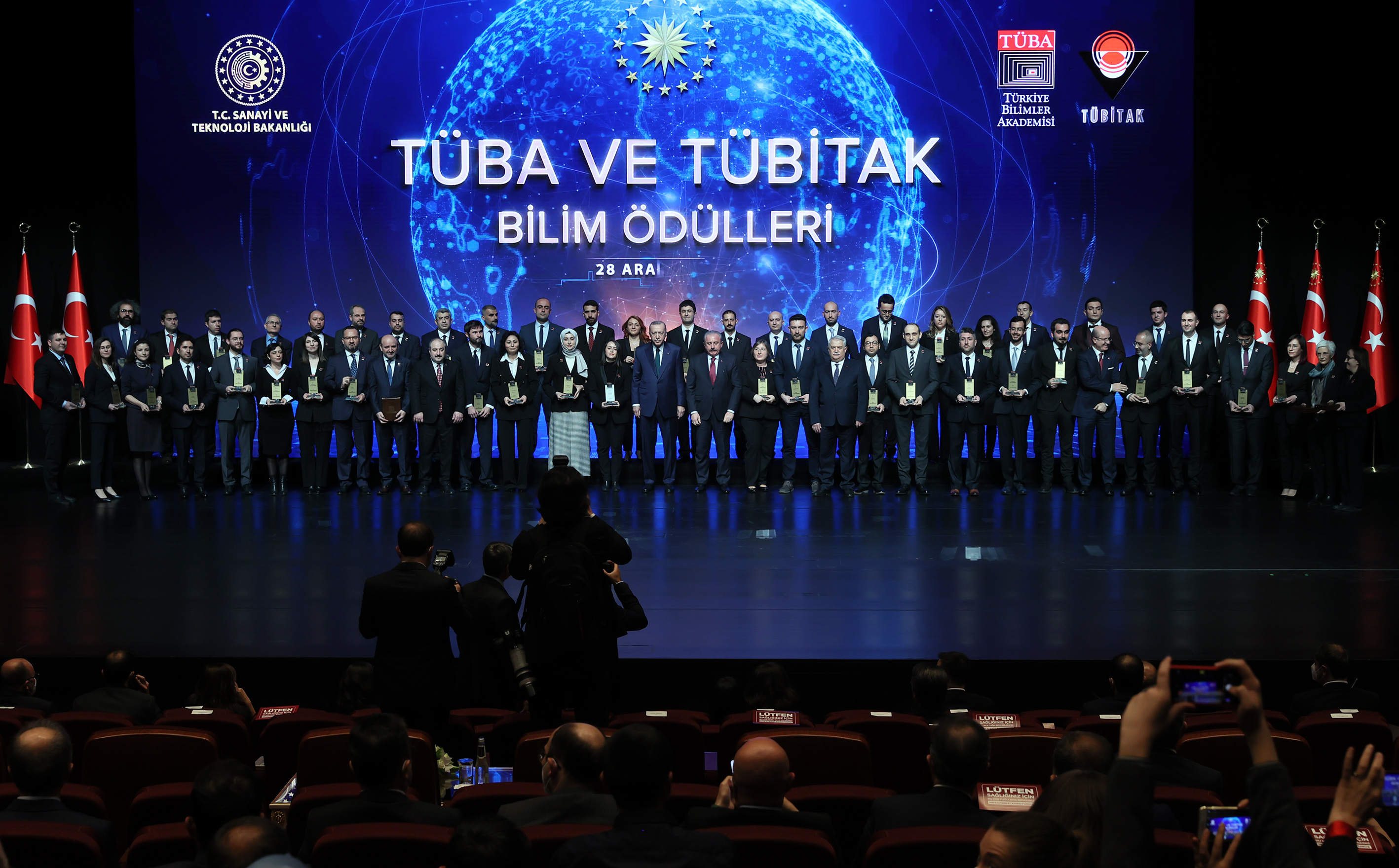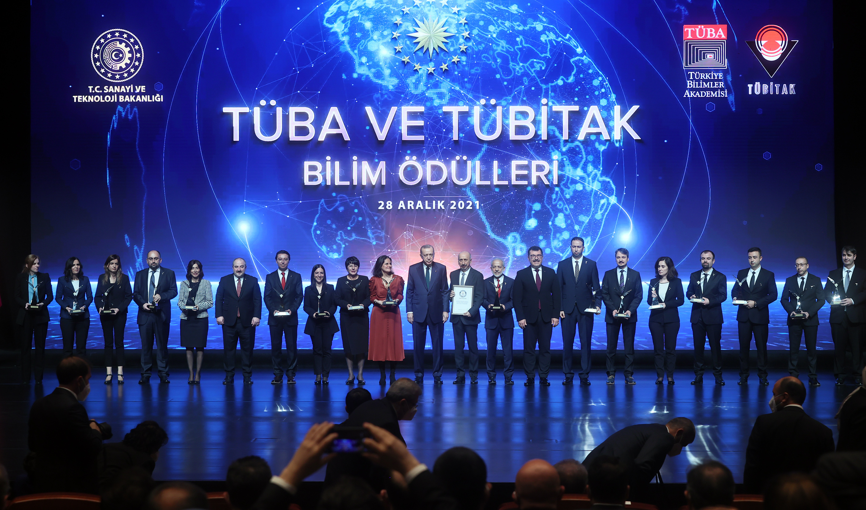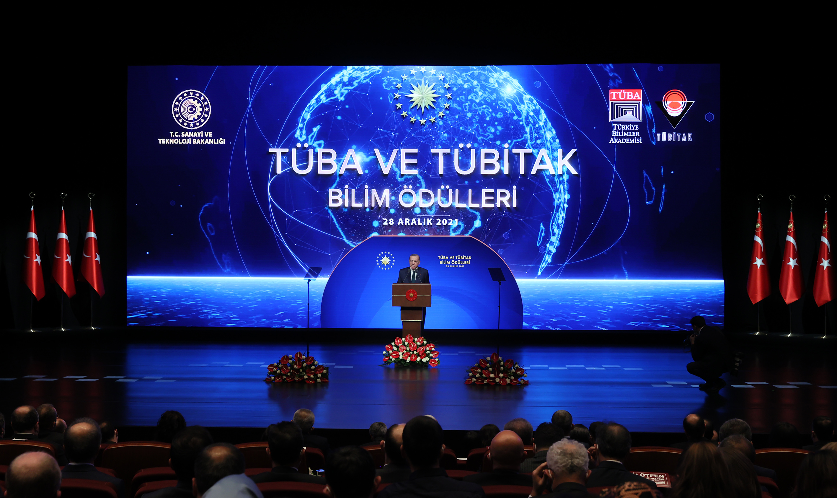 Her yıl TÜBİTAK ve TÜBA Bilim Ödülleri'nin sahipleri ile burada buluşarak artık bir geleneği iyice yerleştirdiklerini belirten Cumhurbaşkanı Erdoğan, araştırmaları ile dünyaya yön veren, hayatı kolaylaştıran, Türkiye'nin müreffeh yarınları için gecesini gündüzüne katan tüm bilim insanlarına şükranlarını sundu.